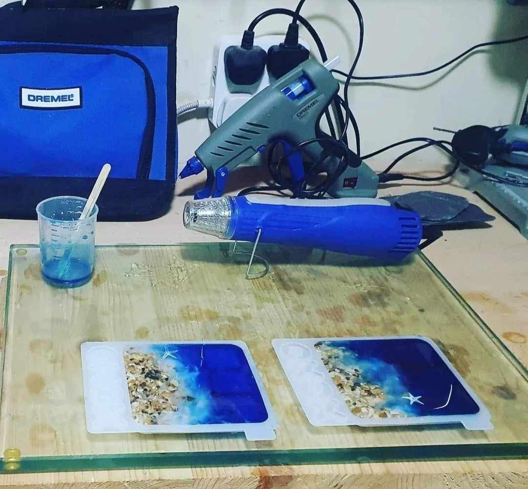 that showcase the natural beauty of the ocean by encapsulating crushed shells, sand, beach pottery or seaglass into the resin.
