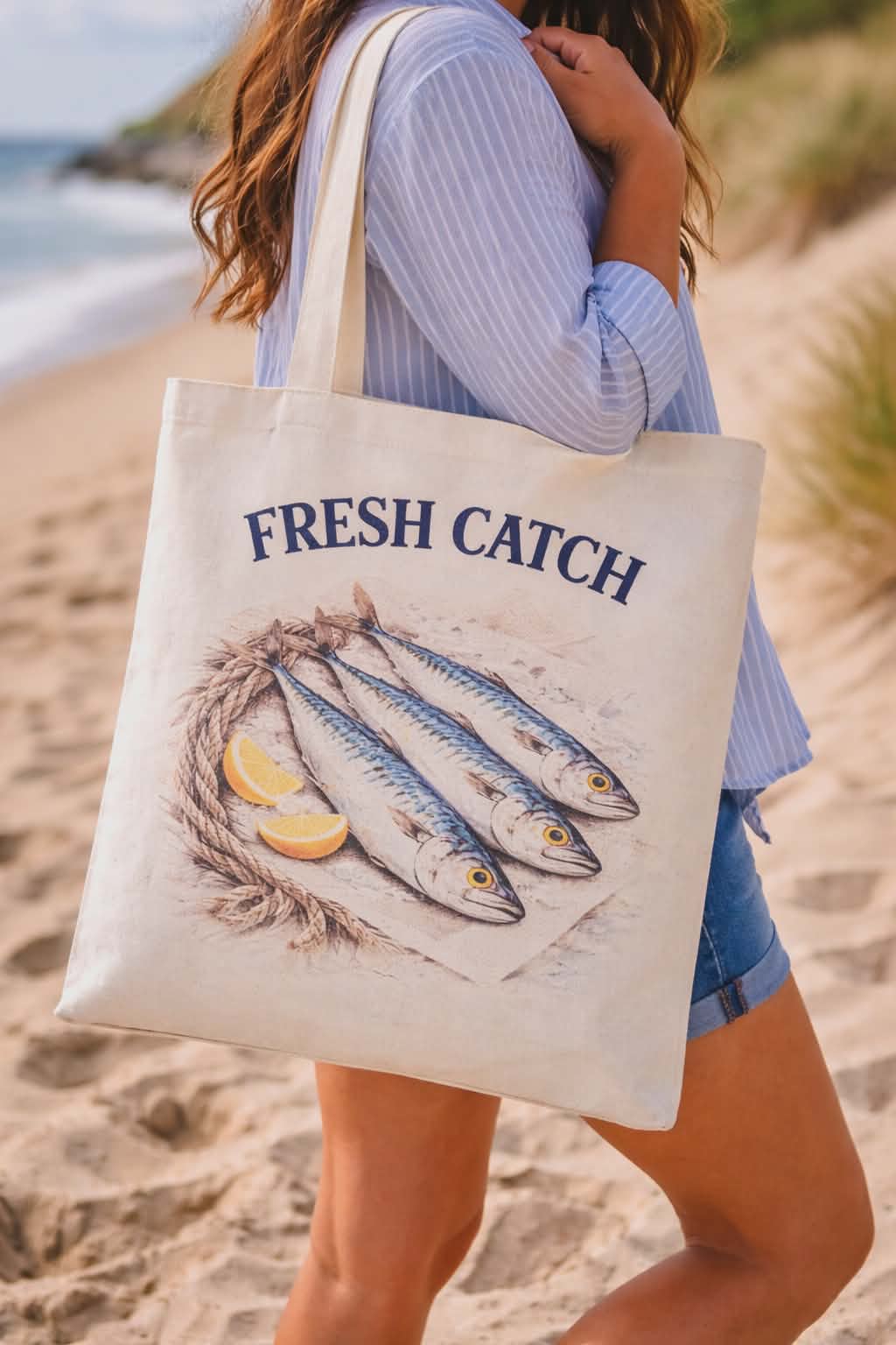 Inspired by traditional seaside fish markets and the growing fisherman aesthetic trend, this unique tote bag features a vintage-style Fresh Catch design with detailed mackerel resting on newspaper with lemon slices.