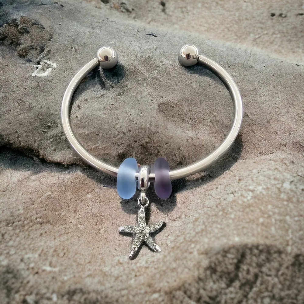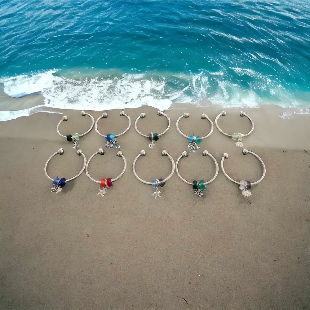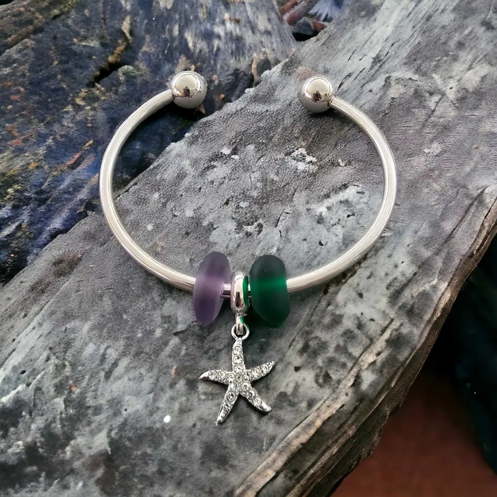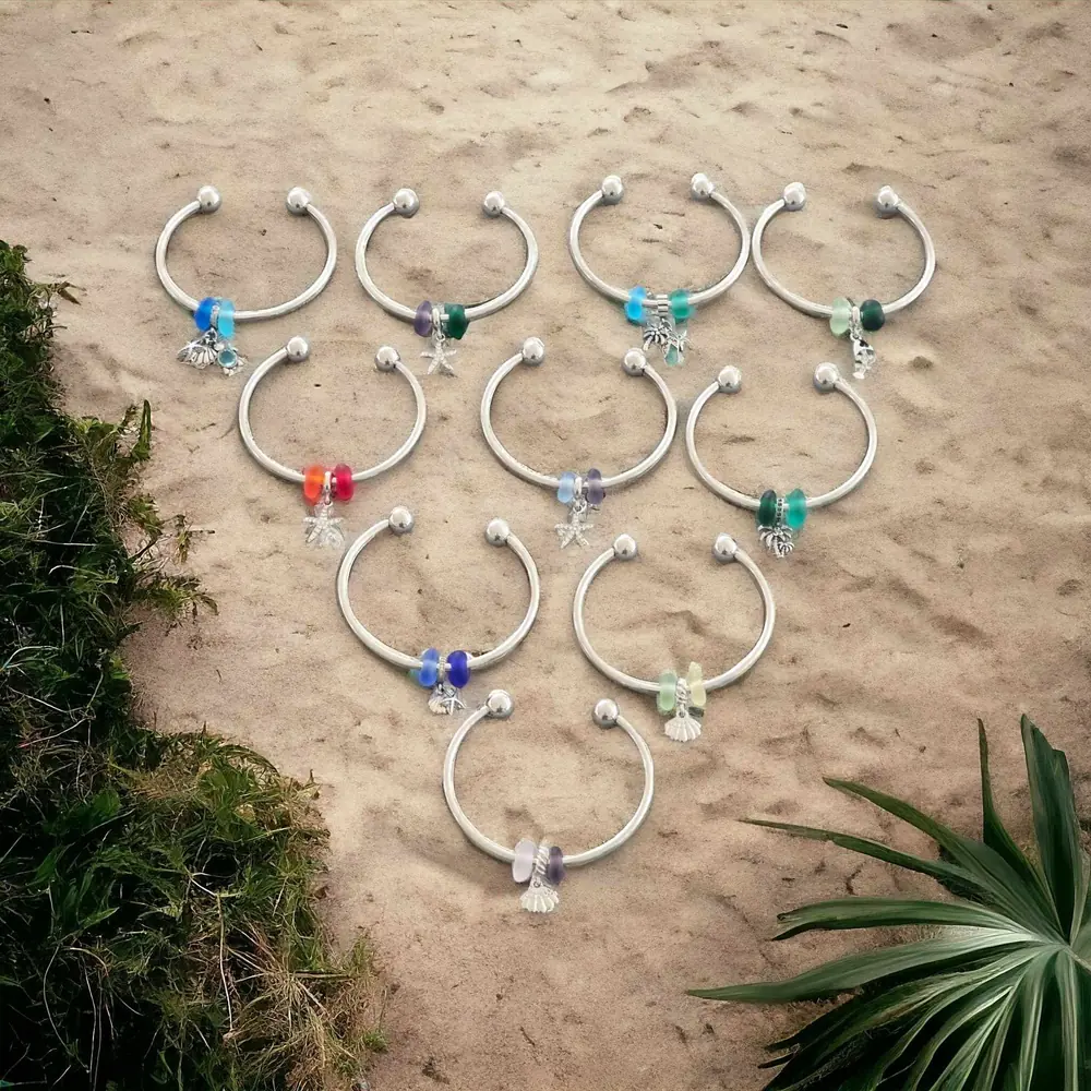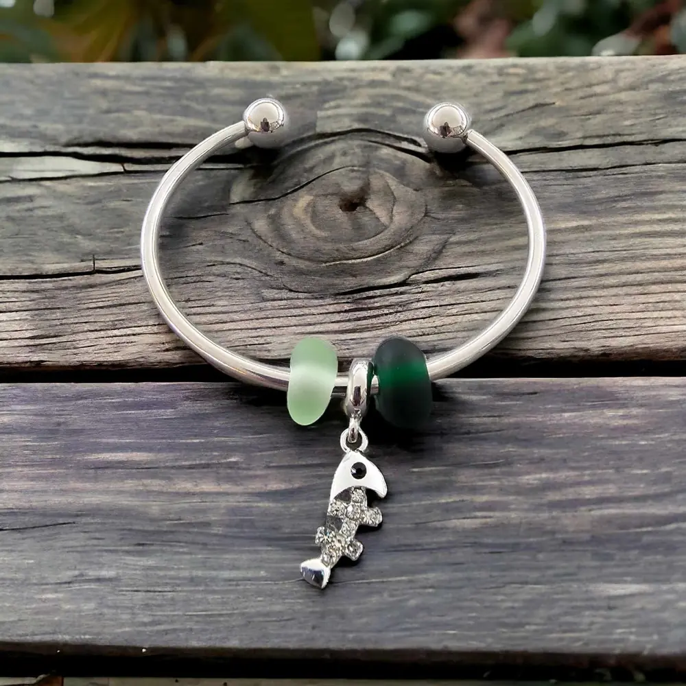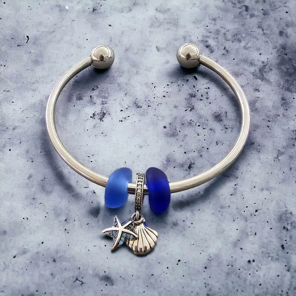 Elevate your style with this exquisite stainless steel bangle adorned with hand-drilled sea glass charm beads. Each bead is a unique piece of coastal beauty, adding a touch of the ocean to your accessory collection. The sea life spacer enhances the marine theme, making this bangle a perfect blend of elegance and natural allure. Embrace the tranquility of the sea wherever you go with this stunning and one-of-a-kind piece.
