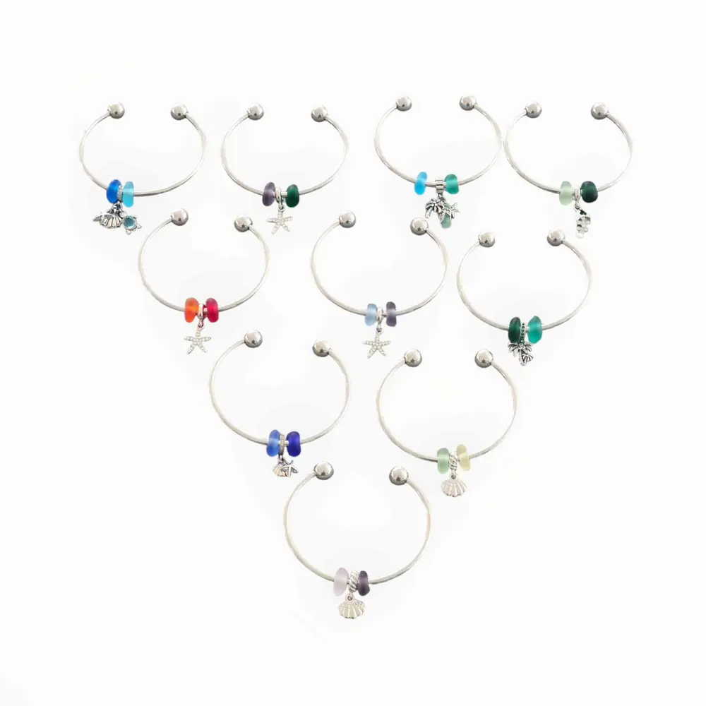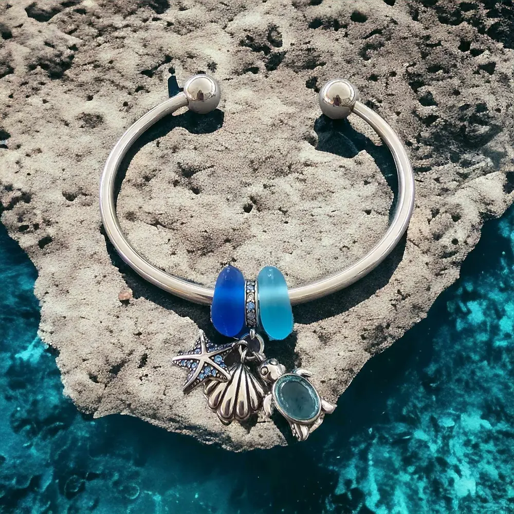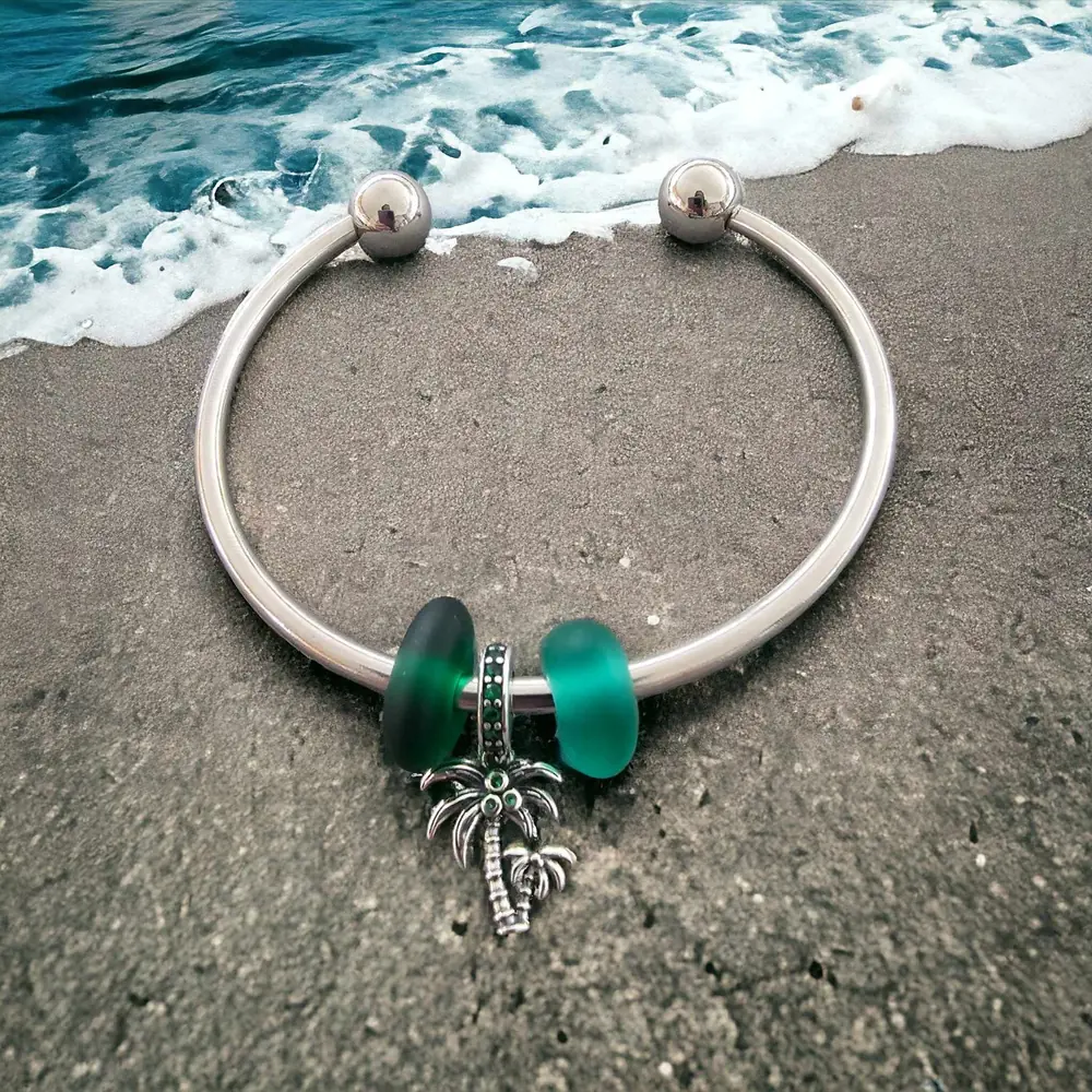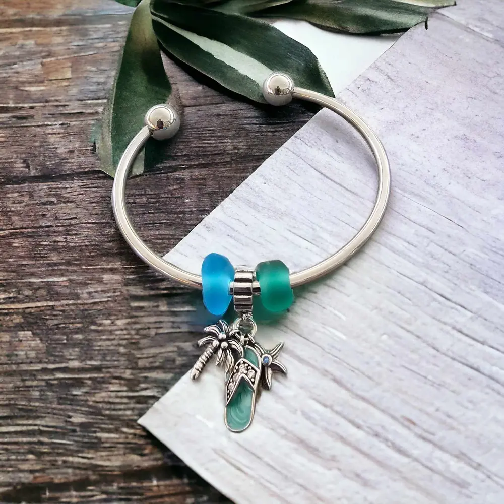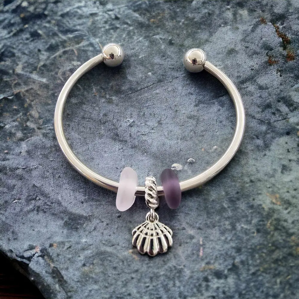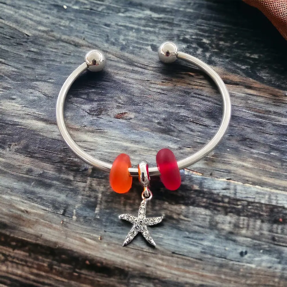 Elevate your style with this exquisite stainless steel bangle adorned with hand-drilled sea glass charm beads. Each bead is a unique piece of coastal beauty, adding a touch of the ocean to your accessory collection. The sea life spacer enhances the marine theme, making this bangle a perfect blend of elegance and natural allure. Embrace the tranquility of the sea wherever you go with this stunning and one-of-a-kind piece.