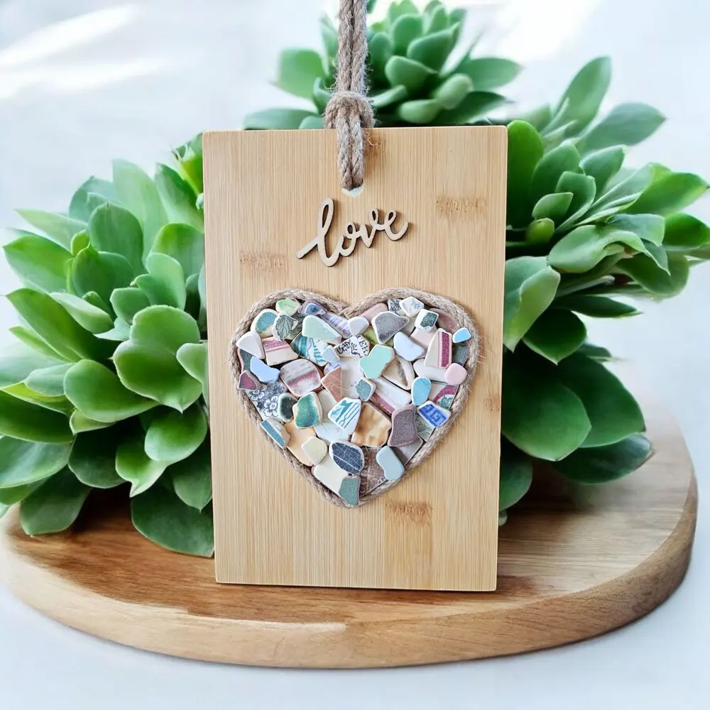 Add a touch of seaside magic to your home with this unique, handcrafted Beach Pottery Love Heart Wall Hanging. Made with care and creativity, this beautiful piece is crafted from sustainable materials, including a bamboo board, hand-picked beachcombed pottery shards from the Kent Coast, and finished with natural hemp rope for a rustic yet elegant touch.