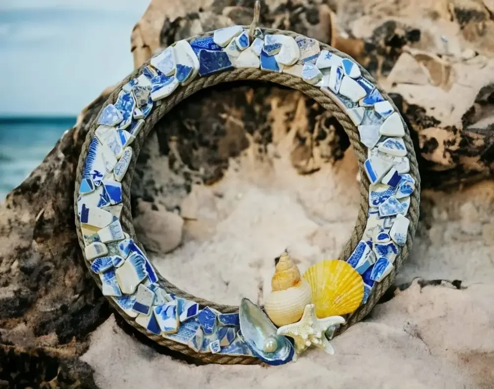 Note: Due to the handmade nature of this product, slight variations may occur, ensuring each wreath is one-of-a-kind. Embrace the beauty of the coast with our Vintage Style Beach Pottery Wreath.