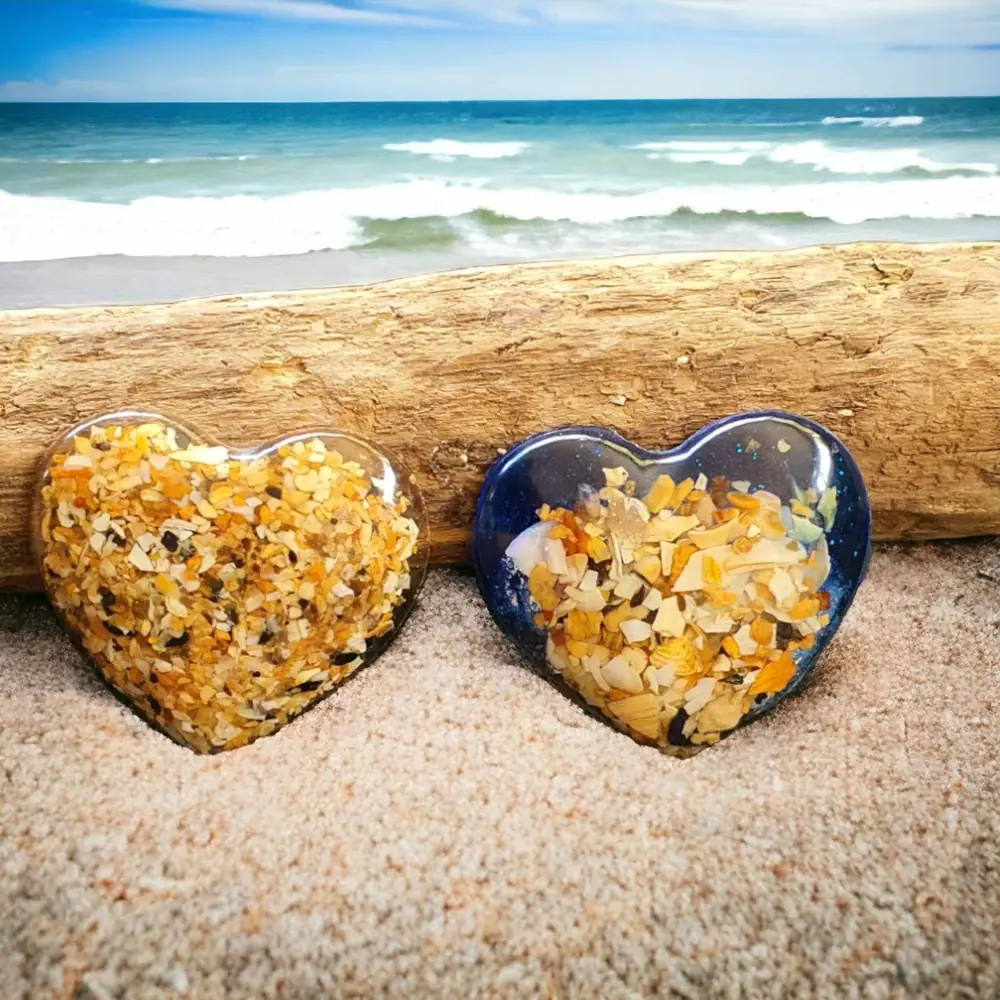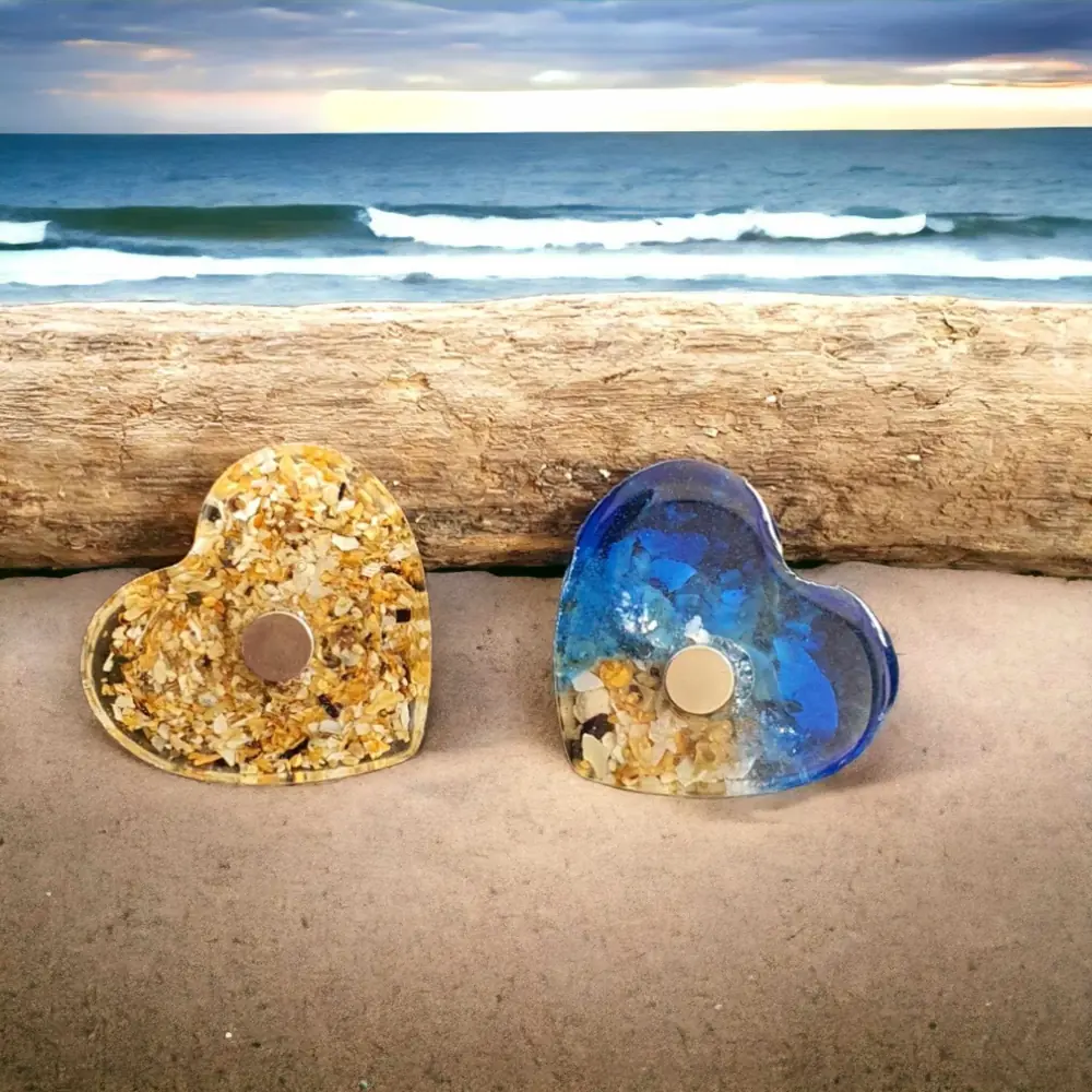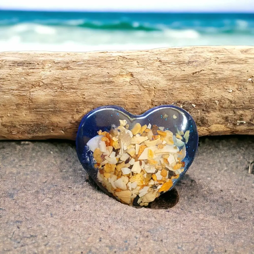 Beach Themed heart shaped fridge magnet. Handcrafted using resin encapsulated with crushed shells 5cm x 5cm