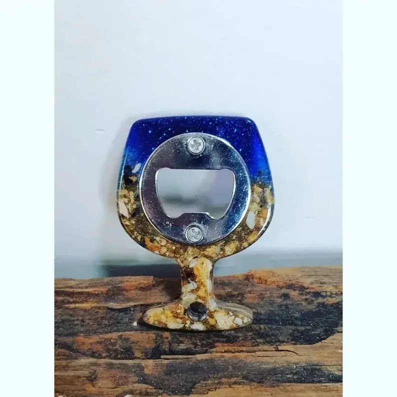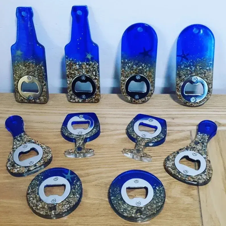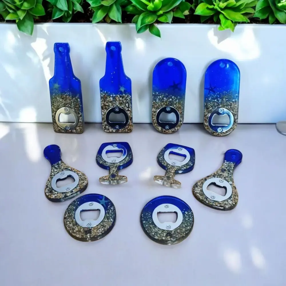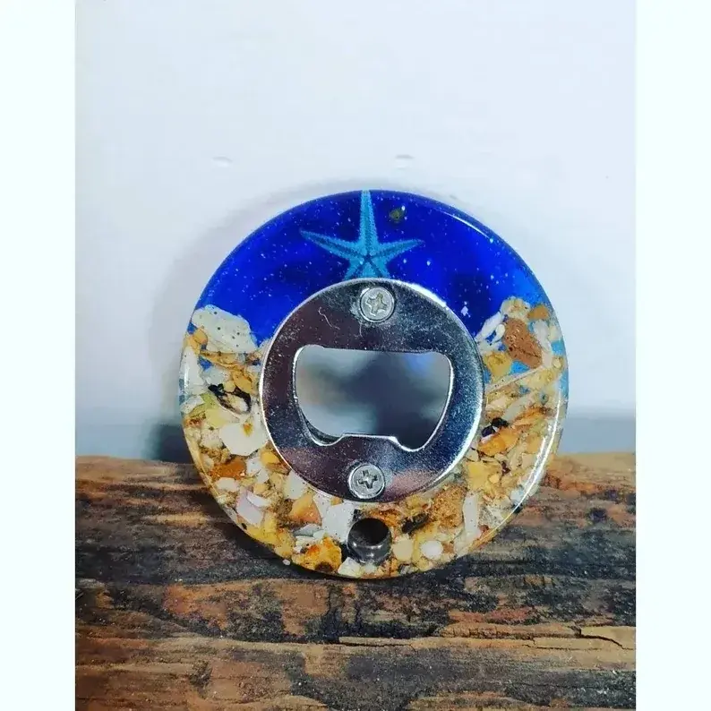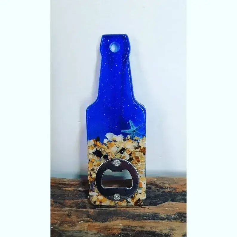 Elevate your beach vibes with our Handcrafted Beach-Themed Resin Bottle Opener. Each opener is meticulously crafted using resin infused with blue dye, glitter, and sand, capturing the essence of the seaside. Please note that the wine glass style does not feature starfish due to its shape. These unique bottle openers are perfect for gifting or as essential accessories for your beach picnics and outings.