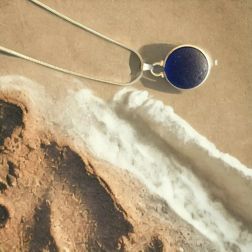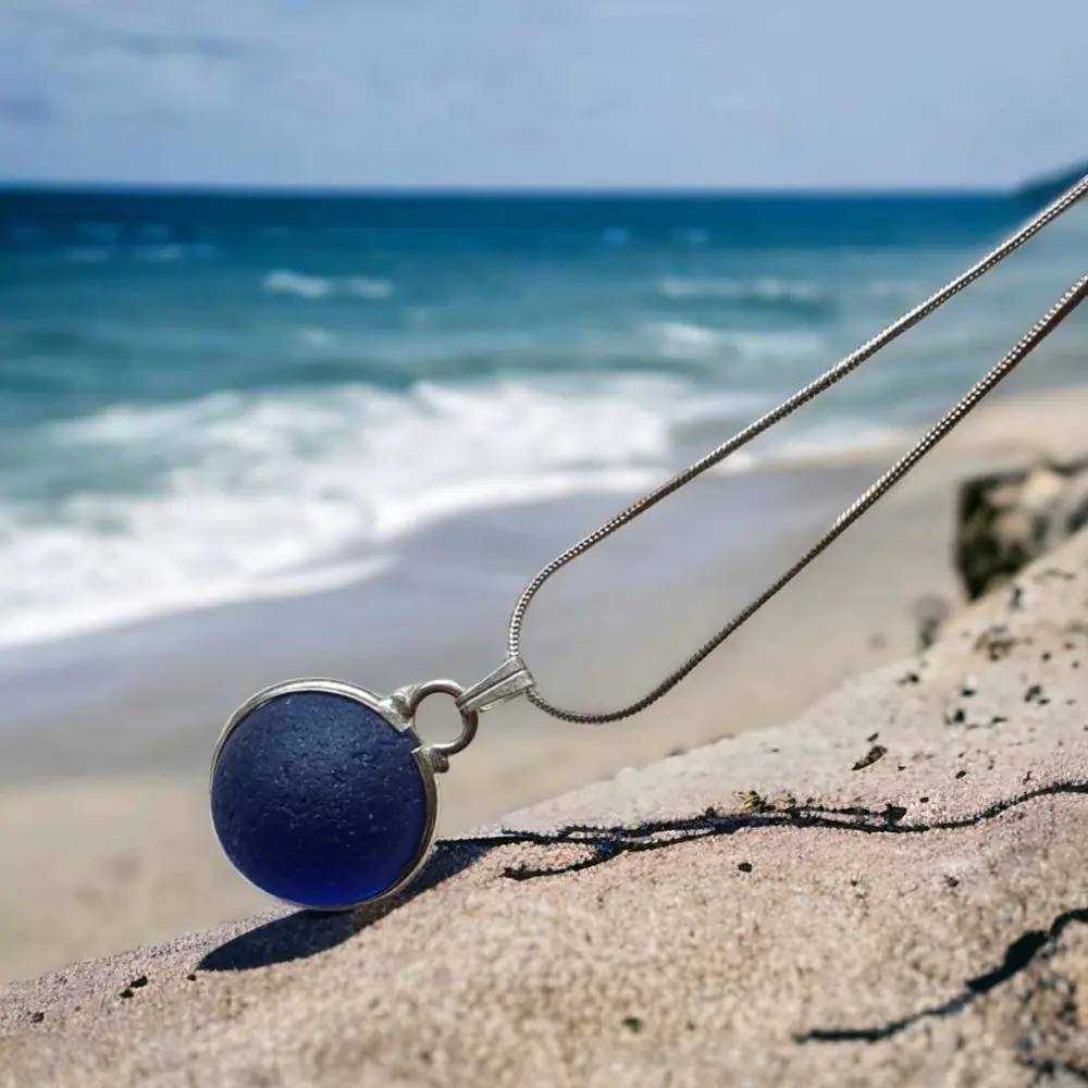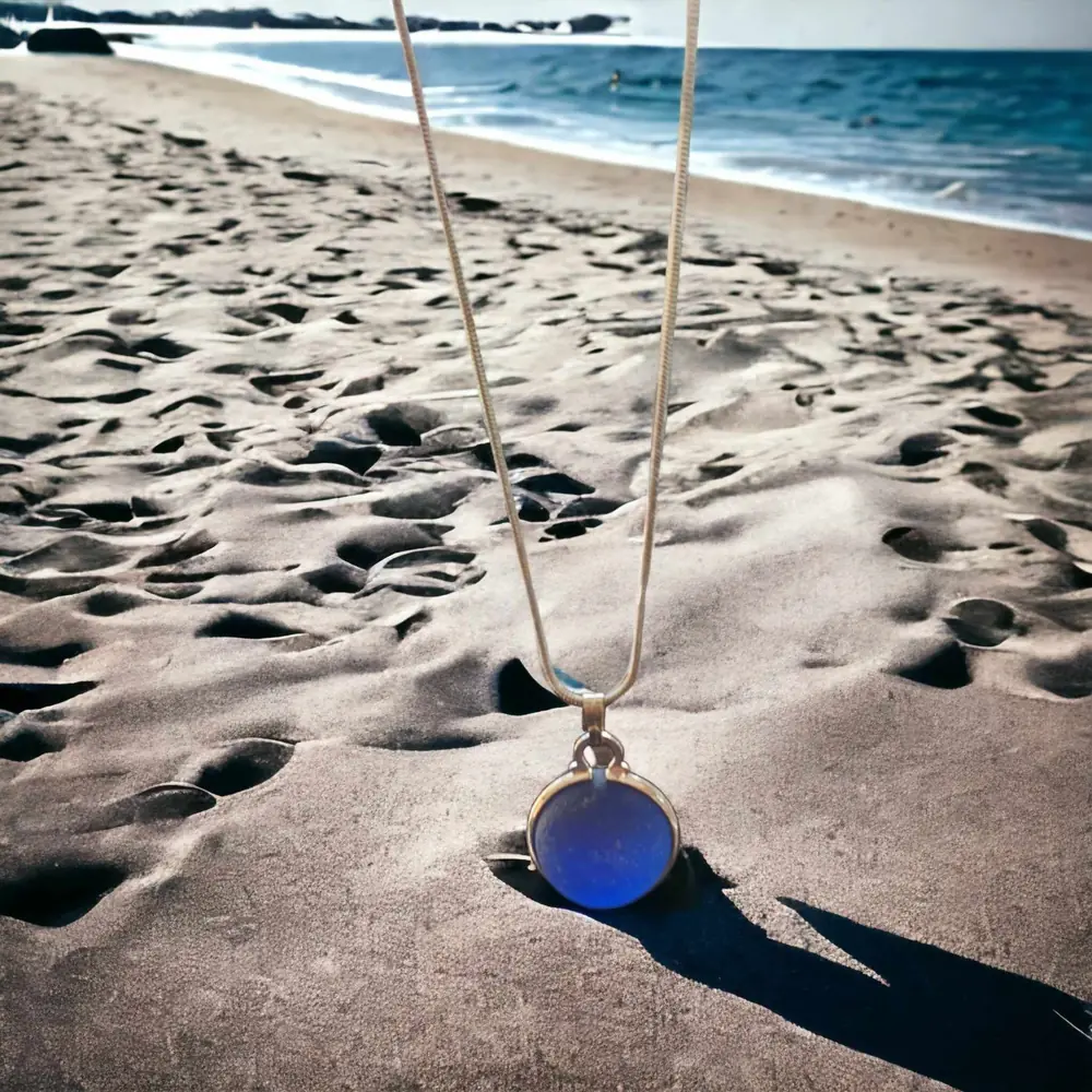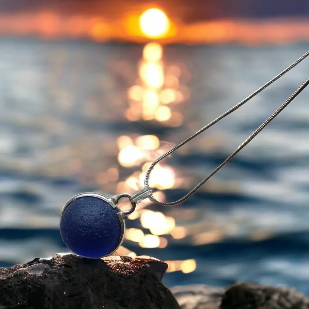 Beachcombed rare blue Sea glass codd marble set into silver plated ring to create this beautiful marble necklace. 20″ Sterling 925 silver chain This will arrive gift boxed