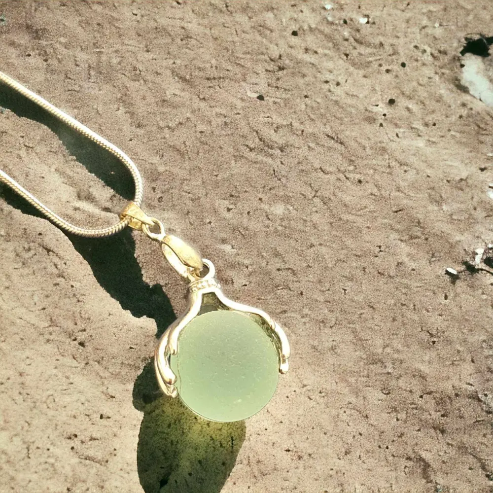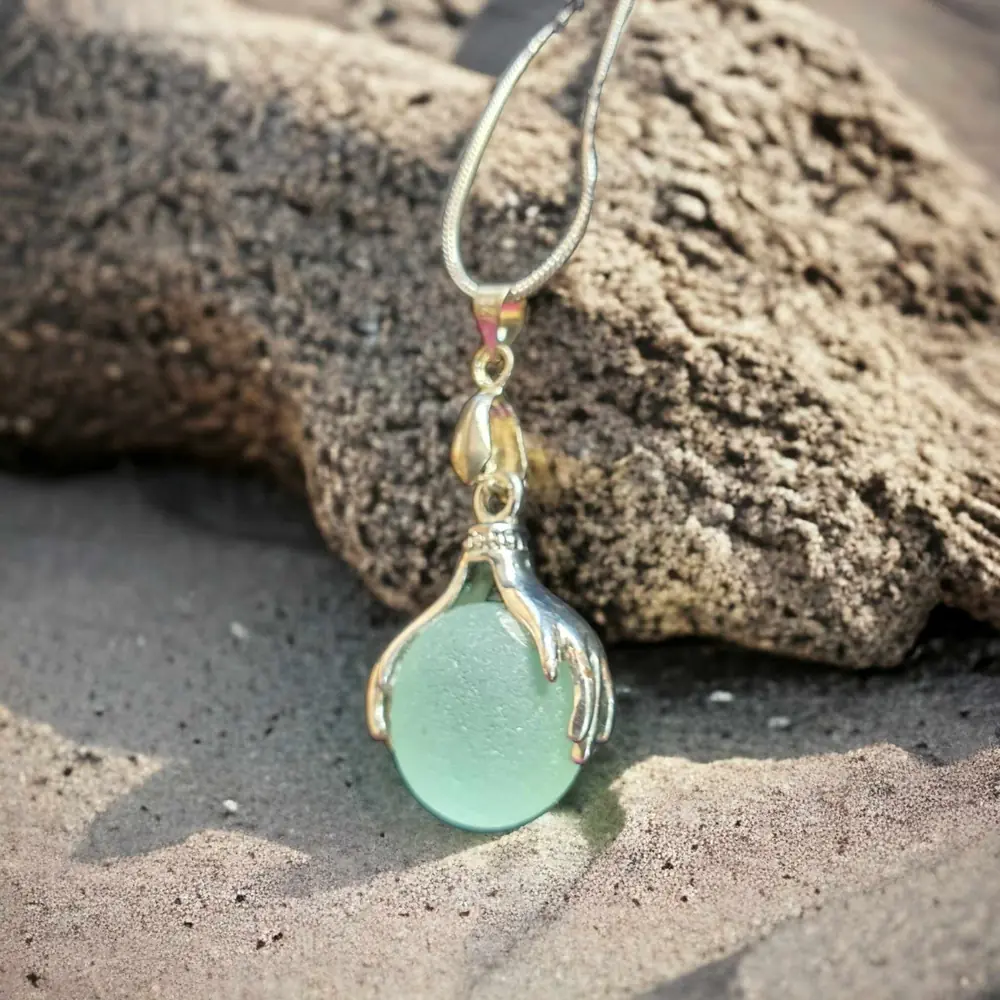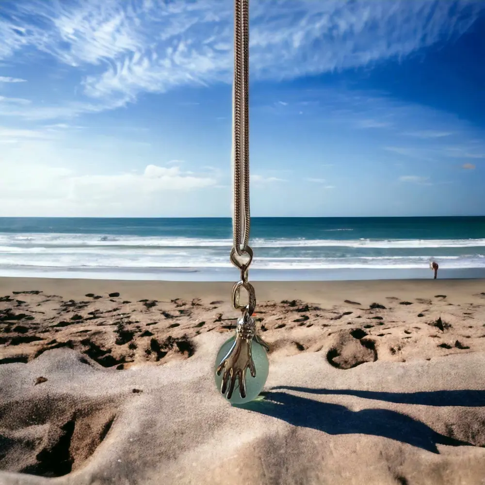 Beachcombed codd marble set into silver plated clasping hands to create this beautiful marble necklace. 20″ 925 Sterling silver chain This will arrive gift boxed