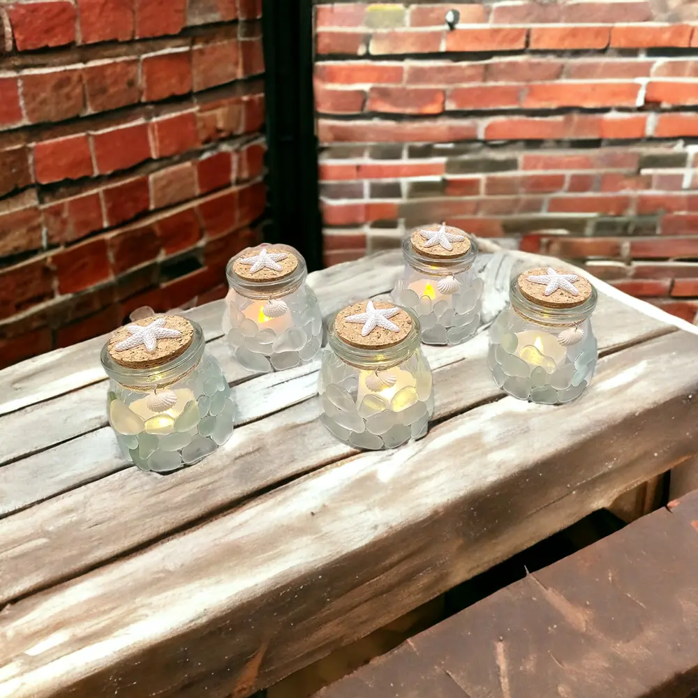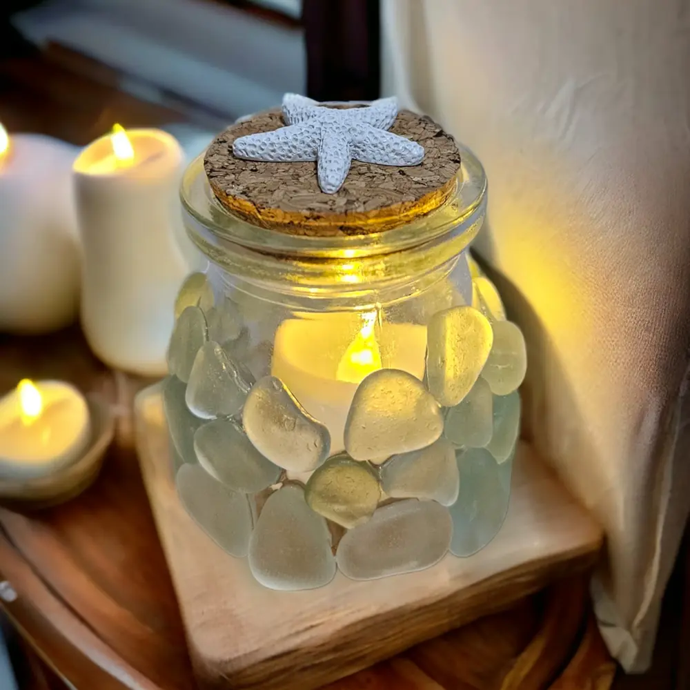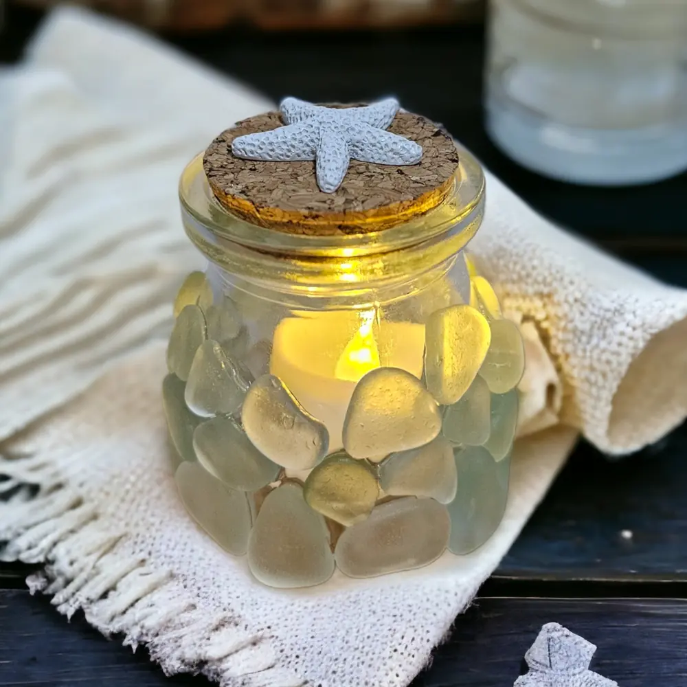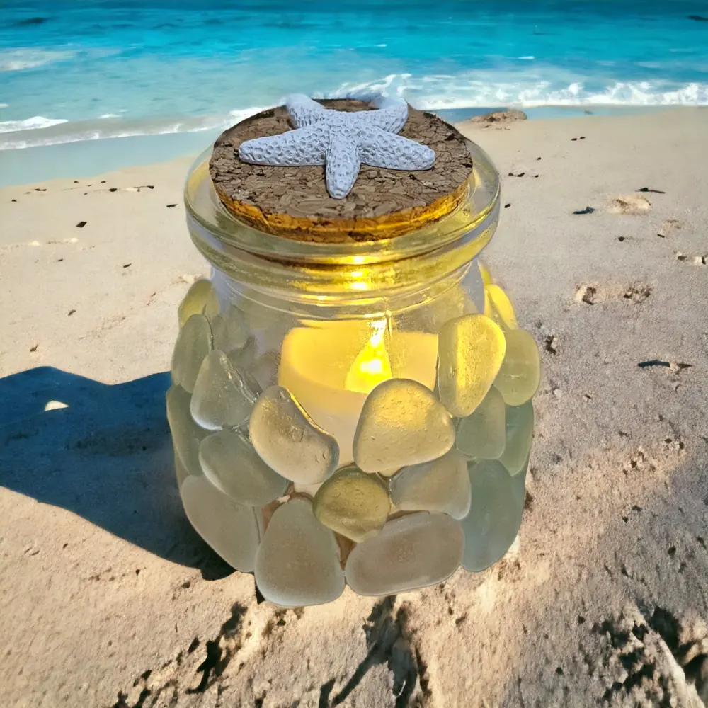 Add a touch of coastal charm to your wedding tables with our handcrafted Seaglass Candle Jars!