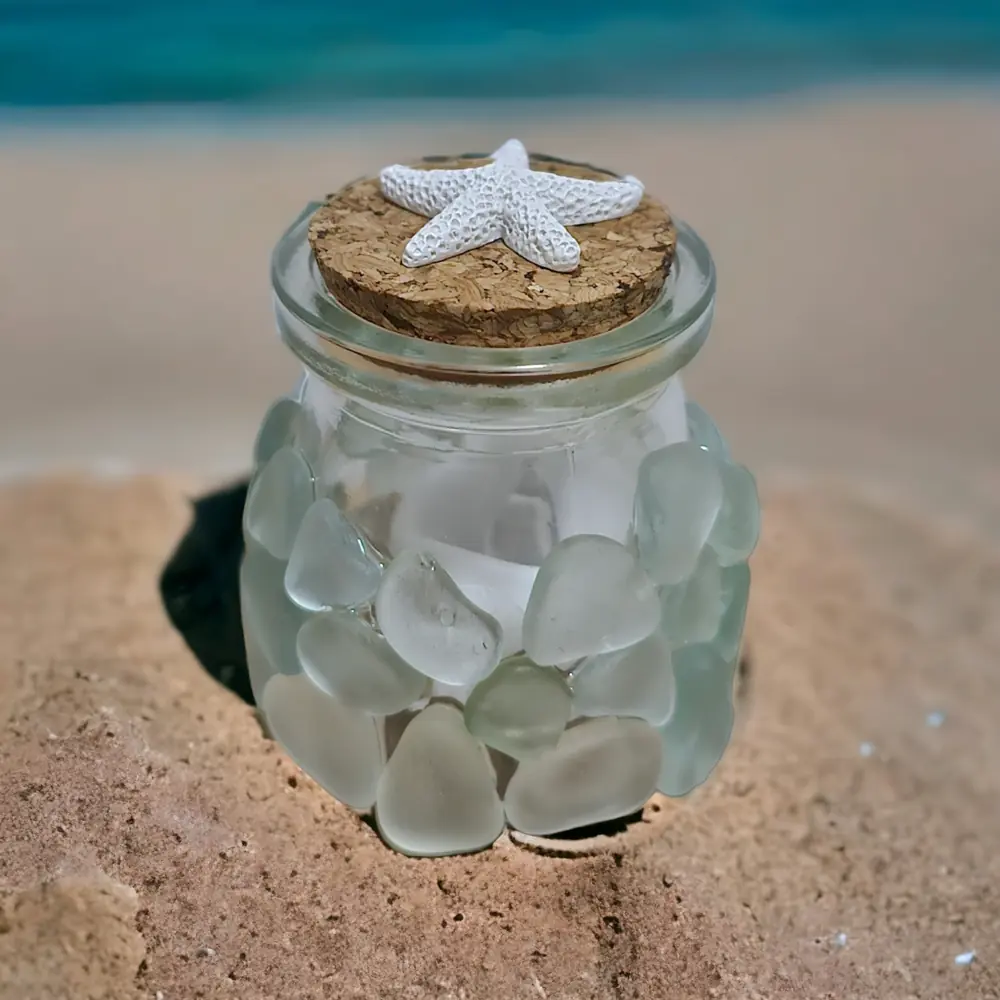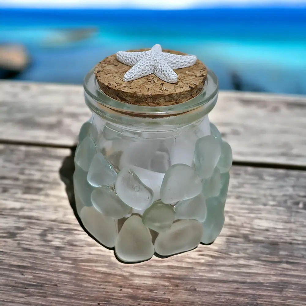 These stunning 7cm x 5cm jars are adorned with genuine beach-combed Seaglass from the Kent Coast, making each piece truly unique. Complete with a faux T-light candle for safety and venue compliance.Topped with an adorable starfish decoration, they are are the perfect blend of elegance and seaside whimsy.