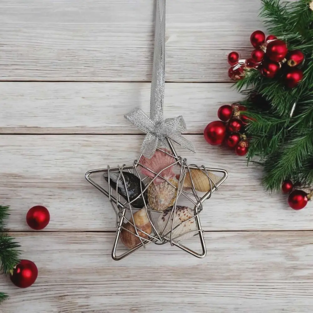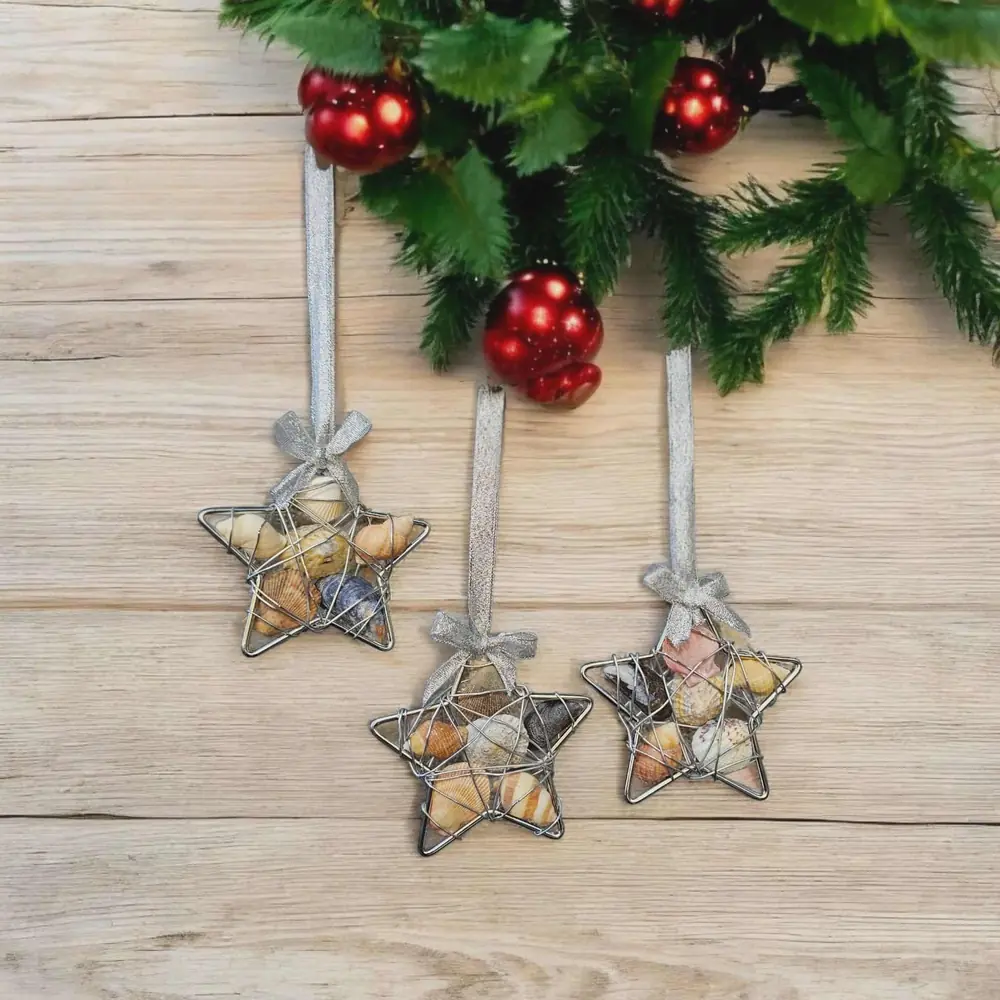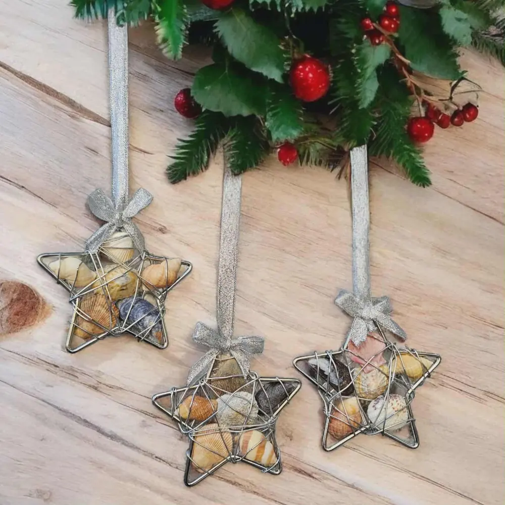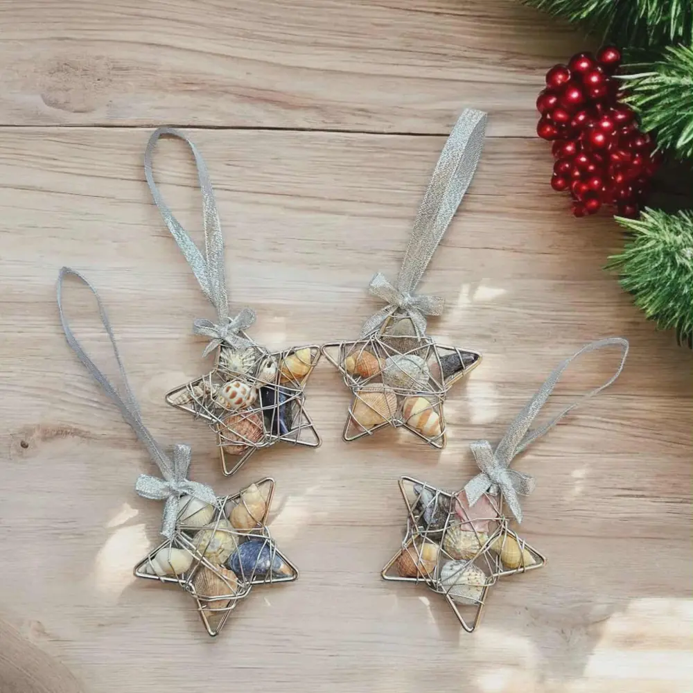 Coastal Christmas Star Ornaments Wire Wrapped Seashell Stars (4”) Bring a touch of seaside magic to your festive décor with these beautiful handcrafted Coastal Christmas Stars. Each 4″ star is individually made using a silver wire frame, filled with genuine seashells sustainably beachcombed from the Kent Coast, and finished with a shimmering silver ribbon and bow – ready to hang…