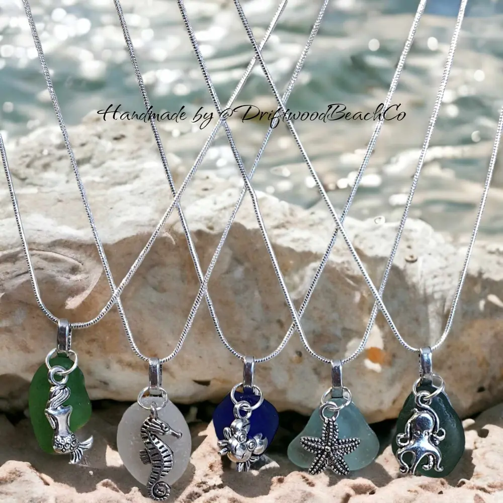 Sea glass charm necklace 925 silver chain 18″ plus Tibetan silver sea life charm choice of charm & choice of sea glass mermaid, seahorse, crab, starfish or octopus choose your colour Teal, Sea foam Green, Frosty White, Indigo Blue or Lime Green