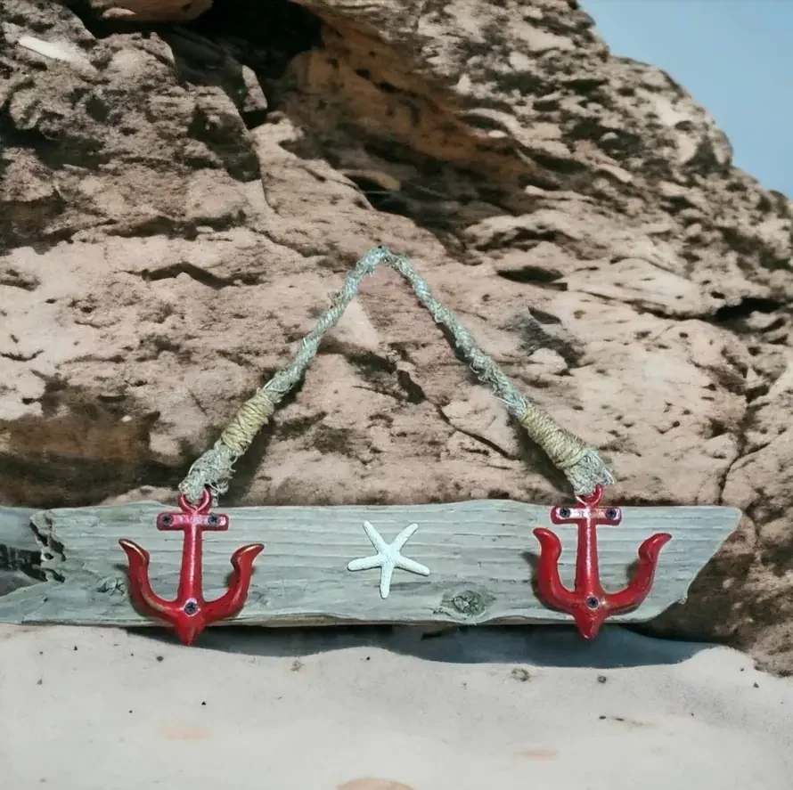 Genuine beach comber driftwood coat rack with red cast iron anchor hooks and beach combed rope for the hanging with a starfish decoration. Lovely piece for your beach hut to hang your towels or dry robe.