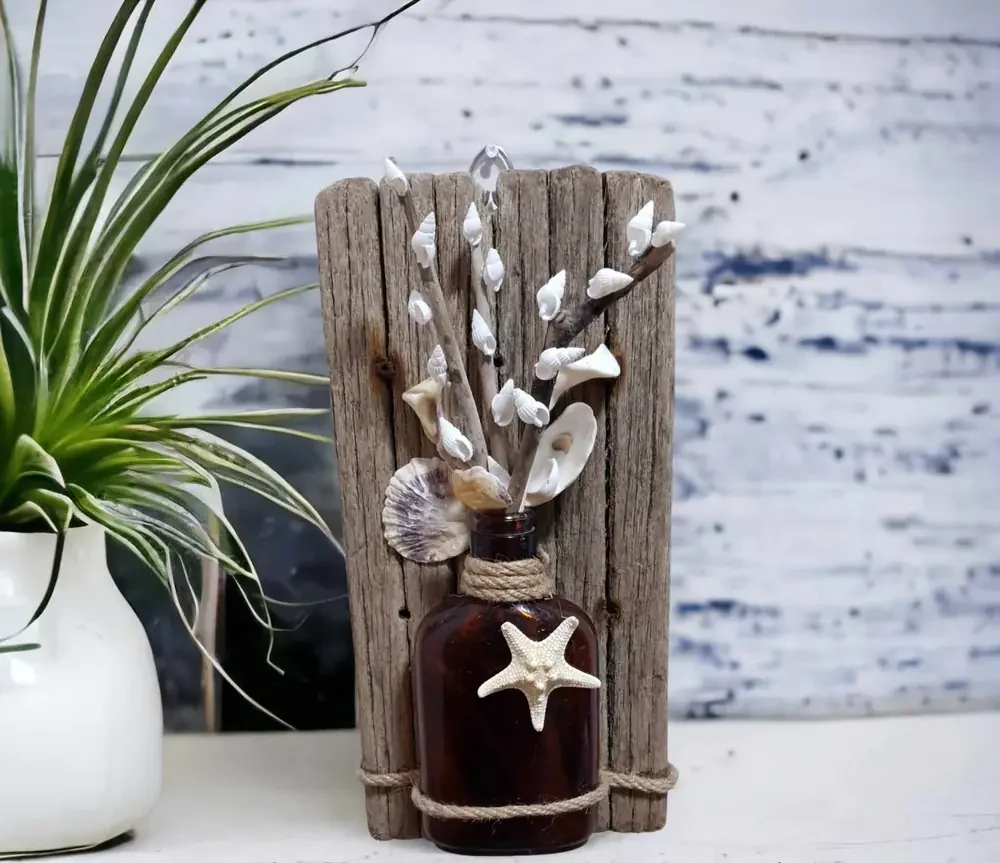 Beach combed driftwood, seashells and seaglass bottle handcrafted into this decorative Floral wall hanging.