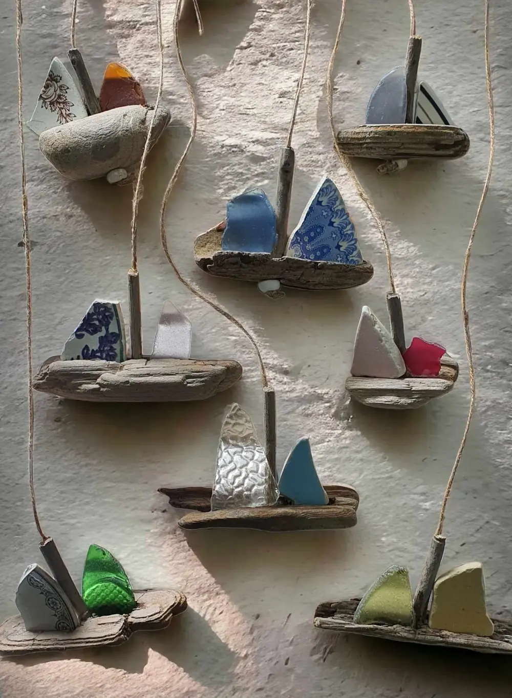 8 individual sailing boats with sails made from authentic Kent Coast finds.