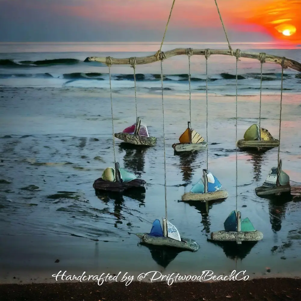 Each sail is delicately made from upcycled seaglass and beach pottery, creating a one-of-a-kind masterpiece that captures the essence of the sea. The boats are strung together using natural hemp string and secured with eco-friendly glue, ensuring both durability and sustainability.