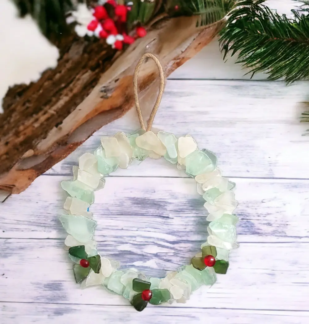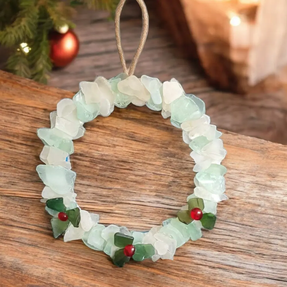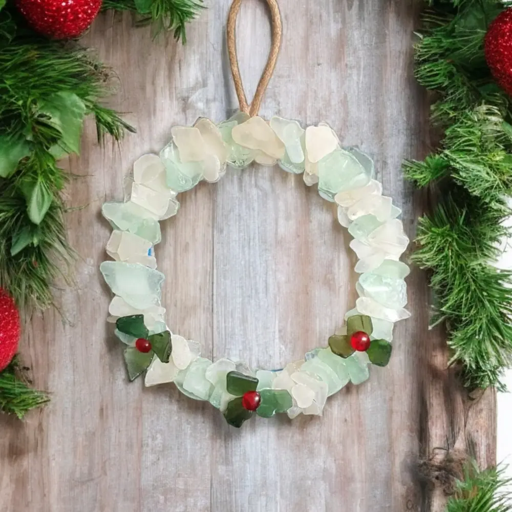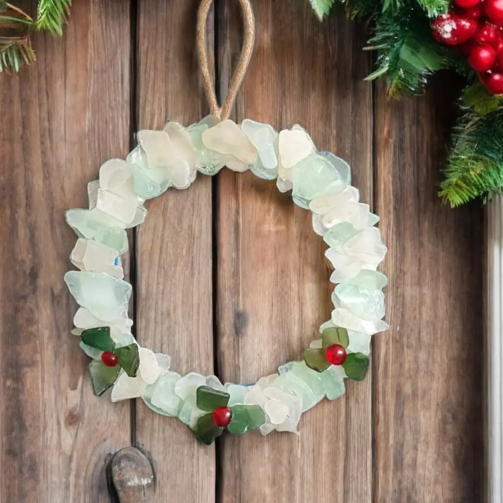 Bring some coastal Christmas cheer to your door, mantelpiece, or wall and enjoy the natural beauty of sea glass this holiday season.