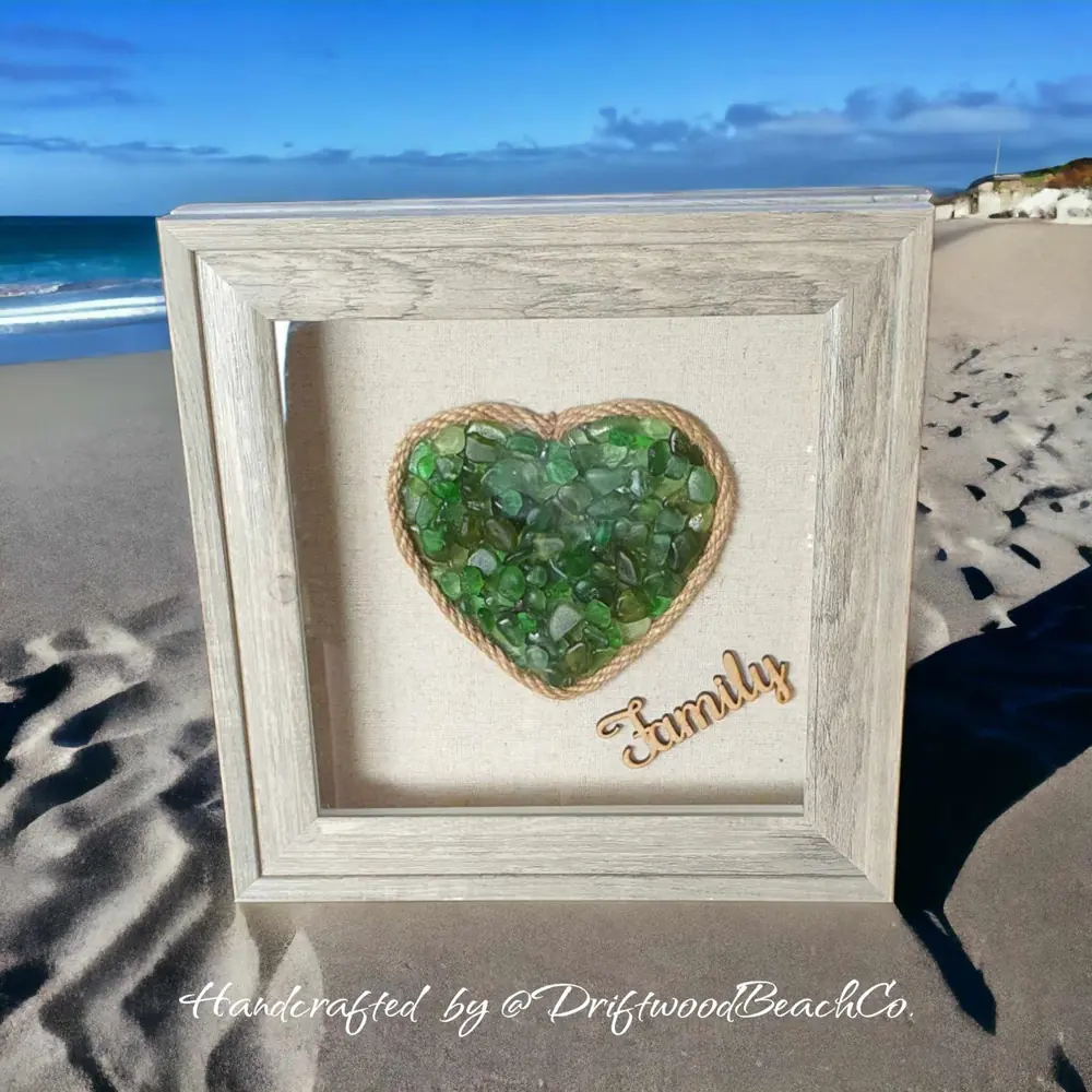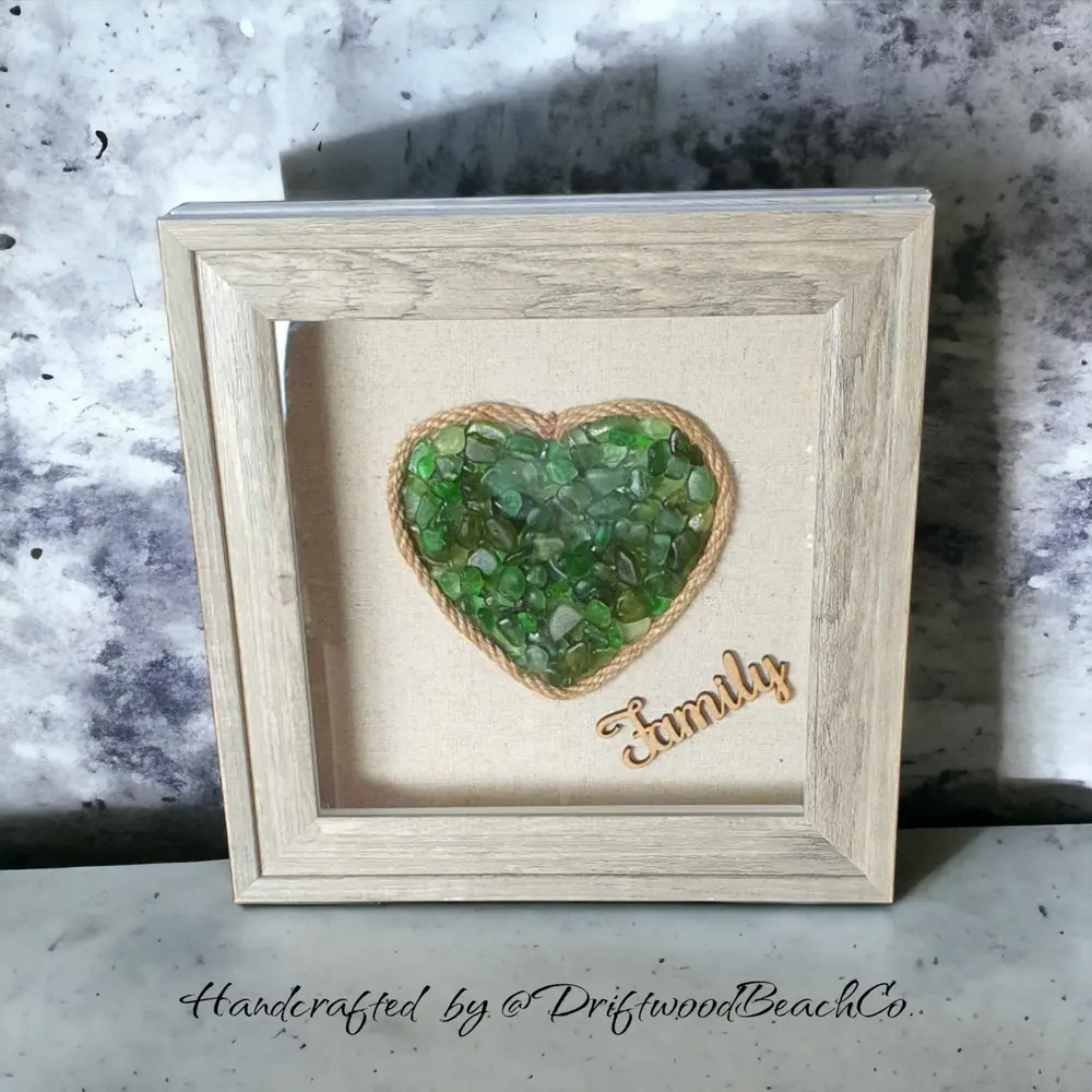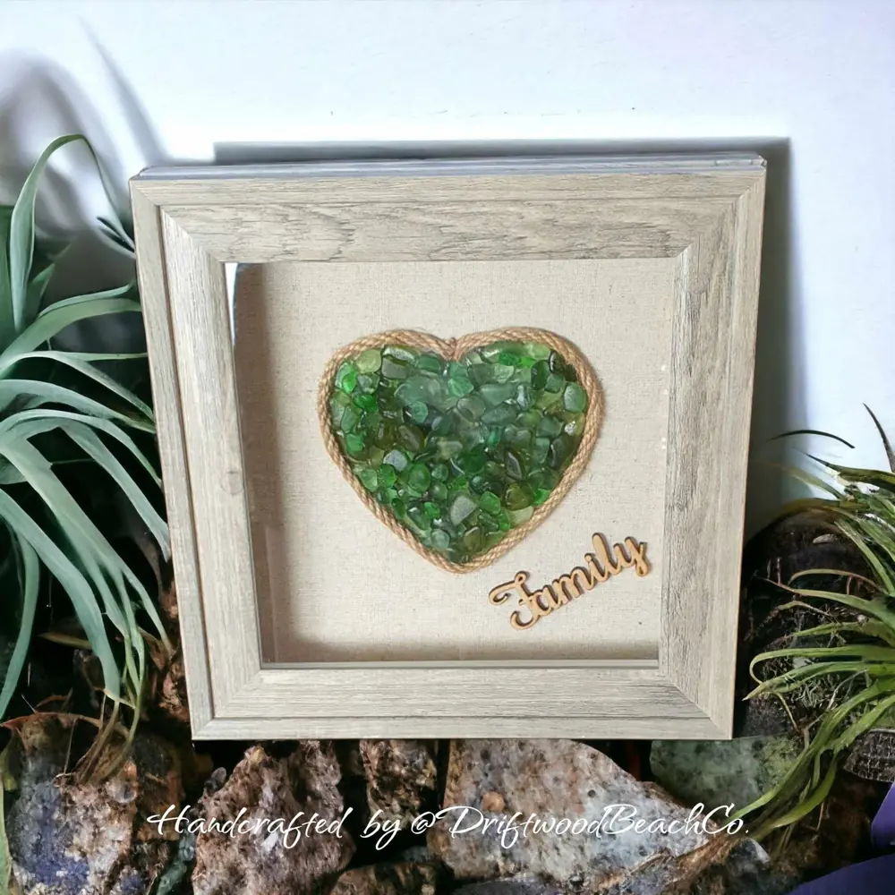 Elevate your space with the timeless beauty of our Green Sea Glass Heart Wall Art. Each piece is a testament to sustainability, featuring a handcrafted heart-shaped green sea glass encased in a 9″ x 9″ x 1.7″ grey washed boxed frame. Surrounding the sea glass heart is delicate hemp rope, adding a touch of rustic charm to the design. At the bottom corner, a wooden laser-cut “Family” sign serves as a heartwarming reminder of love and togetherness. This exquisite wall art is not only a stunning decorative piece but also a celebration of eco-conscious living.