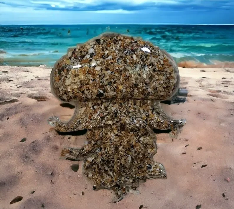 3D Resin Jellyfish. Resin encapsulated with sand to create these realistic Jellyfish wall art hanging. The Jellyfish is 8″ Wide by 10″ Each piece can be Wall hung fixings attached. Designed and handcrafted by Driftwoodbeachco.