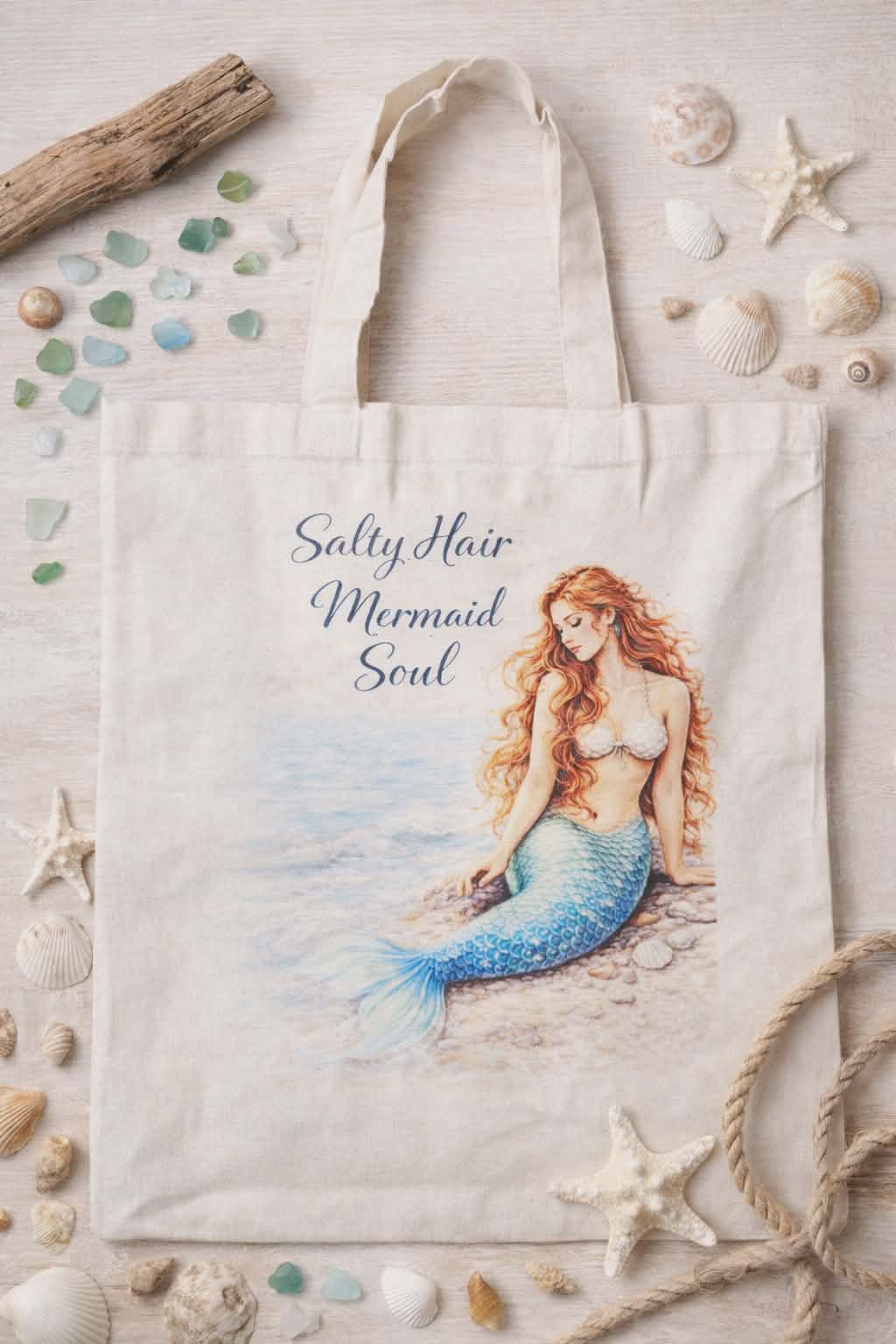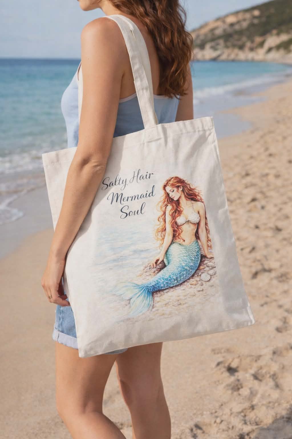 This beautiful 100% cotton tote bag features my original Salty Hair Mermaid Soul design, inspired by the magic of the sea and the relaxed coastal lifestyle.
