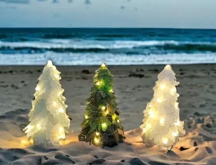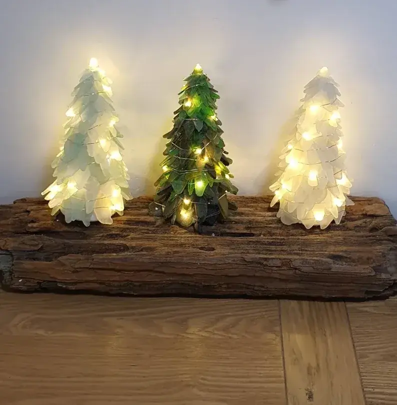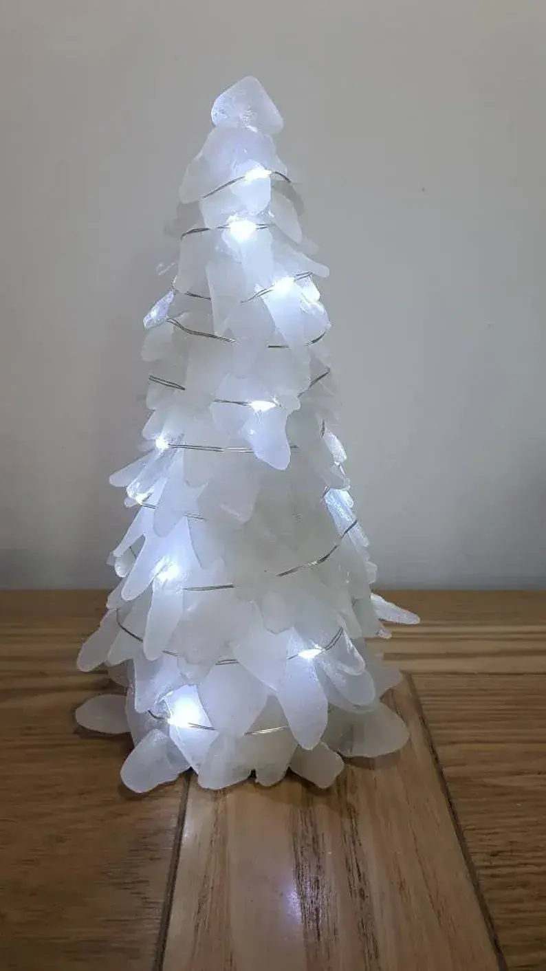 Beautiful handcrafted genuine sea glass tree with LED Lights. Available in plain Frosty White or Sea foam Green, Ice Aqua & Frosty White combo or Green. It stands 8″ tall and is 4″ wide at the base. These 8″ high sea glass trees weigh approximately 600g – 700g each…