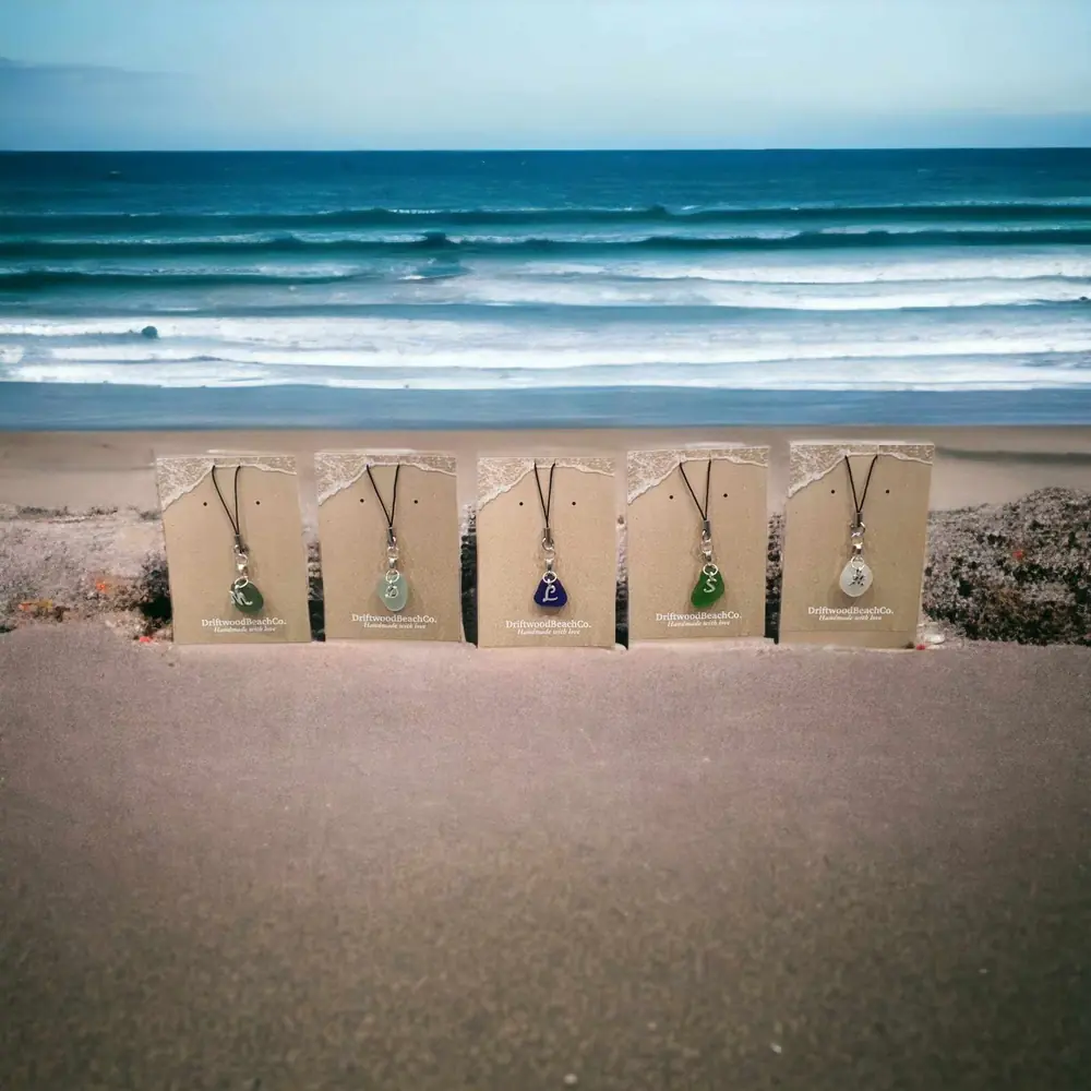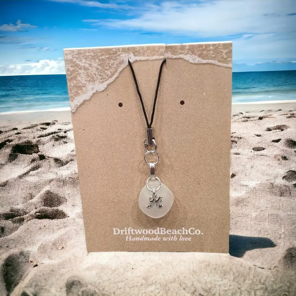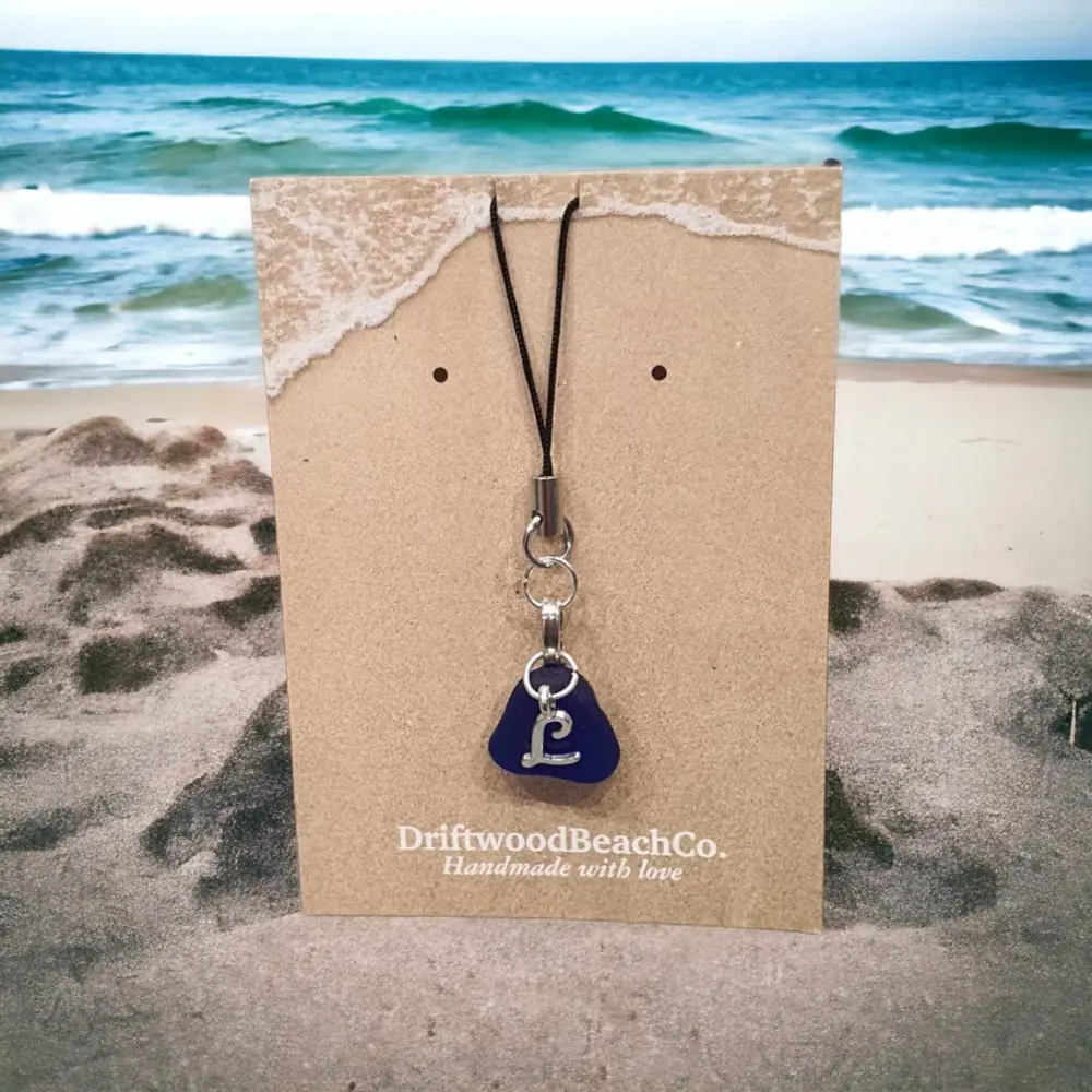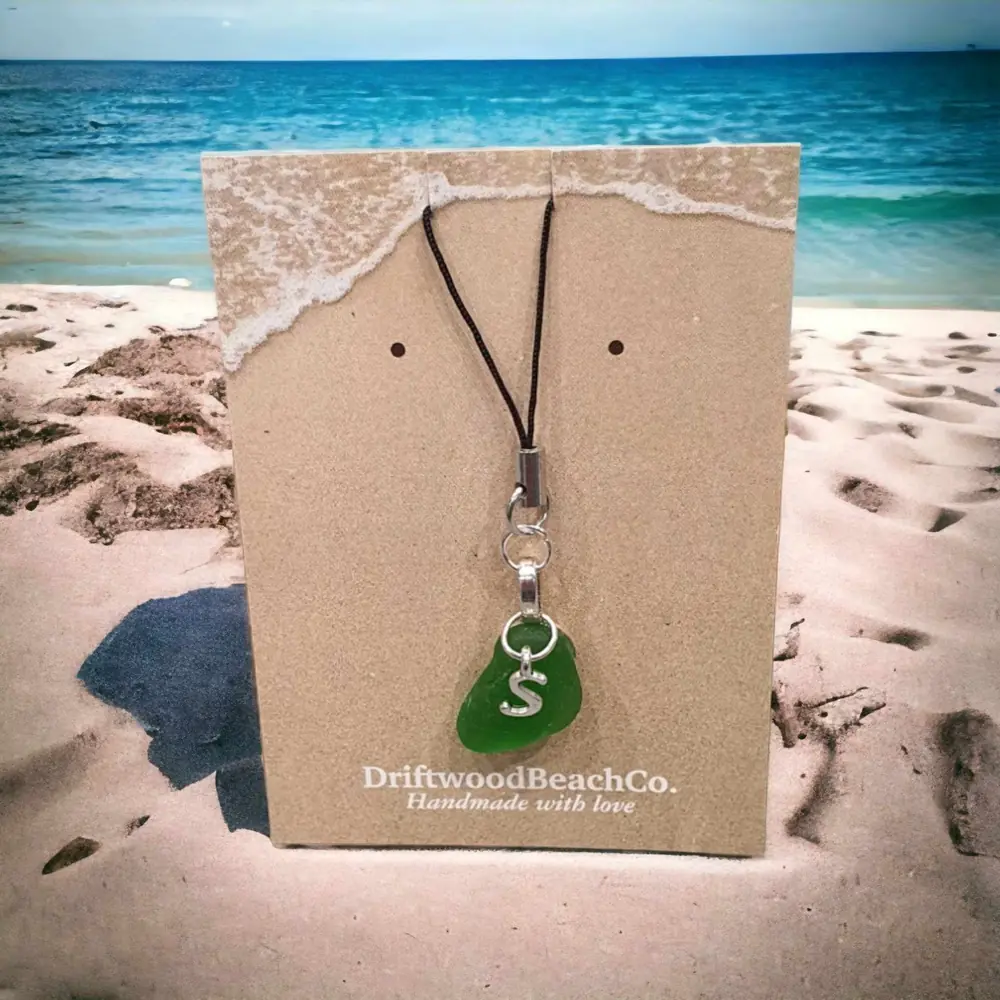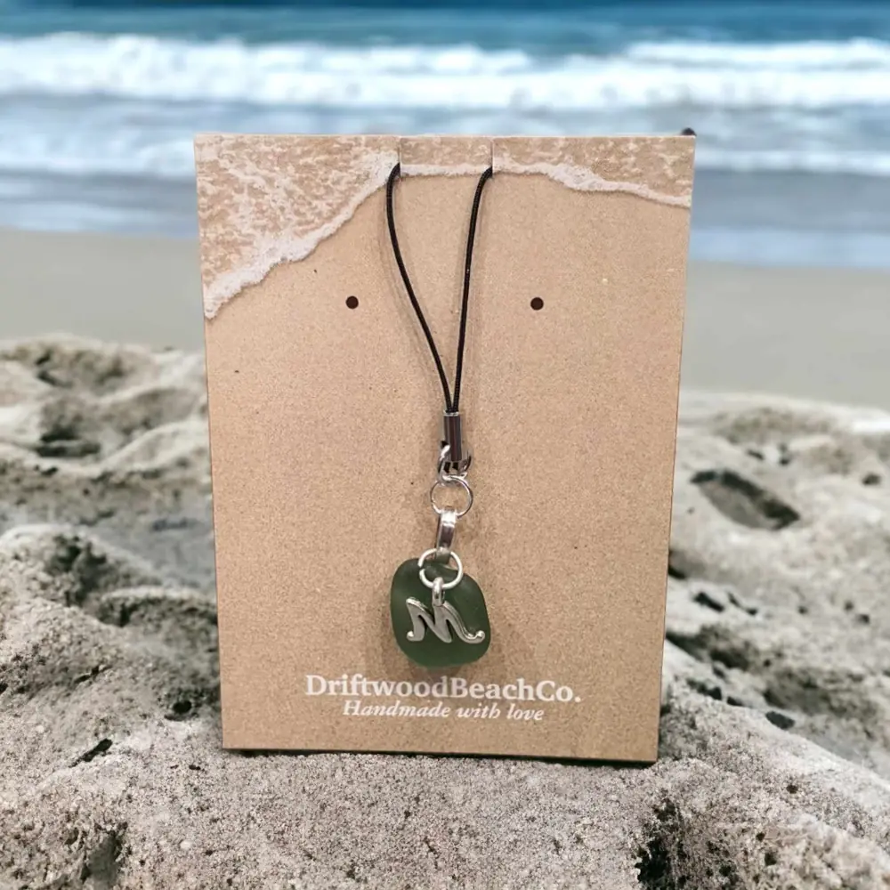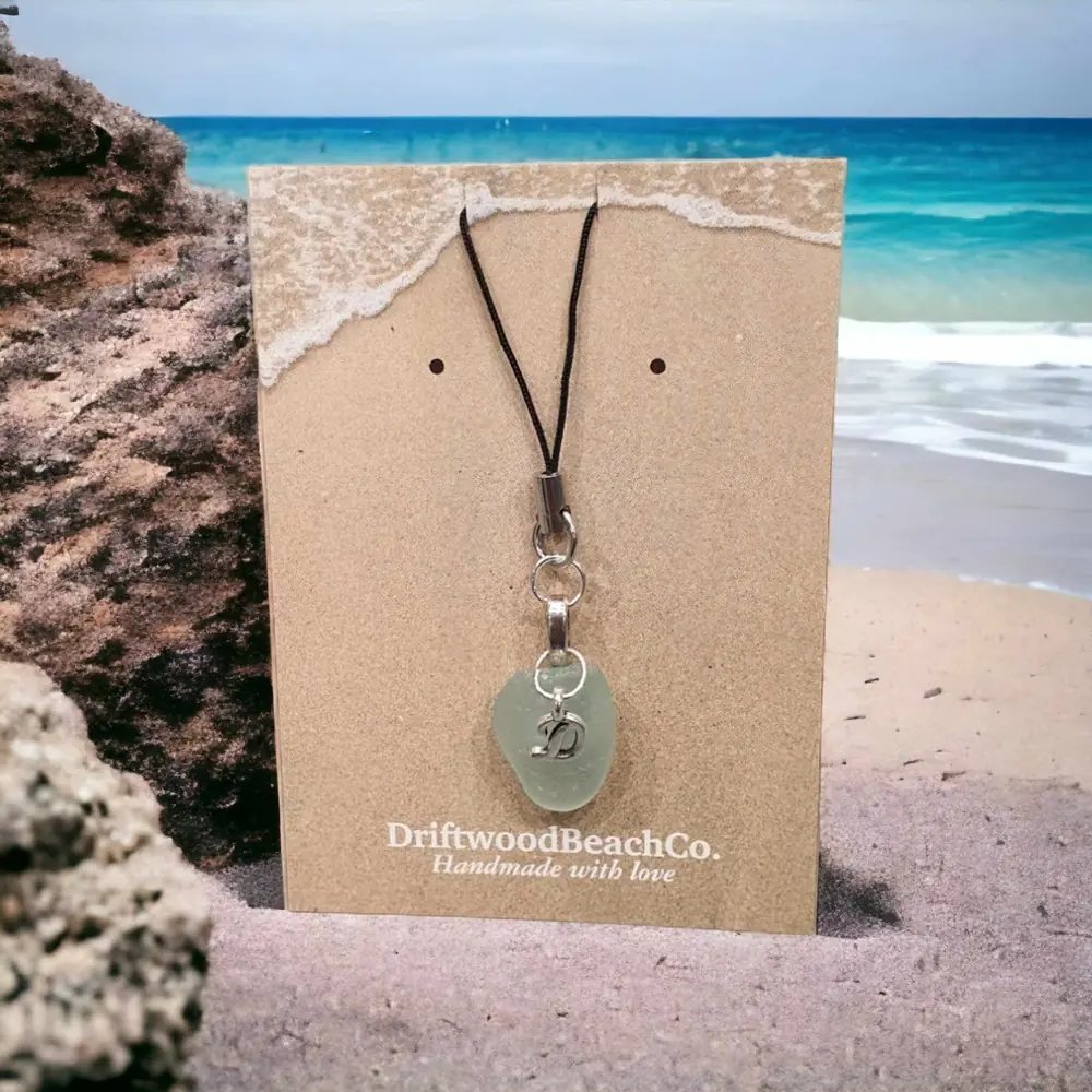 Beautiful Sea glass Mobile Phone Charm Available in a choice of colour sea glass and Your choosen Initial just pick from the drop down menu to personalise.