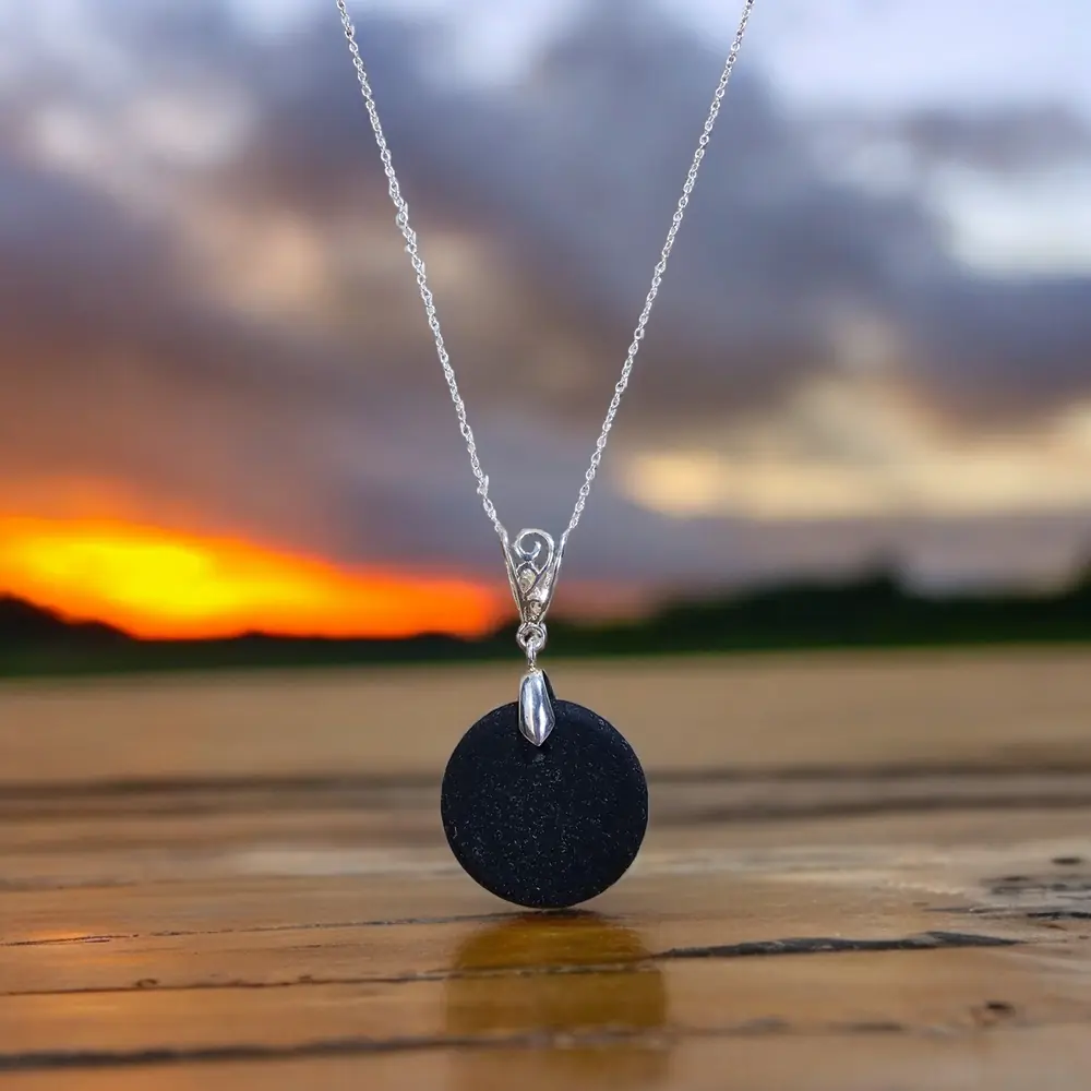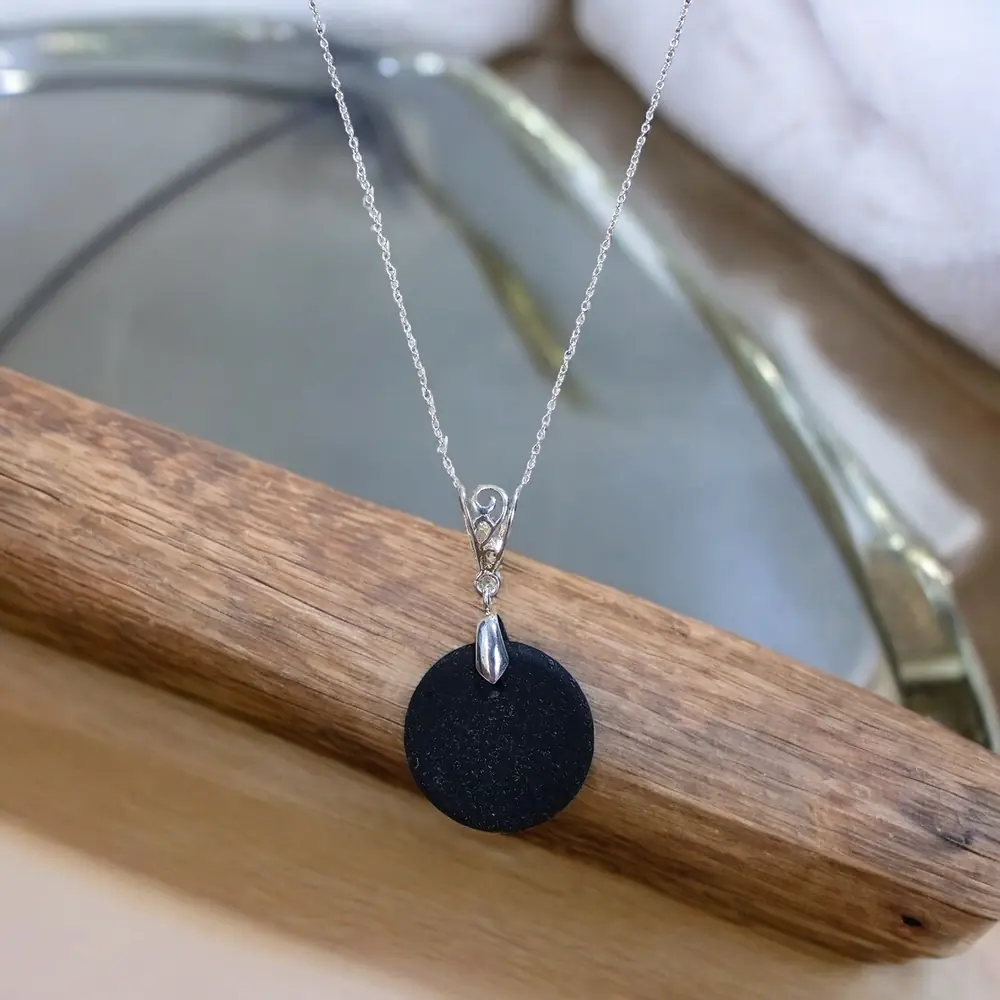 Discover the timeless elegance of our Black Seaglass Necklace, featuring genuine beachcombed seaglass from the picturesque Kent Coast. This pendant tells a unique story, with this particular piece originating as a mourning button before being meticulously handcrafted into a stunning necklace.