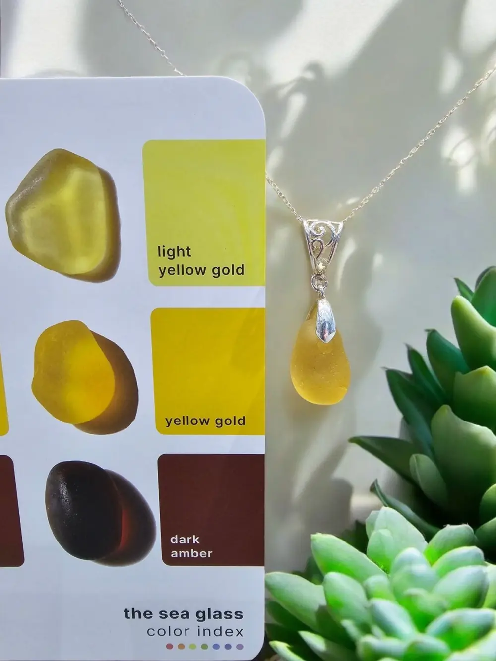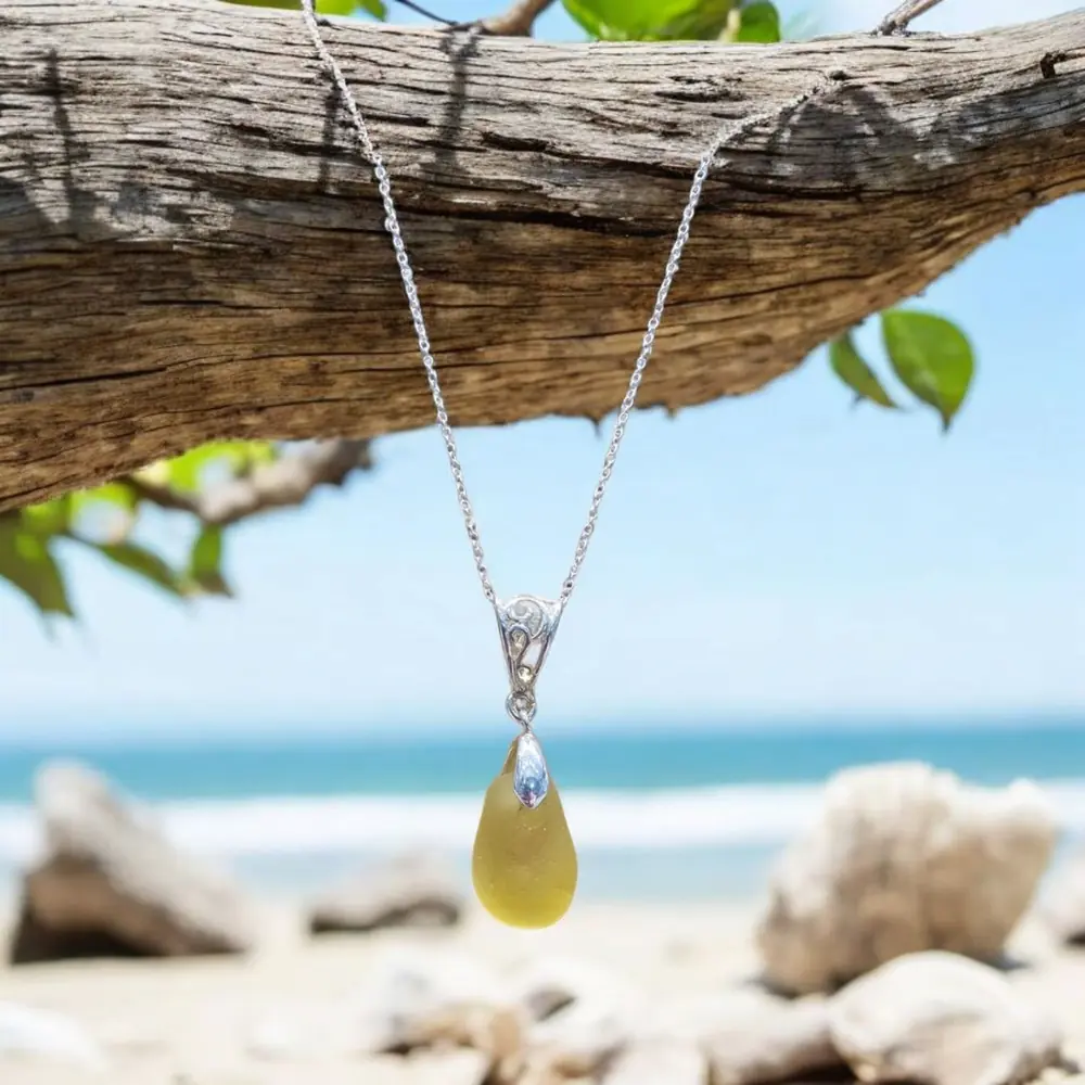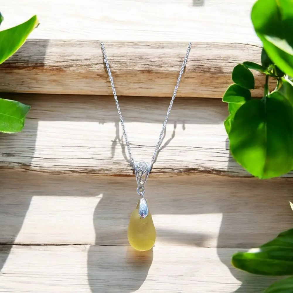 Discover the beauty of the unexpected with this very rare yellow Gold teardrop seaglass pendant – a unique piece of natural treasure, lovingly crafted into a timeless necklace.