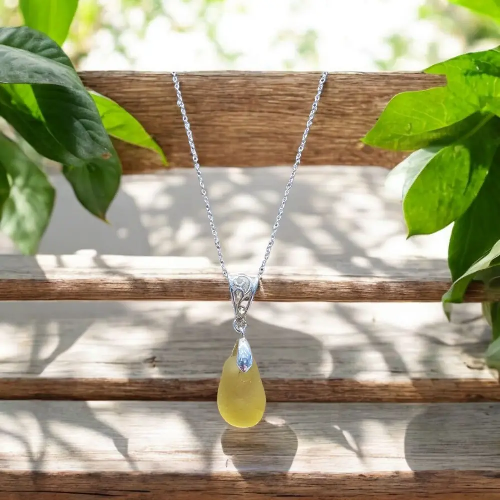 This extraordinary pendant features authentic surf-tumbled seaglass in a striking yellow hue, ethically beachcombed from the stunning shores of the Kent Coast. Yellow seaglass is among the rarest of all sea-found colours, making this piece truly special.
