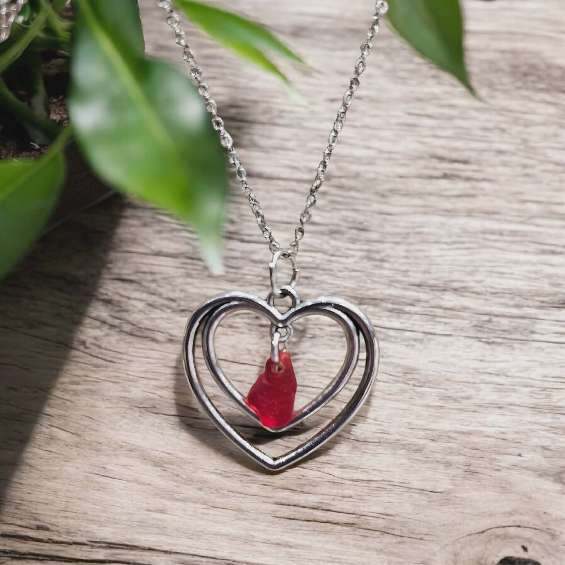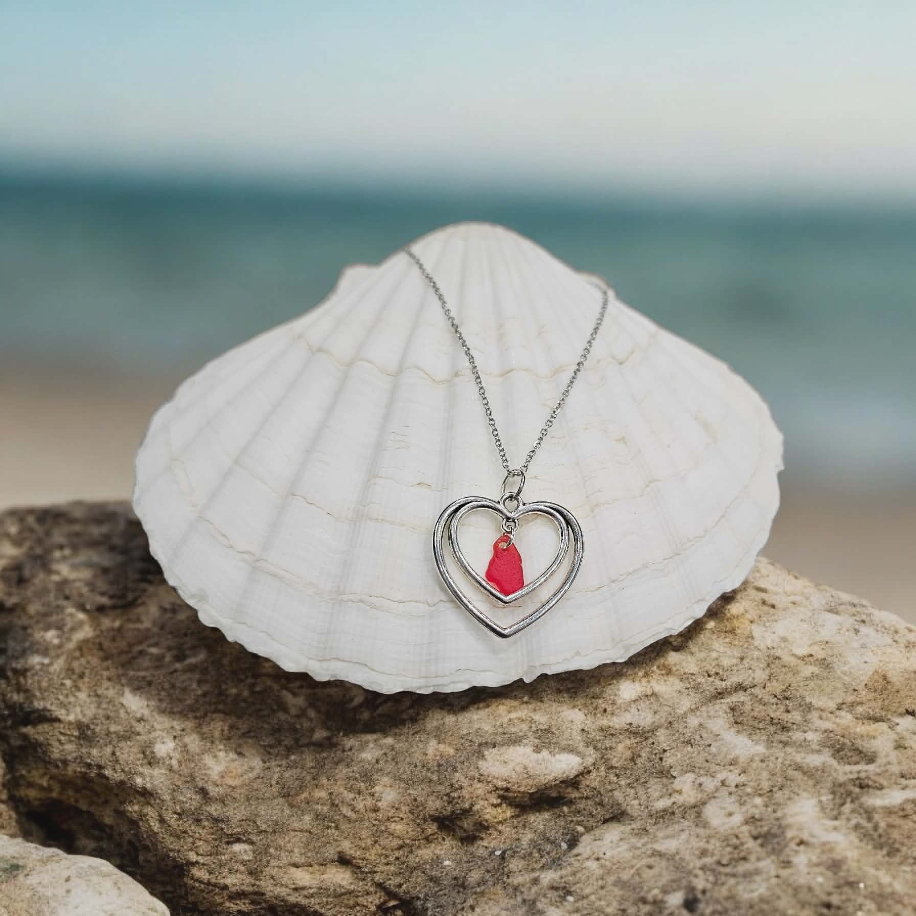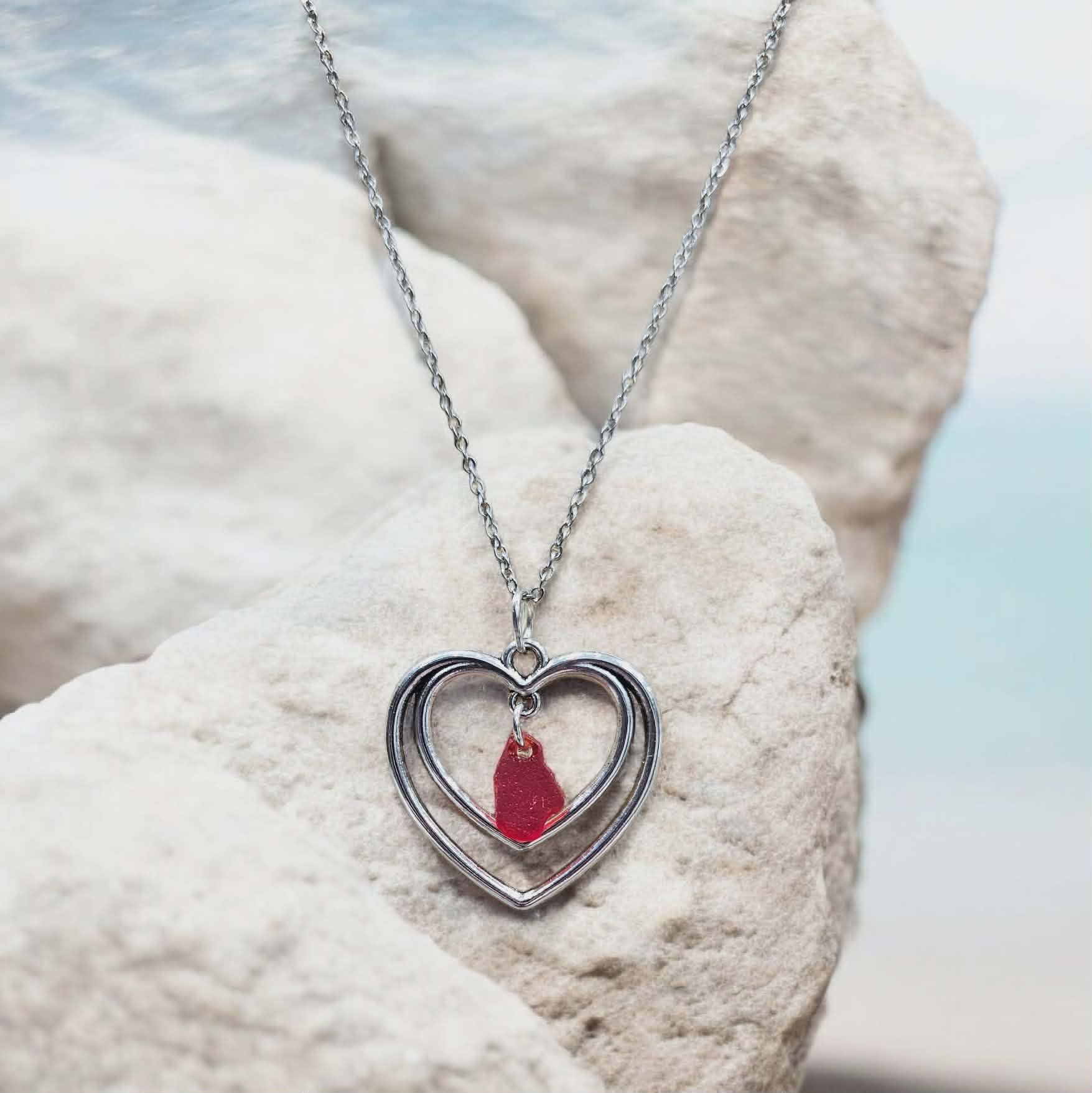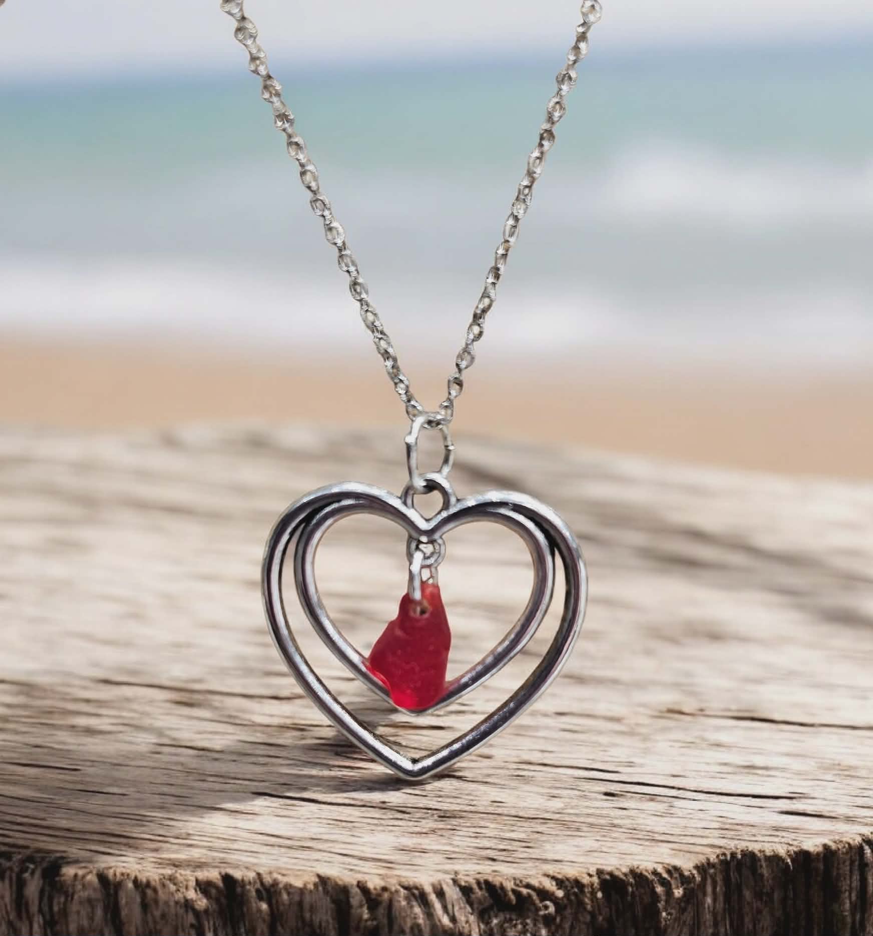 Add a touch of coastal romance to your jewellery collection with this beautiful Red Sea Glass & Silver Double Heart Necklace – a truly meaningful and unique piece, handcrafted using sustainably beachcombed materials.