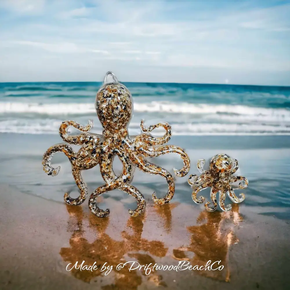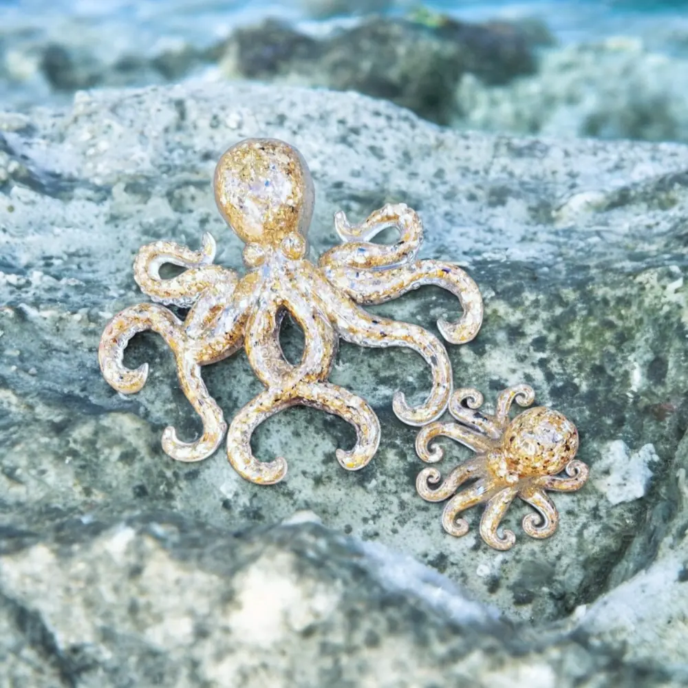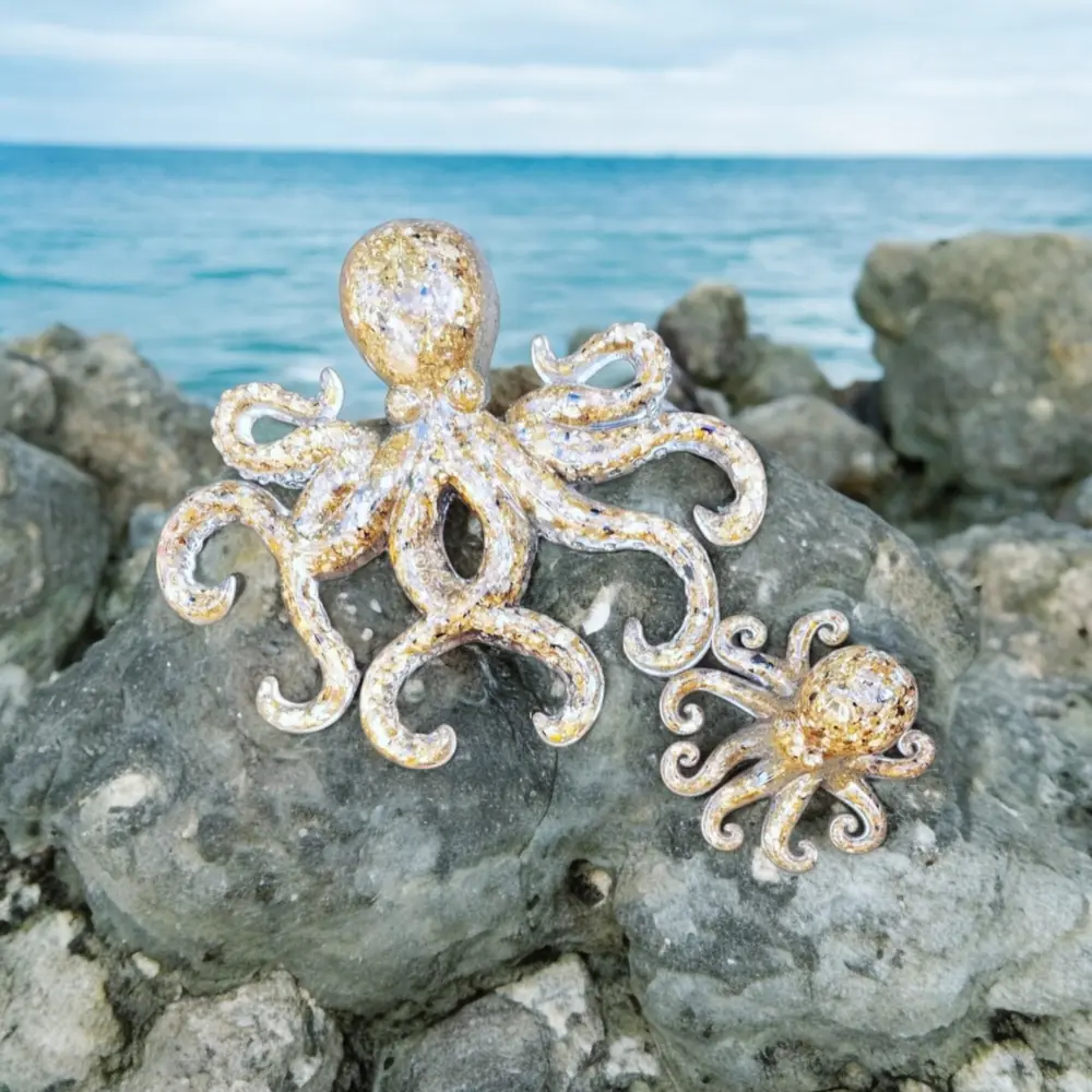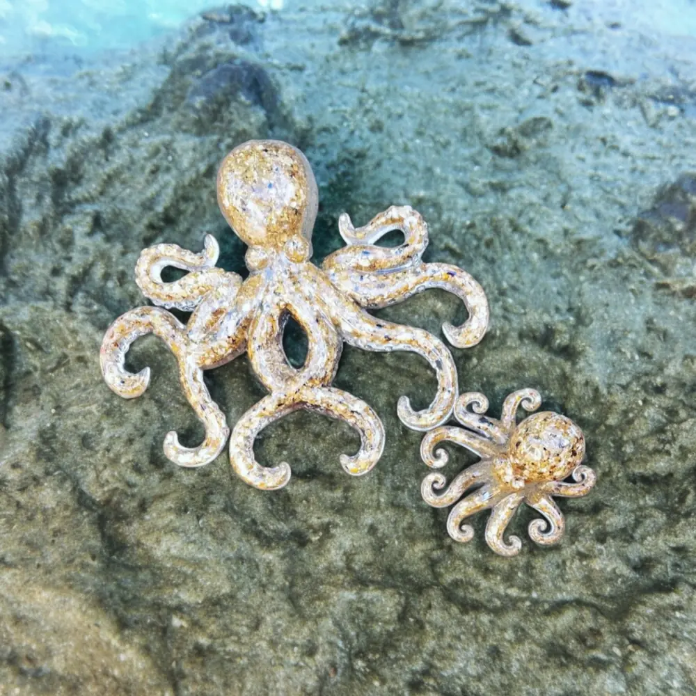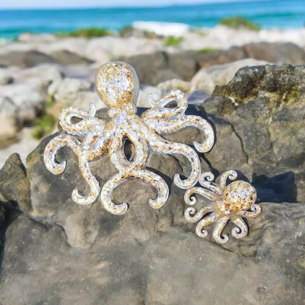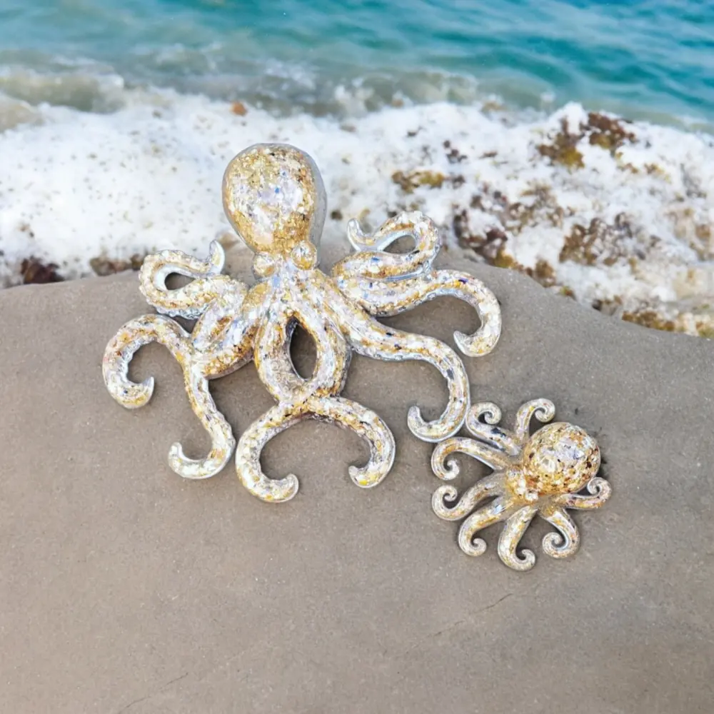 3D Resin Octopus. Resin encapsulated with sand to create these realistic Octopus wall art hanging. Available to purchase as a set or individually. The large octopus is 9″ Wide by 8″ High and the smaller octopus is 4″ wide by 3″ High…