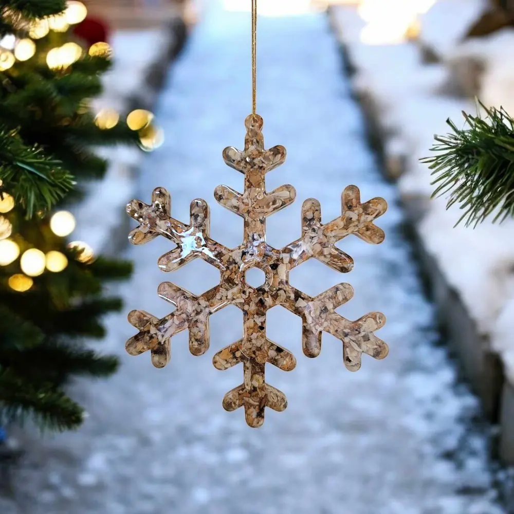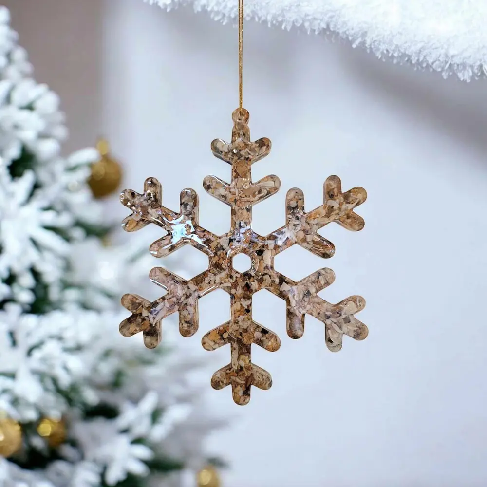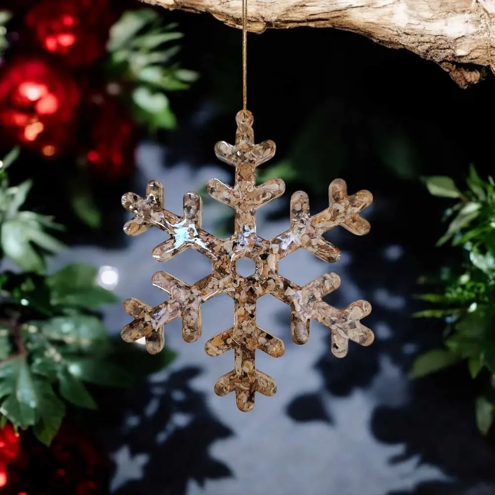 Bring a touch of the coast to your Christmas decor with this exquisite Resin Snowflake Decoration. Carefully handcrafted with a unique blend of resin and crushed shells, each piece celebrates the natural beauty of the Kent Coast. The shells, responsibly collected from local shores, add a delightful seaside sparkle to your festive decor.