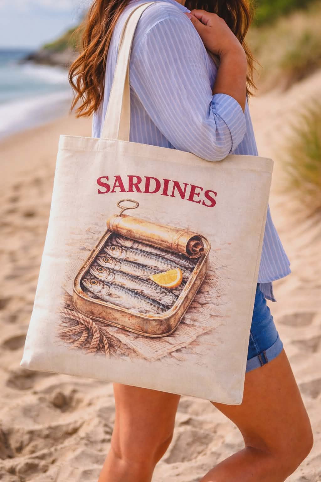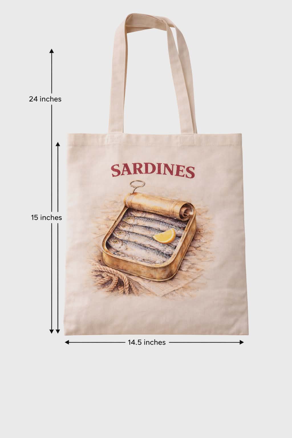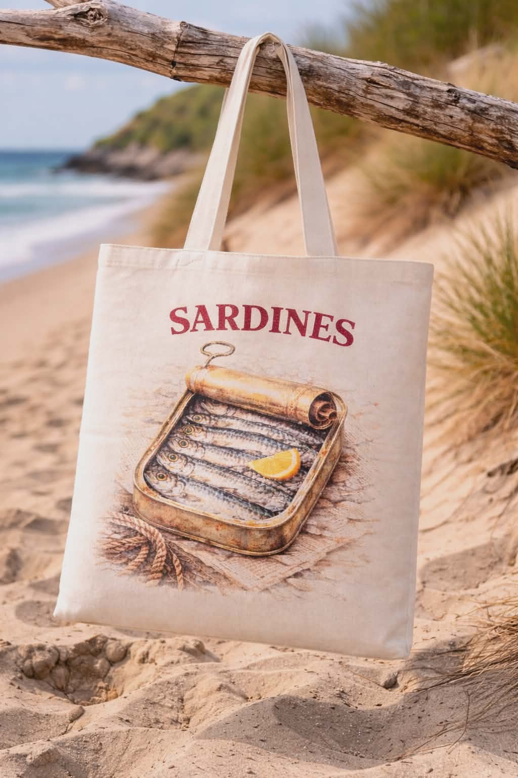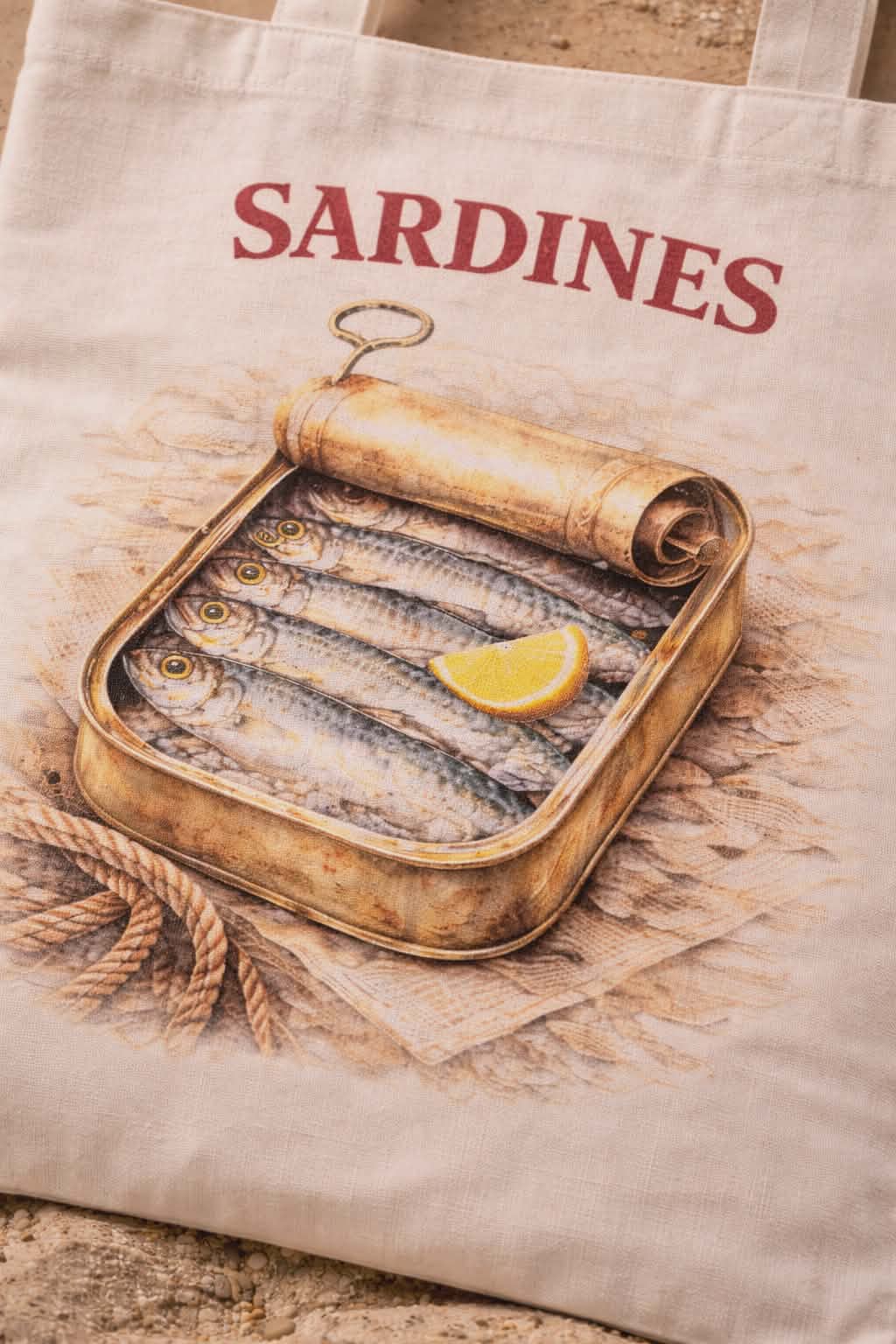 Inspired by traditional seaside fish markets and vintage seafood tins, this unique tote bag features a beautifully illustrated sardines tin design with bold red SARDINES lettering.