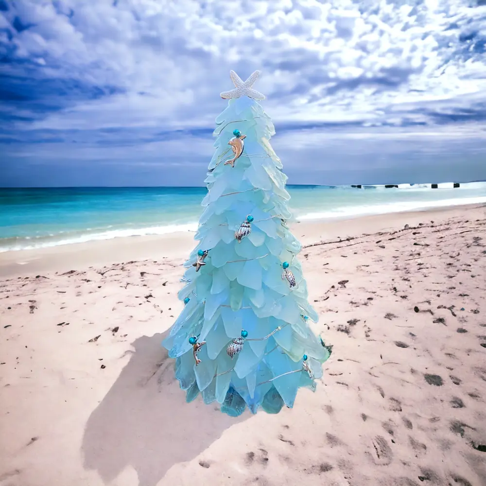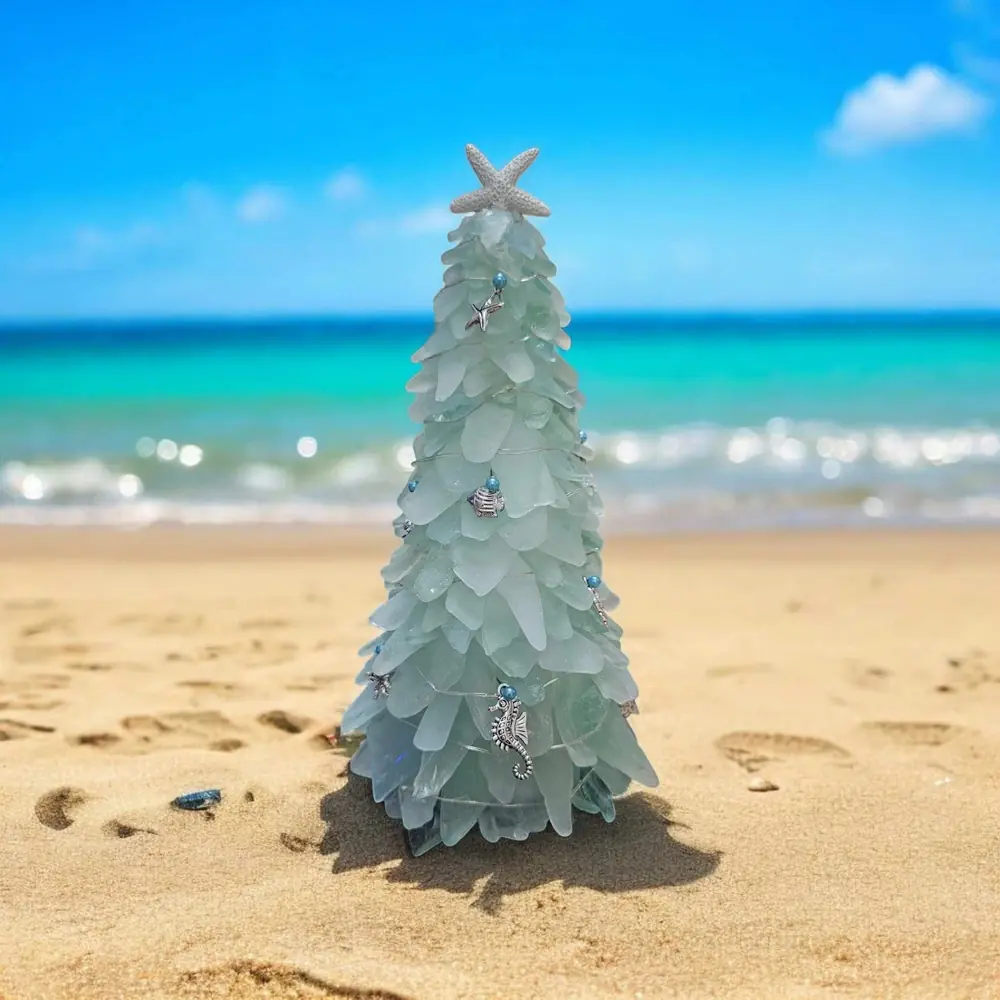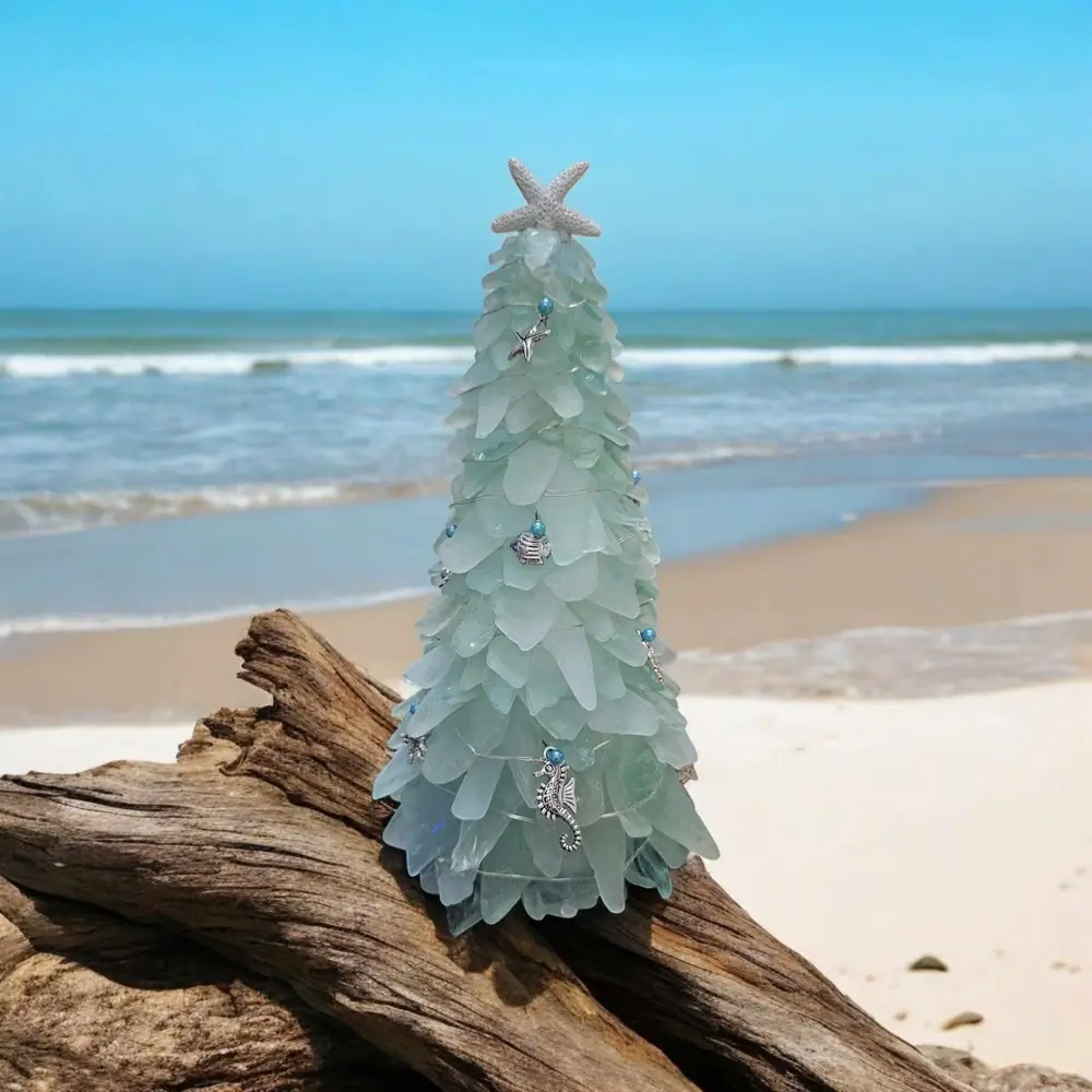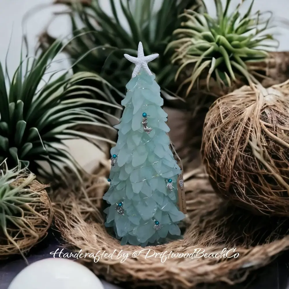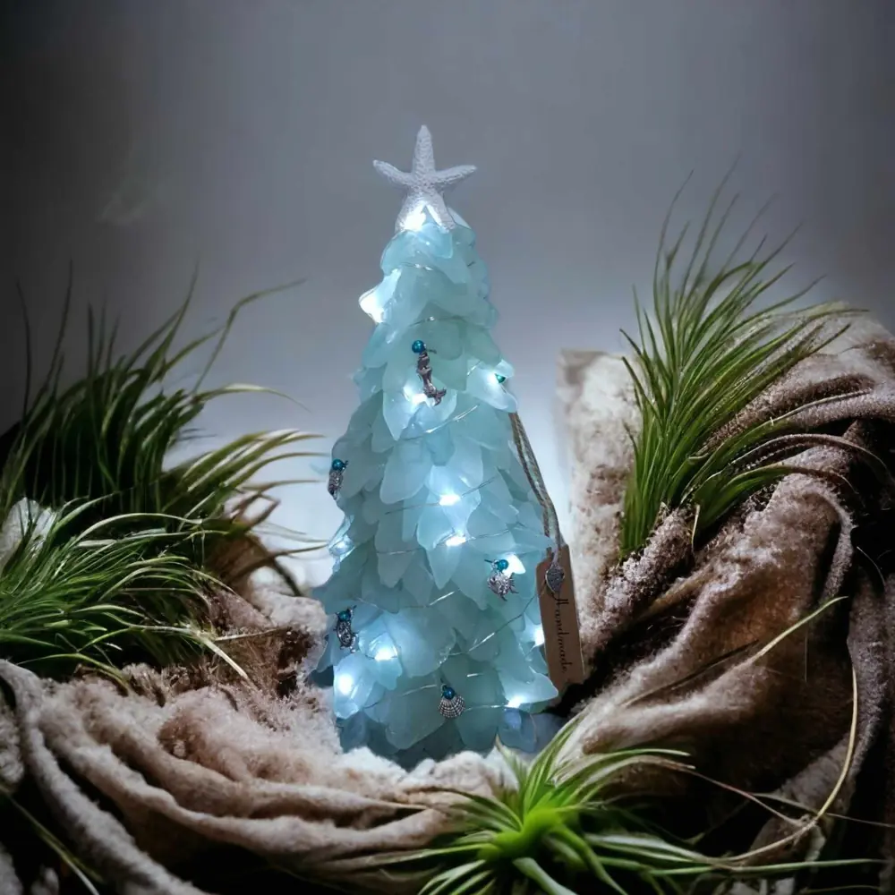 8″ high Sea foam green sea glass Tree with LED Battery Operated String Lights and Tibetan Silver Sea life charms and a starfish topper.