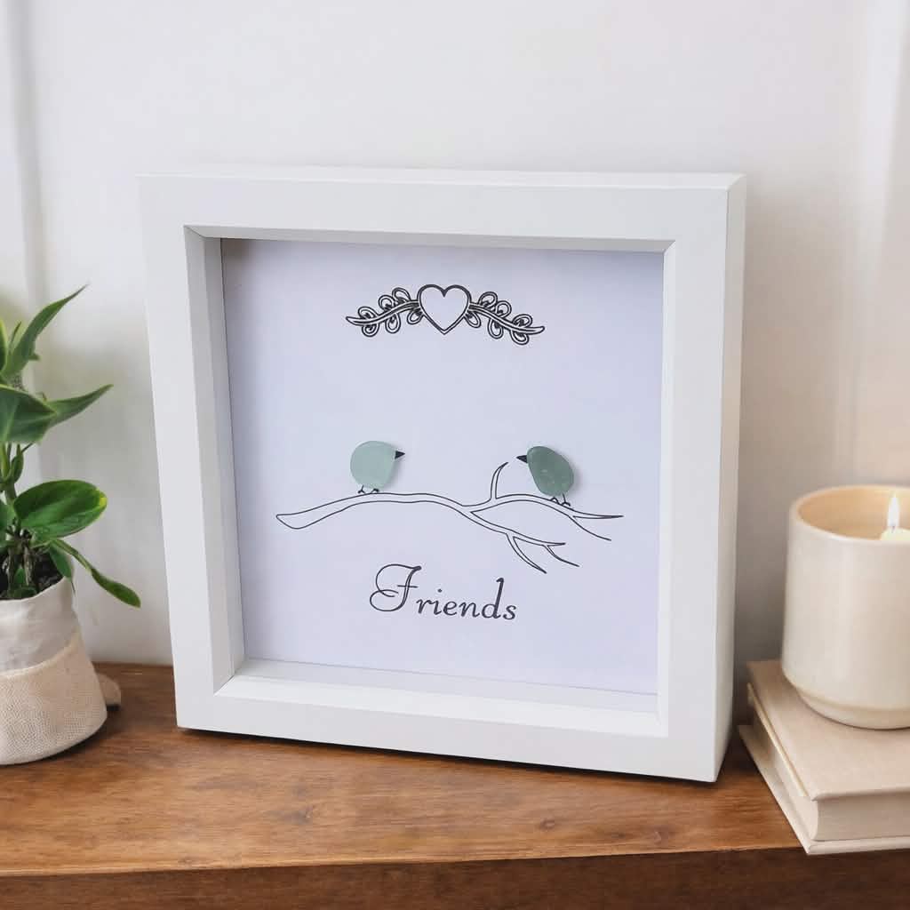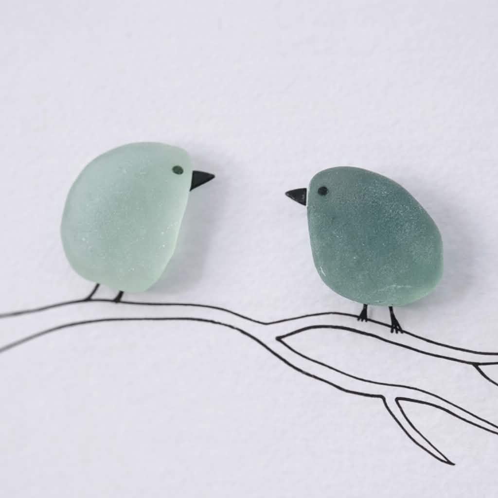 This delicate framed artwork features two little birds sitting together on a branch, each created using naturally frosted sea glass.