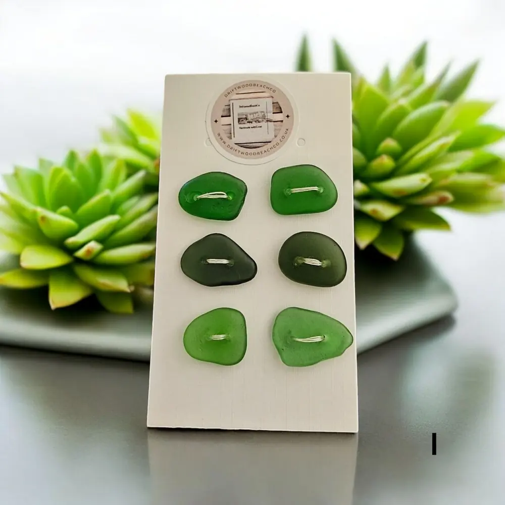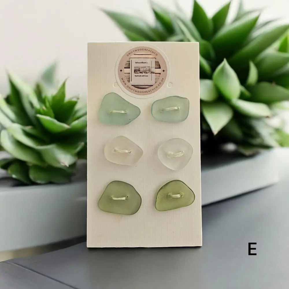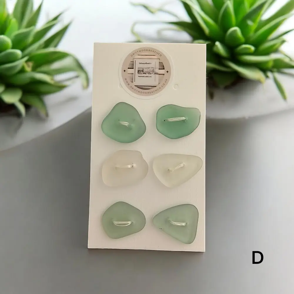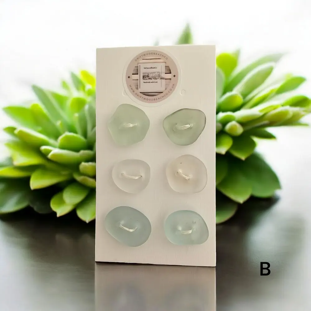 Set of 6 buttons sea glass buttons Introducing our Seaglass Buttons Dive into coastal elegance with these handcrafted treasures from the Kent Coast. Each set features 6 buttons, with 2 charming shades of beachcombed seaglass in every pack…