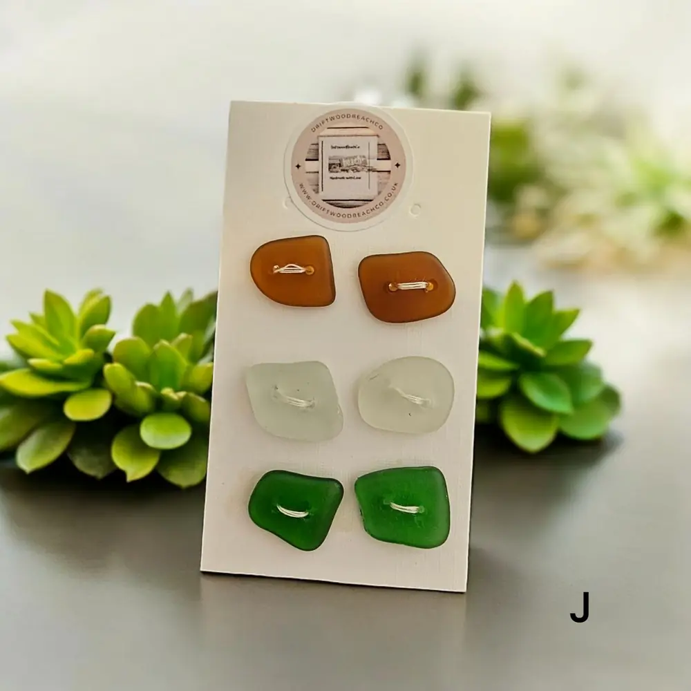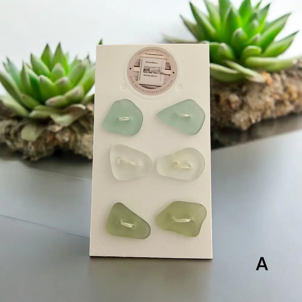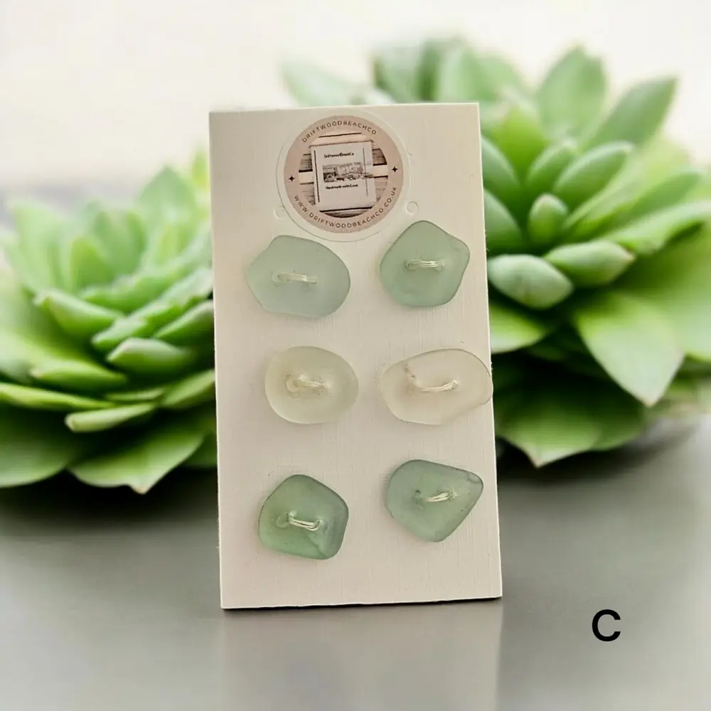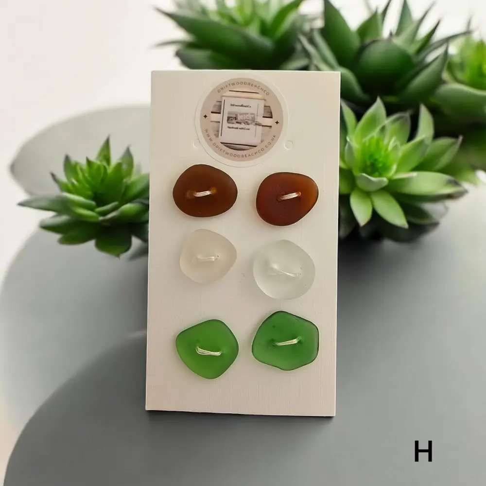 Set of 6 buttons sea glass buttons Introducing our Seaglass Buttons Dive into coastal elegance with these handcrafted treasures from the Kent Coast. Each set features 6 buttons, with 2 charming shades of beachcombed seaglass in every pack…