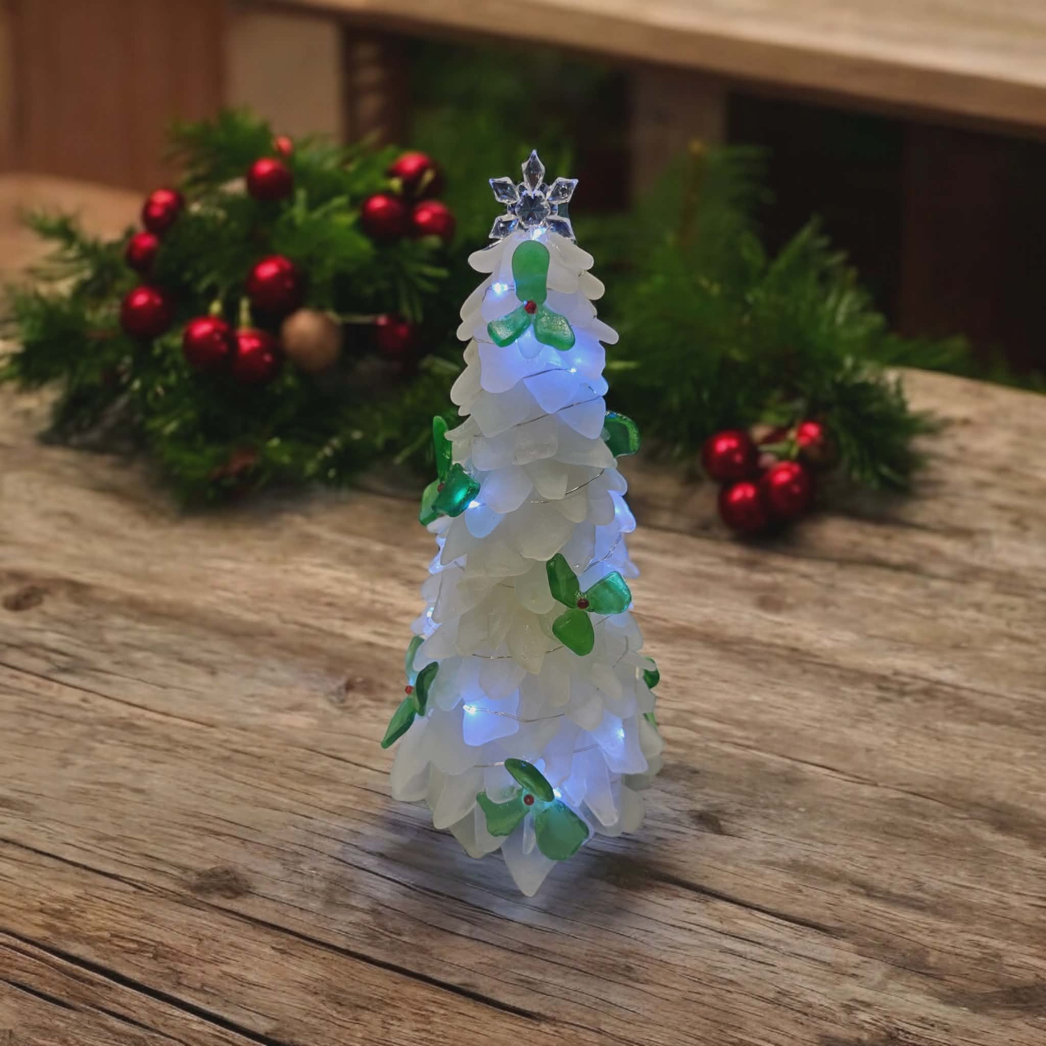 Beautiful handcrafted genuine Frosty white sea glass Christmas tree with handcrafted genuine sea glass Holly decorations. Designed and handmade by DriftwoodBeachCo.