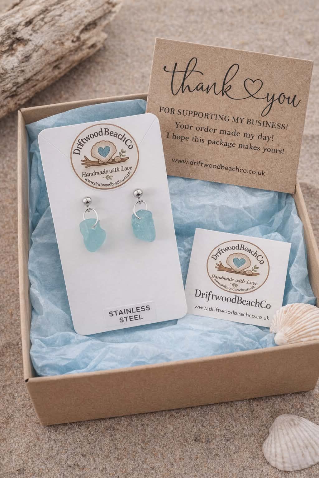 Your earrings will arrive beautifully presented: On a branded DriftwoodBeachCo jewellery card Wrapped in baby blue tissue paper Boxed in a brown cardboard gift box Includes a thank you card and business card Perfect for gifting or treating yourself :