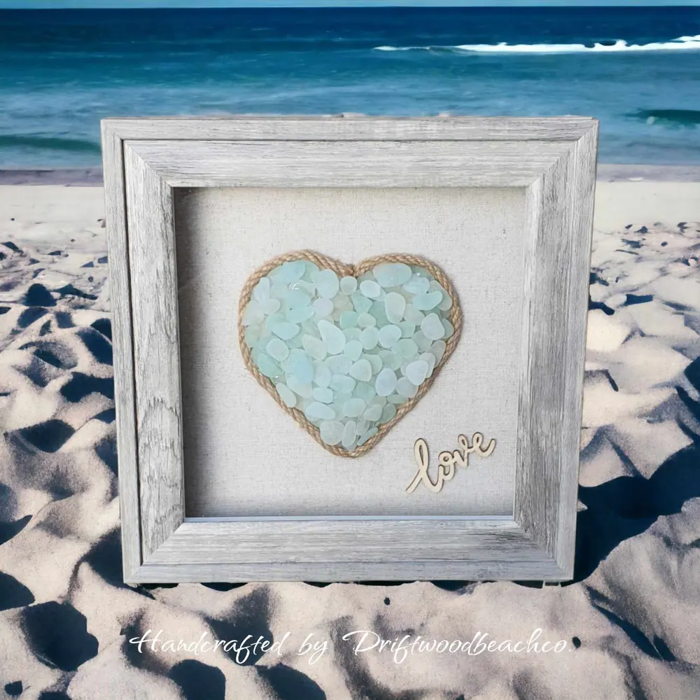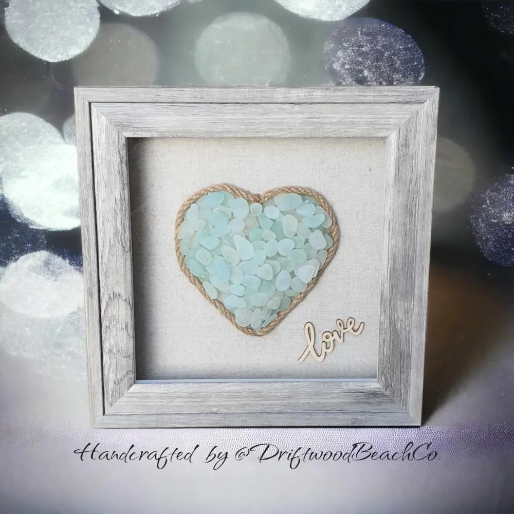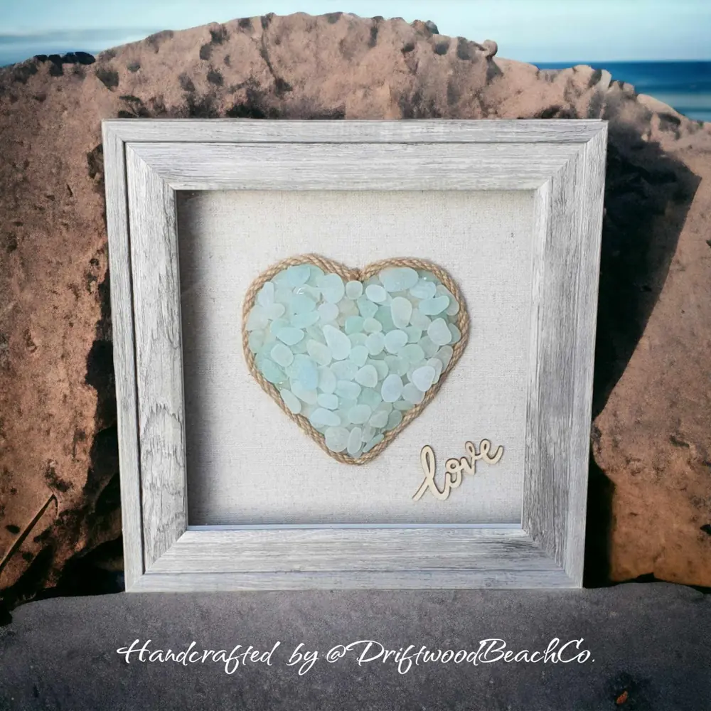 Immerse yourself in the tranquil beauty of our Sea Glass Heart Wall Art. Handcrafted with care, each piece features a stunning combination of frosty white and sea foam green sea glass formed into a heart shape, nestled within a 9″ x 9″ x 1.7″ grey washed boxed frame. The delicate hemp rope surrounding the heart adds a touch of coastal charm, while a wooden laser-cut “Love” sign at the bottom corner infuses the piece with warmth and affection. Made from sustainable materials, this wall art is not only a captivating decorative accent but also a symbol of mindful living and appreciation for nature’s gifts.