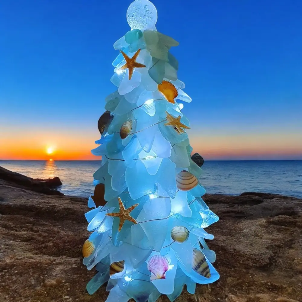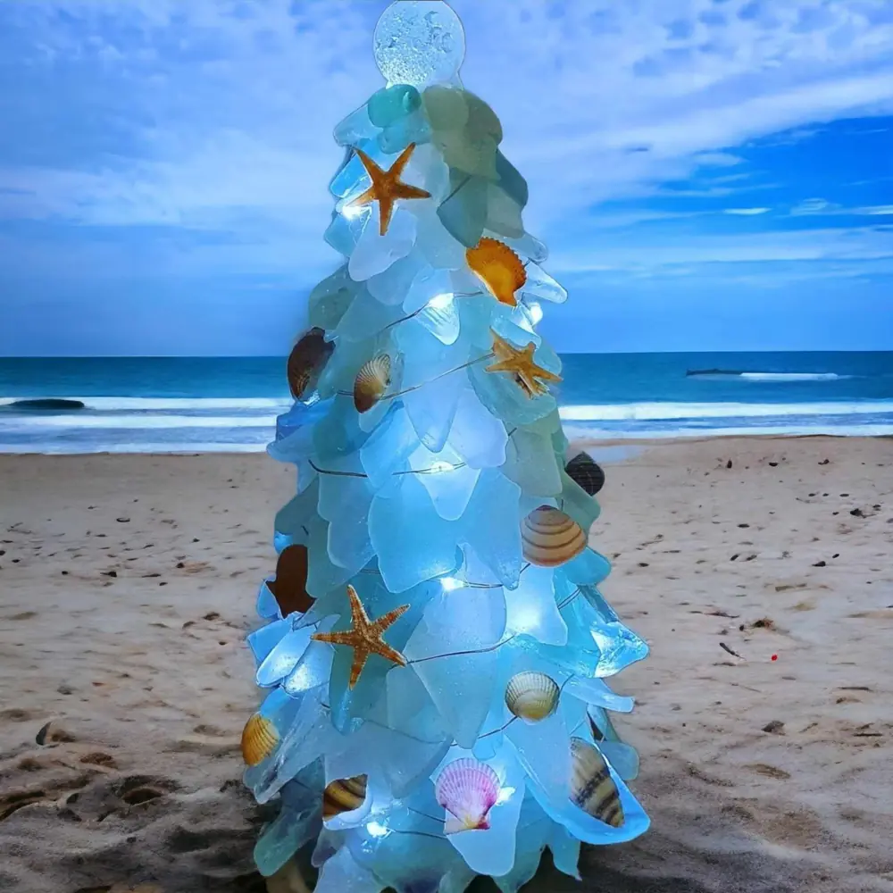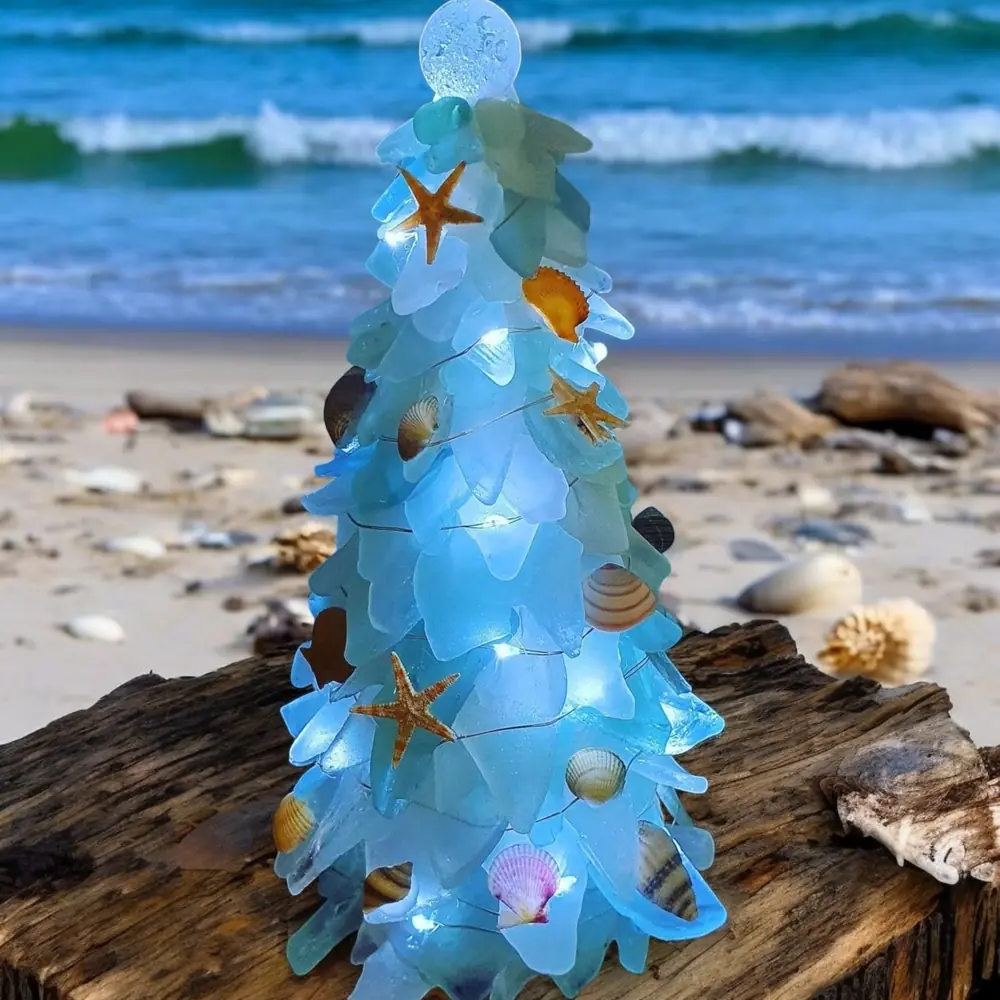 8″ Sea glass Tree made using Sea foam Green, Frosty White and Ice Aqua Sea glass with LED battery Lights& decorated with seashells and a frosty sea glass marble topper.
