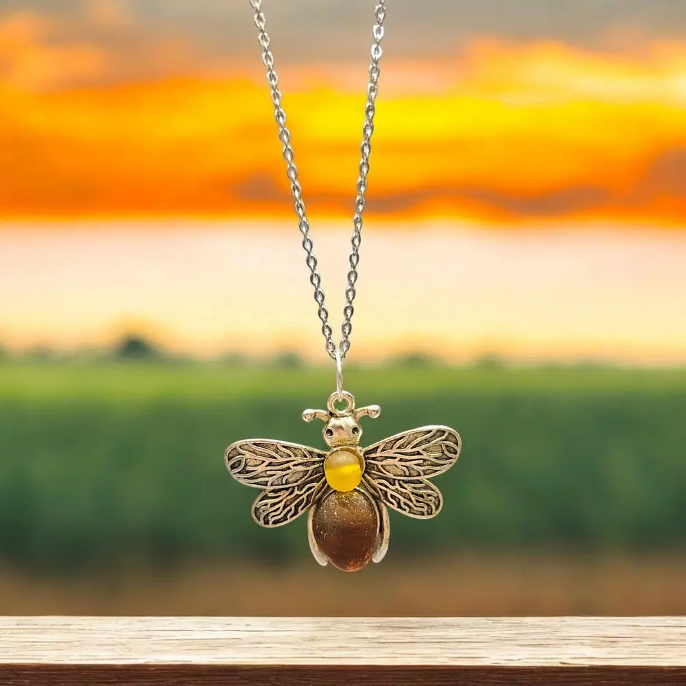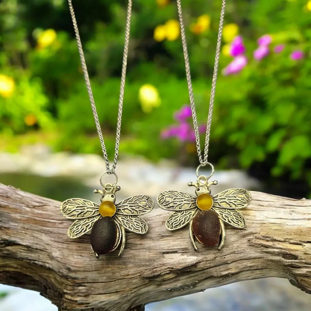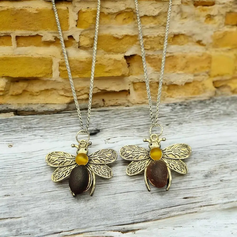 Add a touch of coastal charm to your jewellery collection with this beautifully handcrafted Seaglass Bee Necklace. The bee pendant is an eye-catching blend of nature and craftsmanship, featuring: