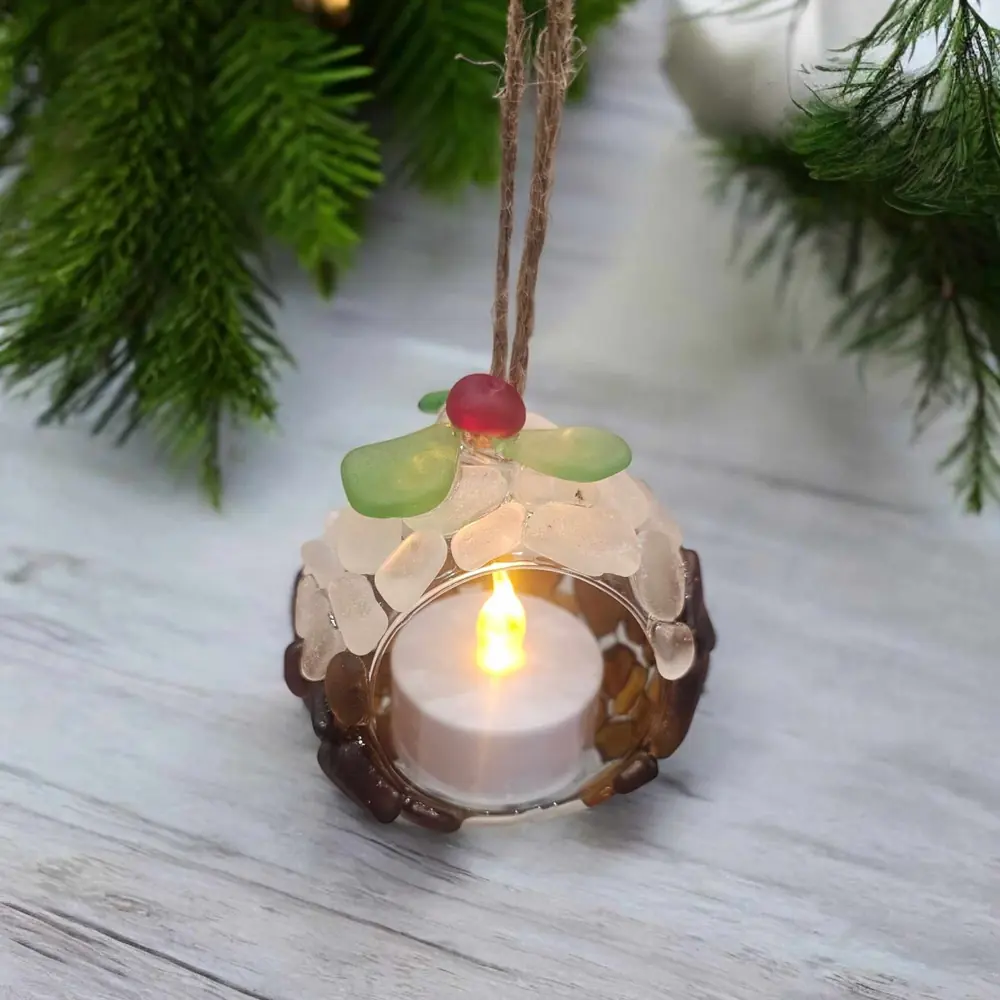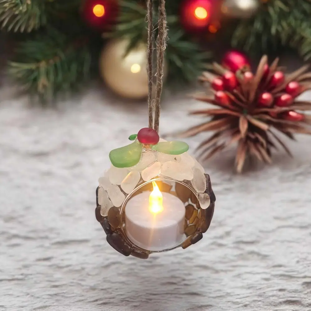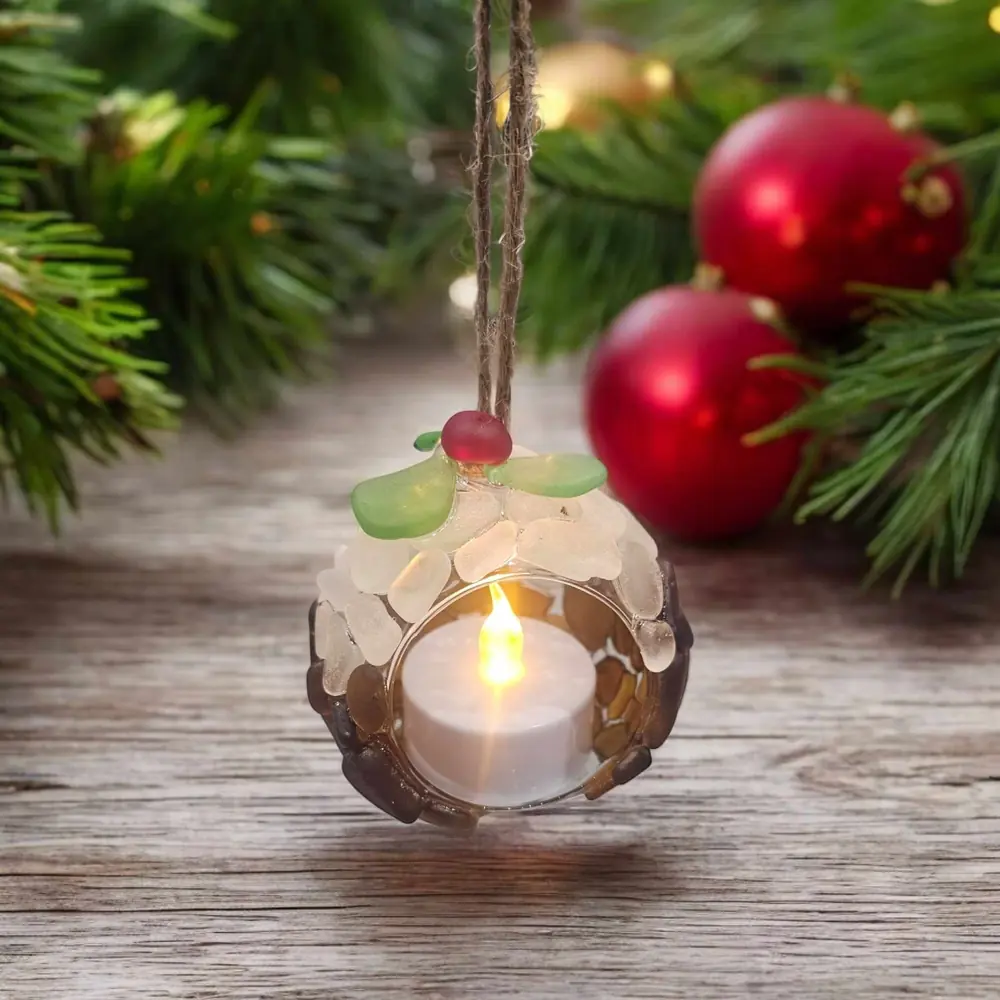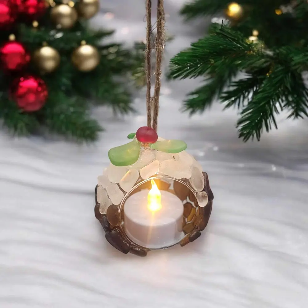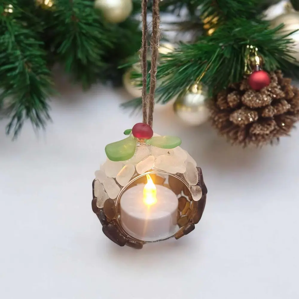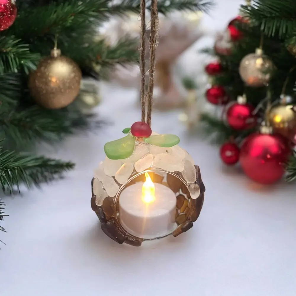 Bring a hint of coastal charm to your festive season with this enchanting Seaglass Christmas Pudding T-light Candle Holder. Beautifully crafted from sustainably sourced seaglass, lovingly beachcombed from the Kent Coast, this unique ornament offers a delightful blend of tradition and seaside elegance.