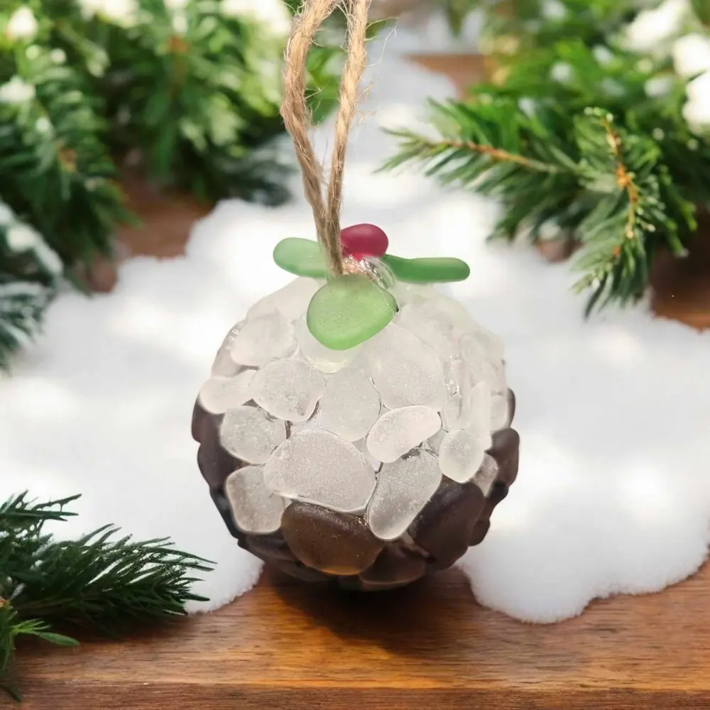 Handmade Materials: Crafted from frosty white, brown, and green seaglass, accented with a striking red seaglass bead, evoking the classic Christmas pudding style.