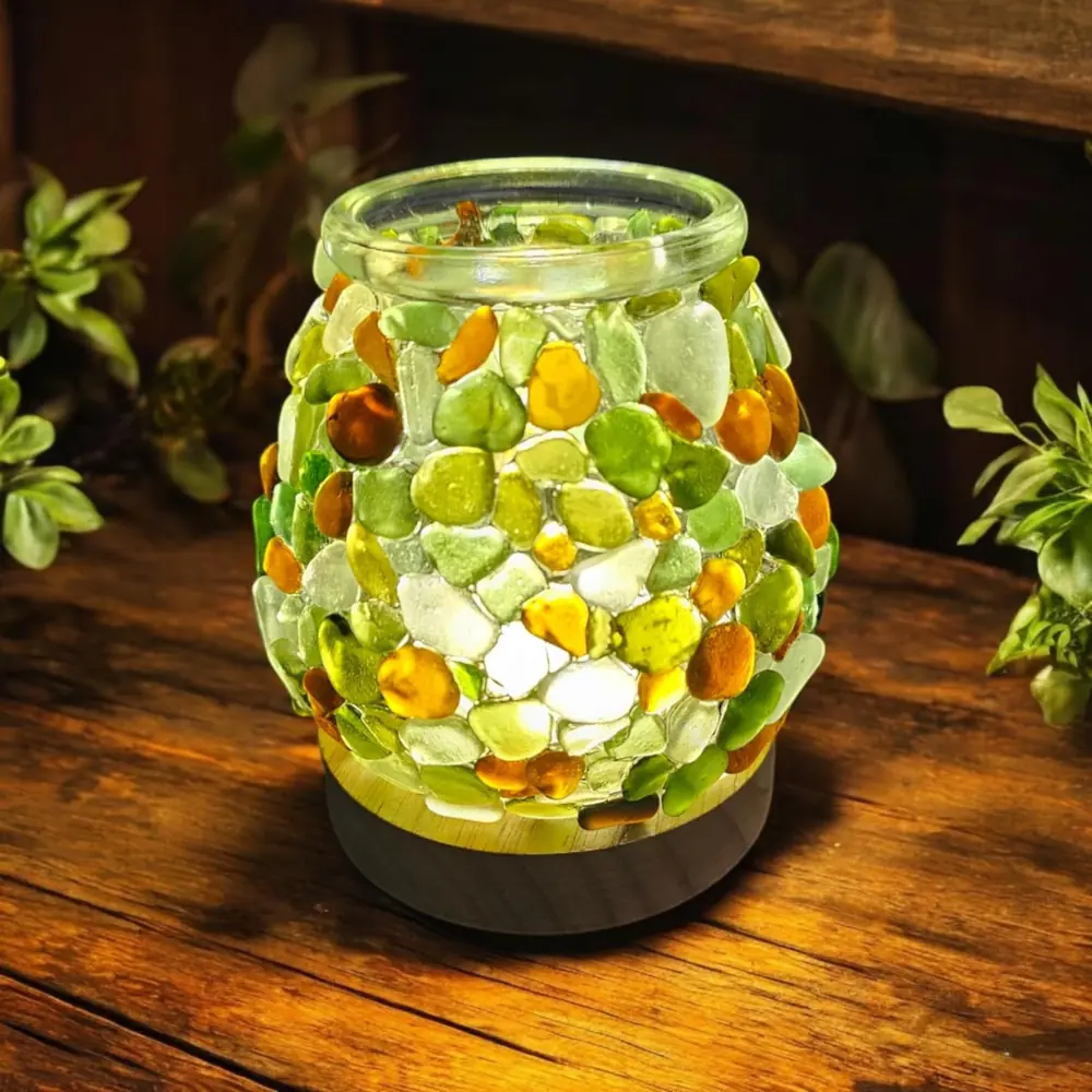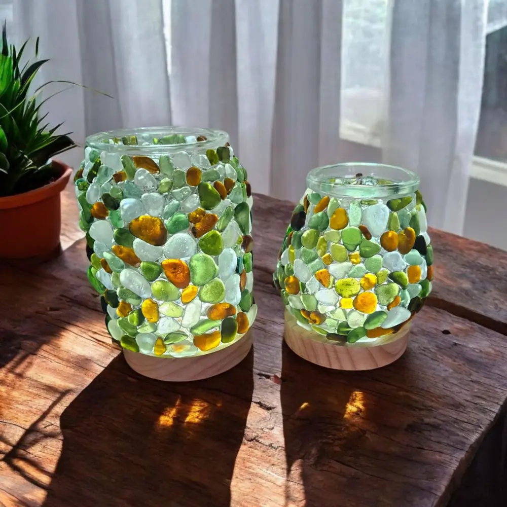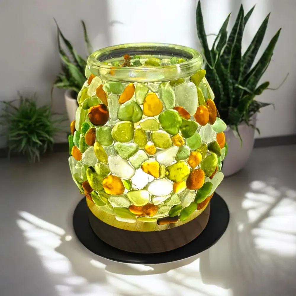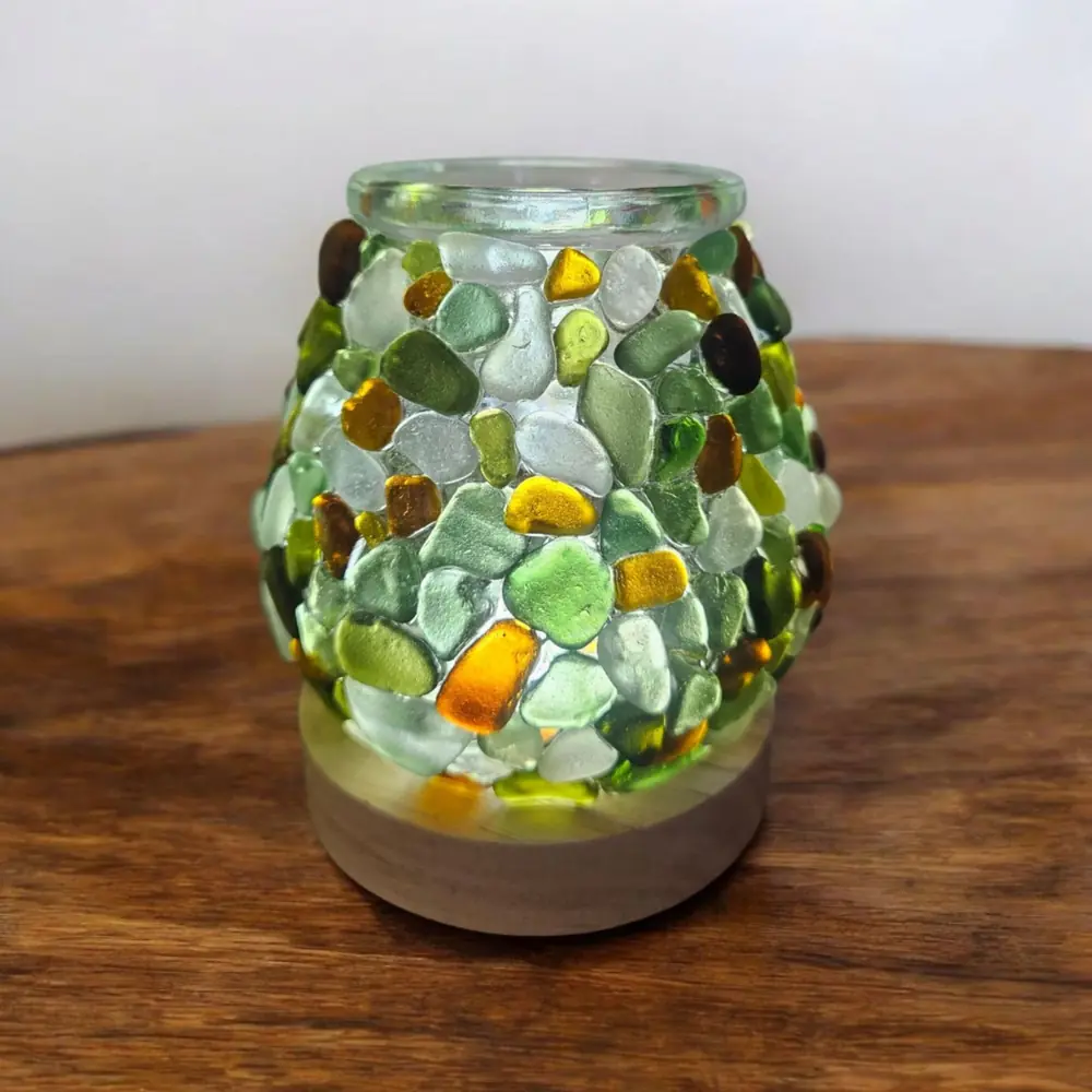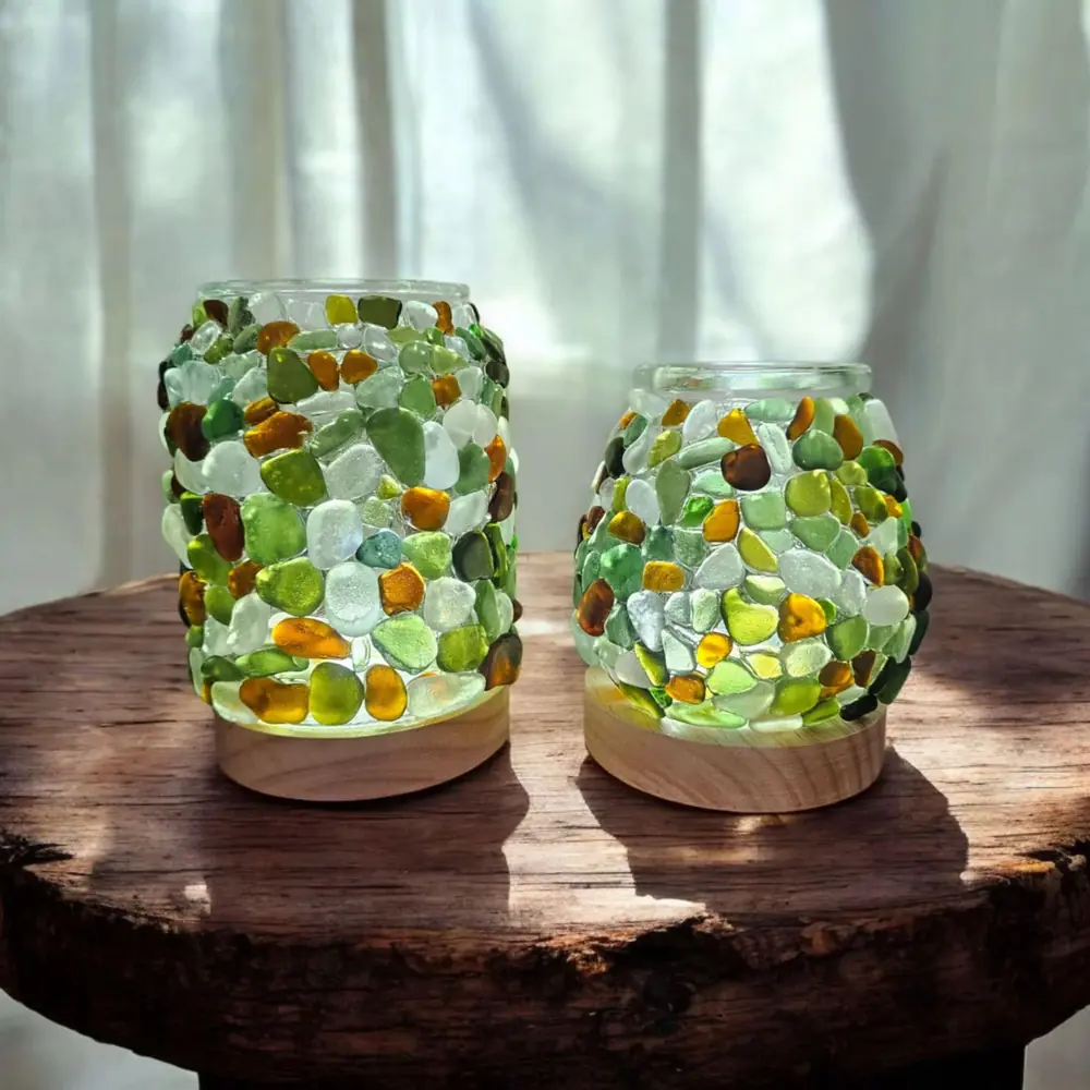 Each piece of sea glass has been carefully selected, cleaned, and arranged onto an upcycled glass jar, then mounted on a sturdy LED lamp base with a USB connection – making it both eco-friendly and functional.