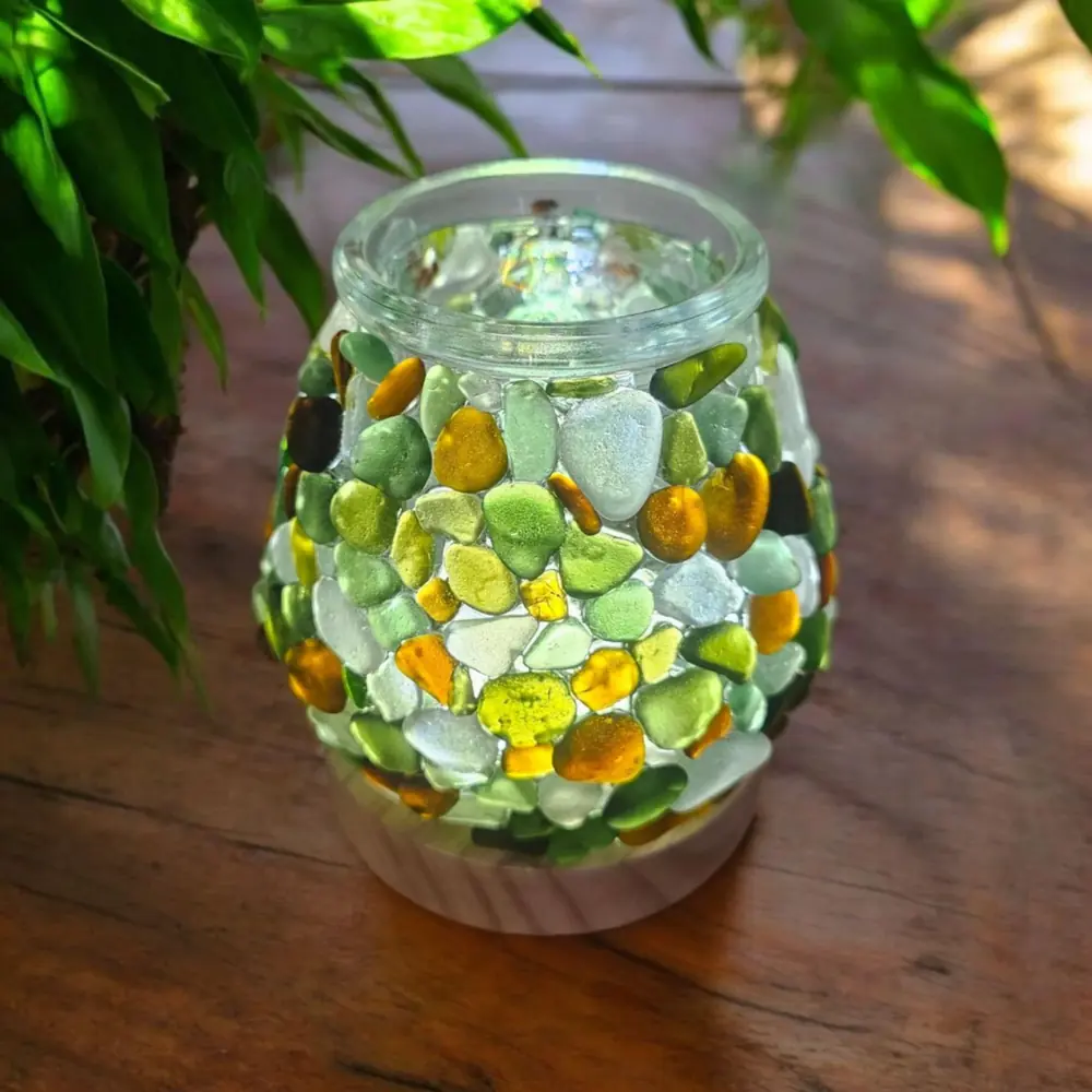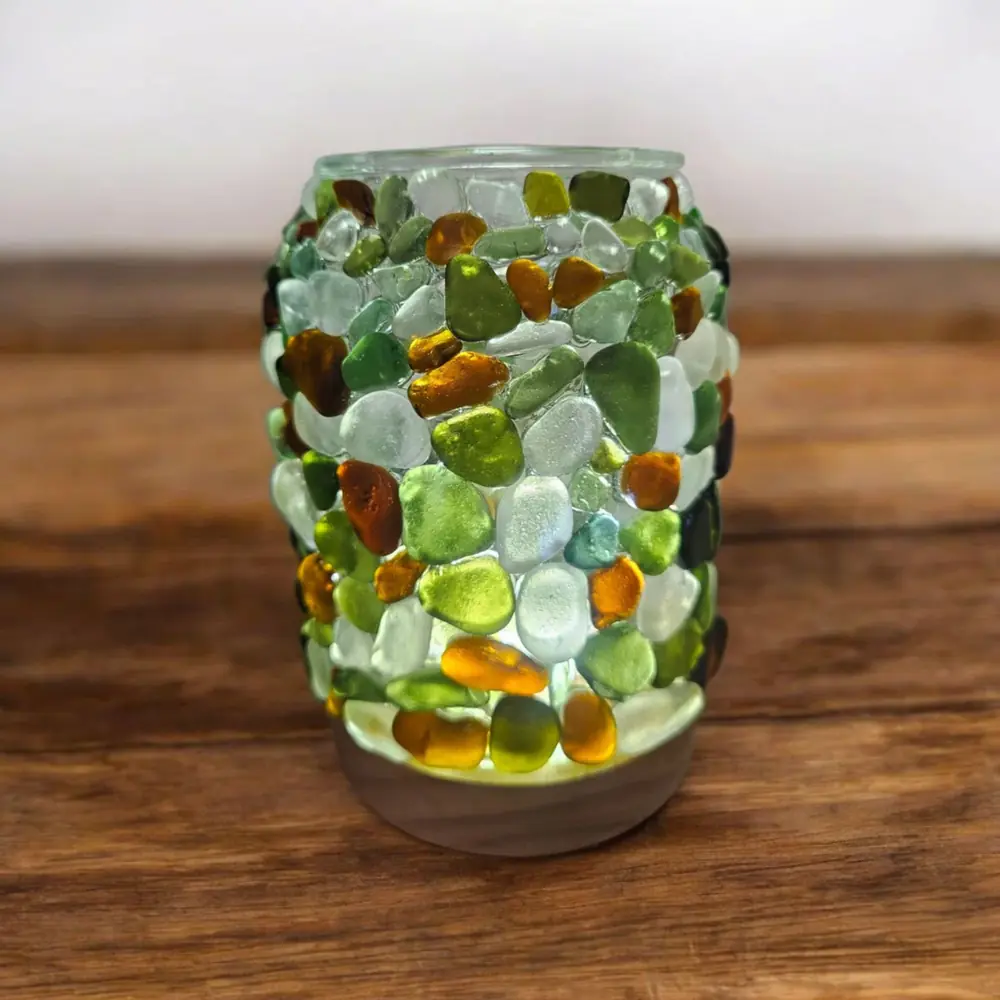 Covered in perfectly smooth sea glass in beautiful shades of green, frosty white, and warm brown
