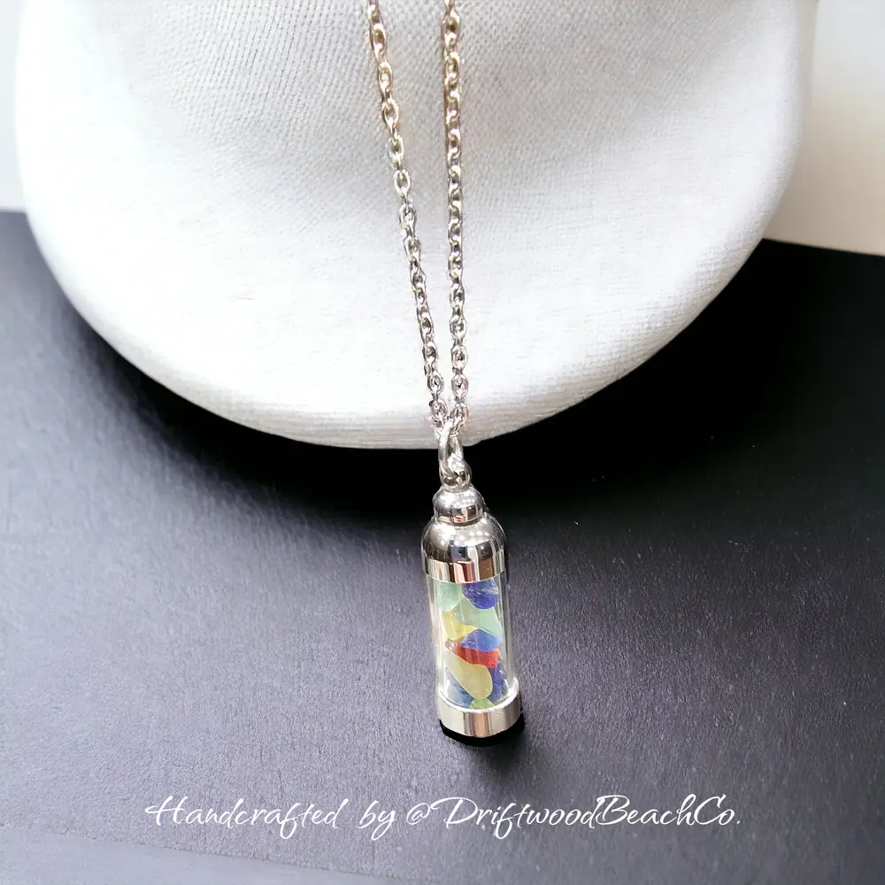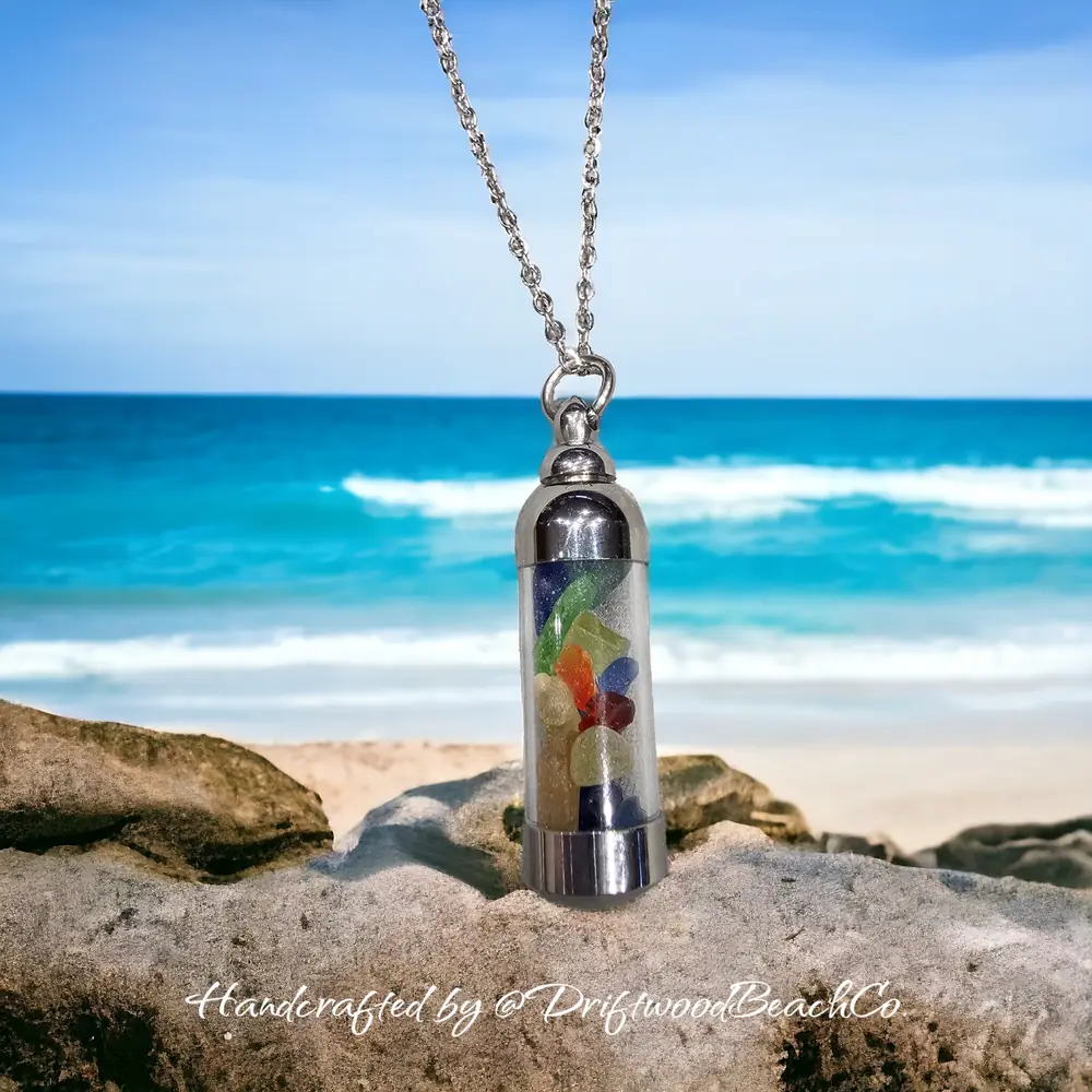 4.5cm capsule filled with tiny pieces of coloured seaglass beachcombed from the beaches on the Kent Coast.