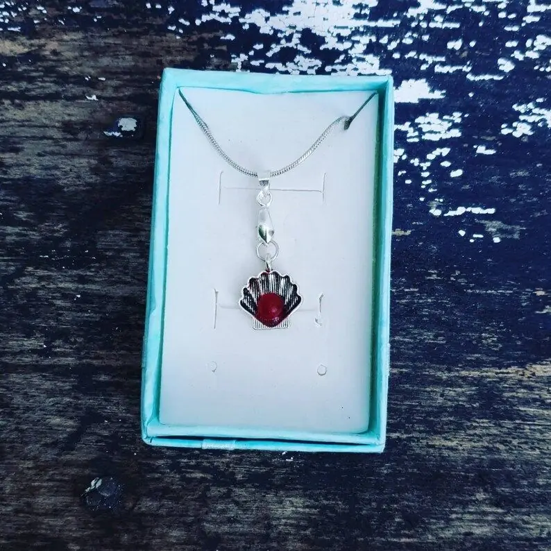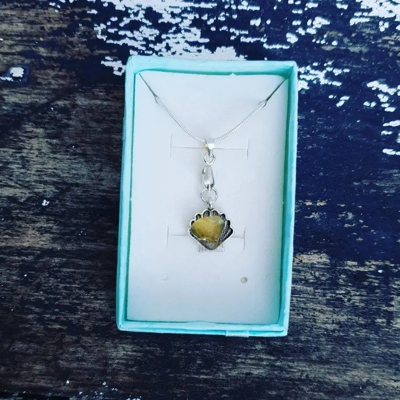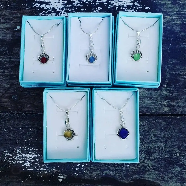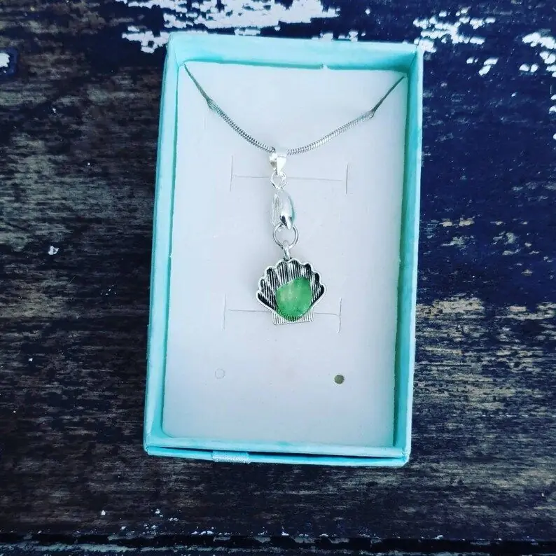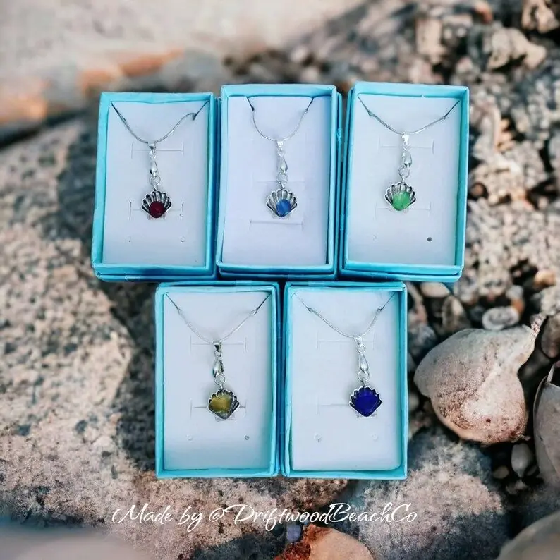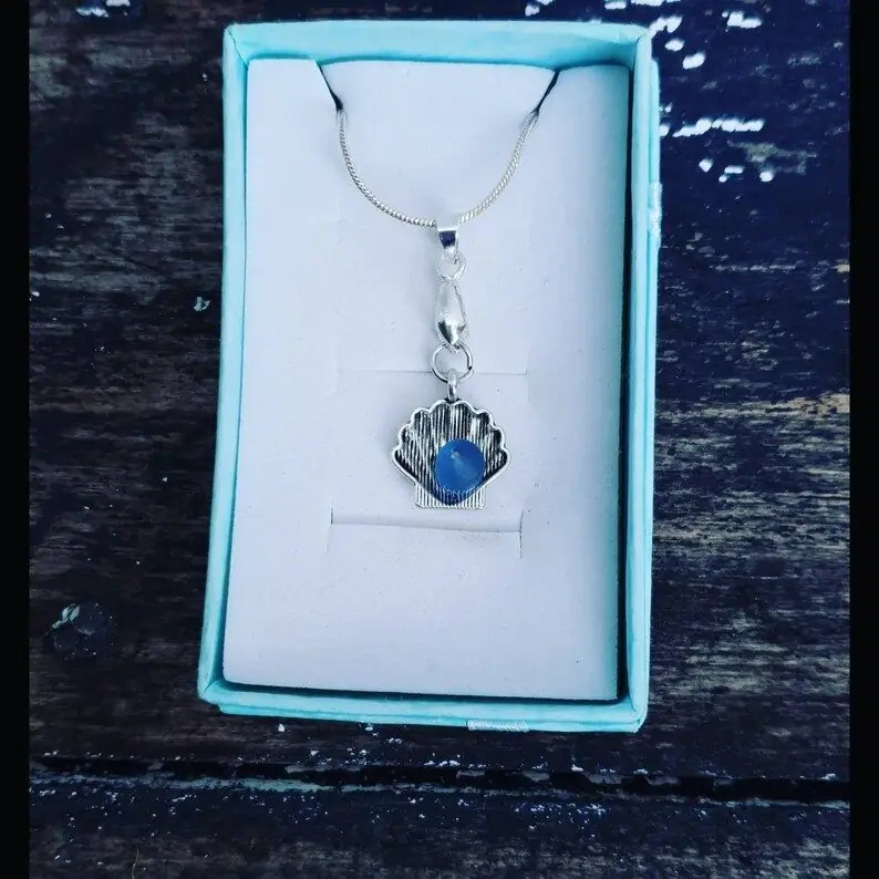 Tibetan silver Scallop Shell charm with a choice of coloured sea glass. 22″ 925 Sterling Silver Plated Snake chain with lobster clasp and 925 Sterling Silver Plated Bail Each piece will differ slightly (shade or size, shape of sea glass) but the design will be the same…
