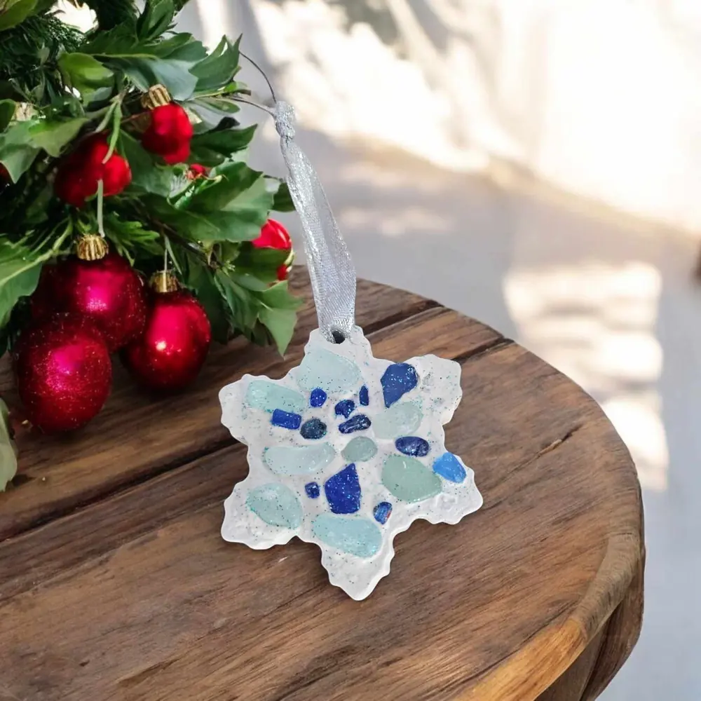 Snowflake: Adorned with calming blue seaglass, measuring 7.5cm.