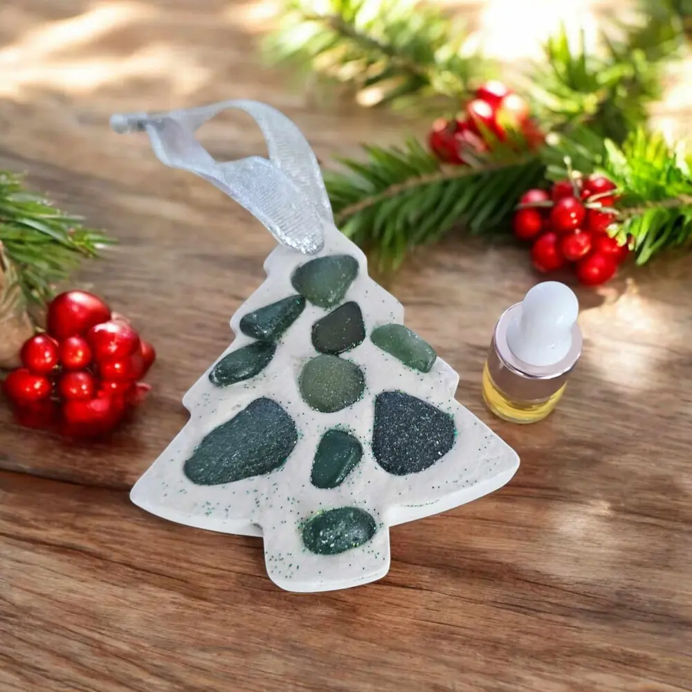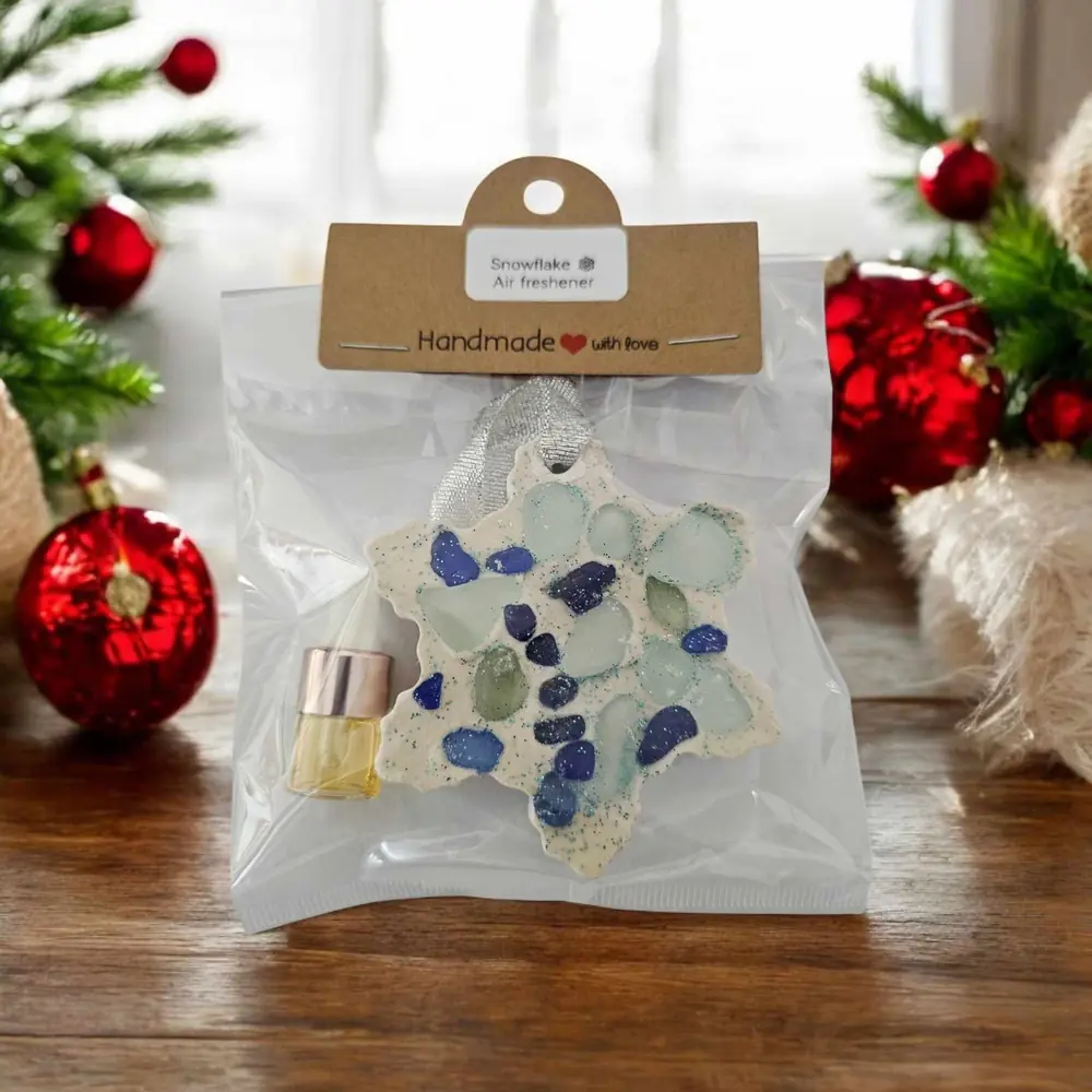 Elevate your festive ambience with our exquisite Scented Seaglass Christmas Tree or Snowflake Air Fresheners. Perfectly handcrafted, these elegant decorations double as air fresheners, offering both beauty and a delightful sensory experience.