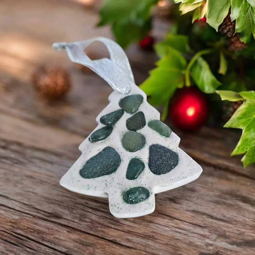 Christmas Tree: Embellished with vibrant green seaglass, measuring 7cm.