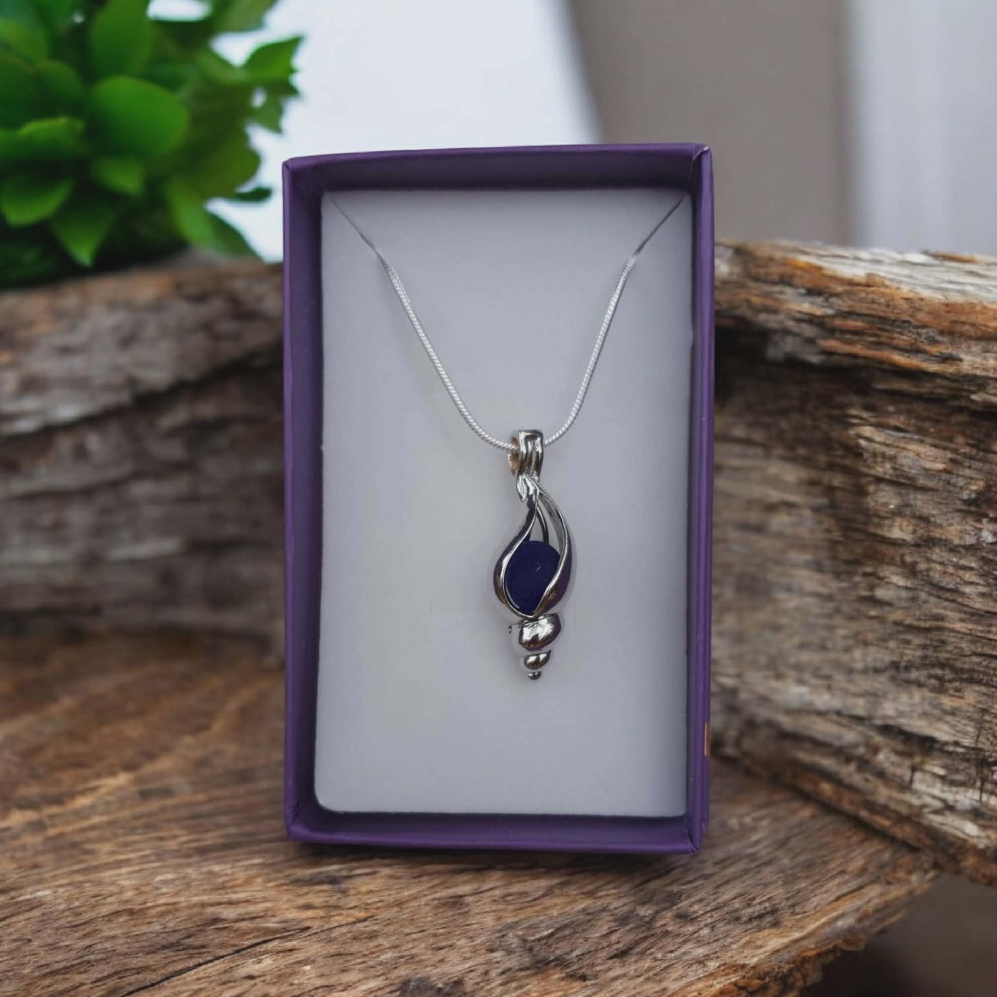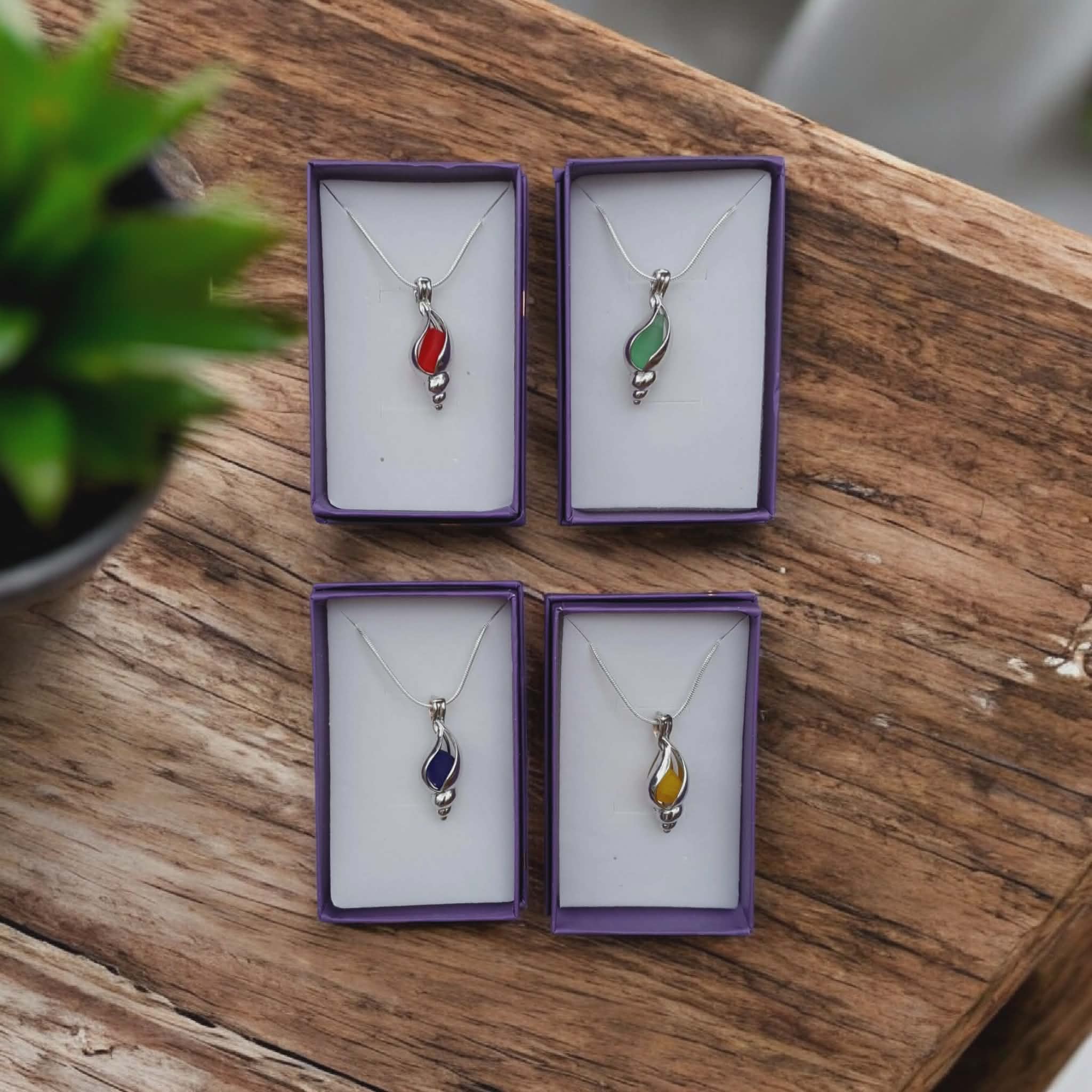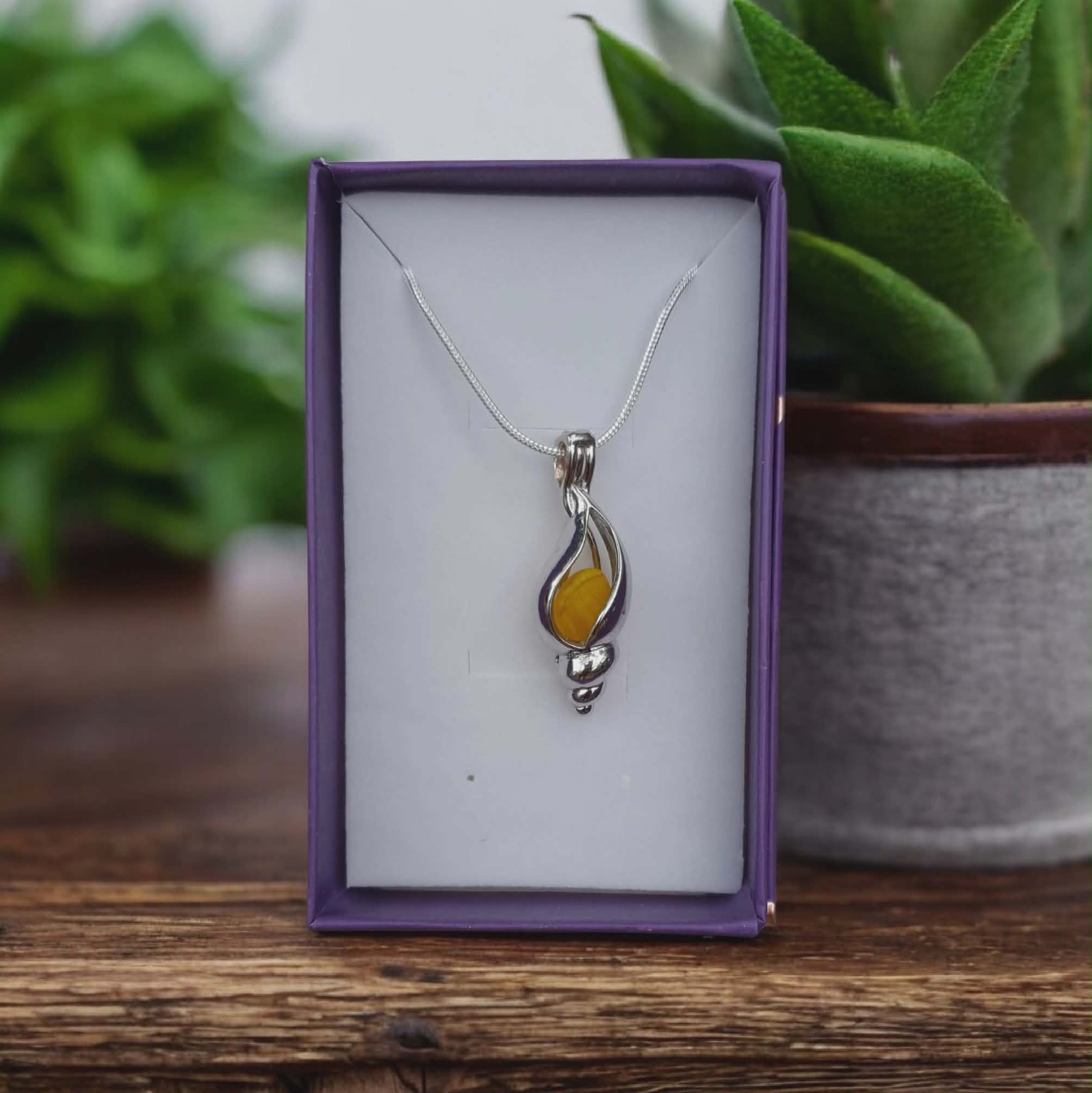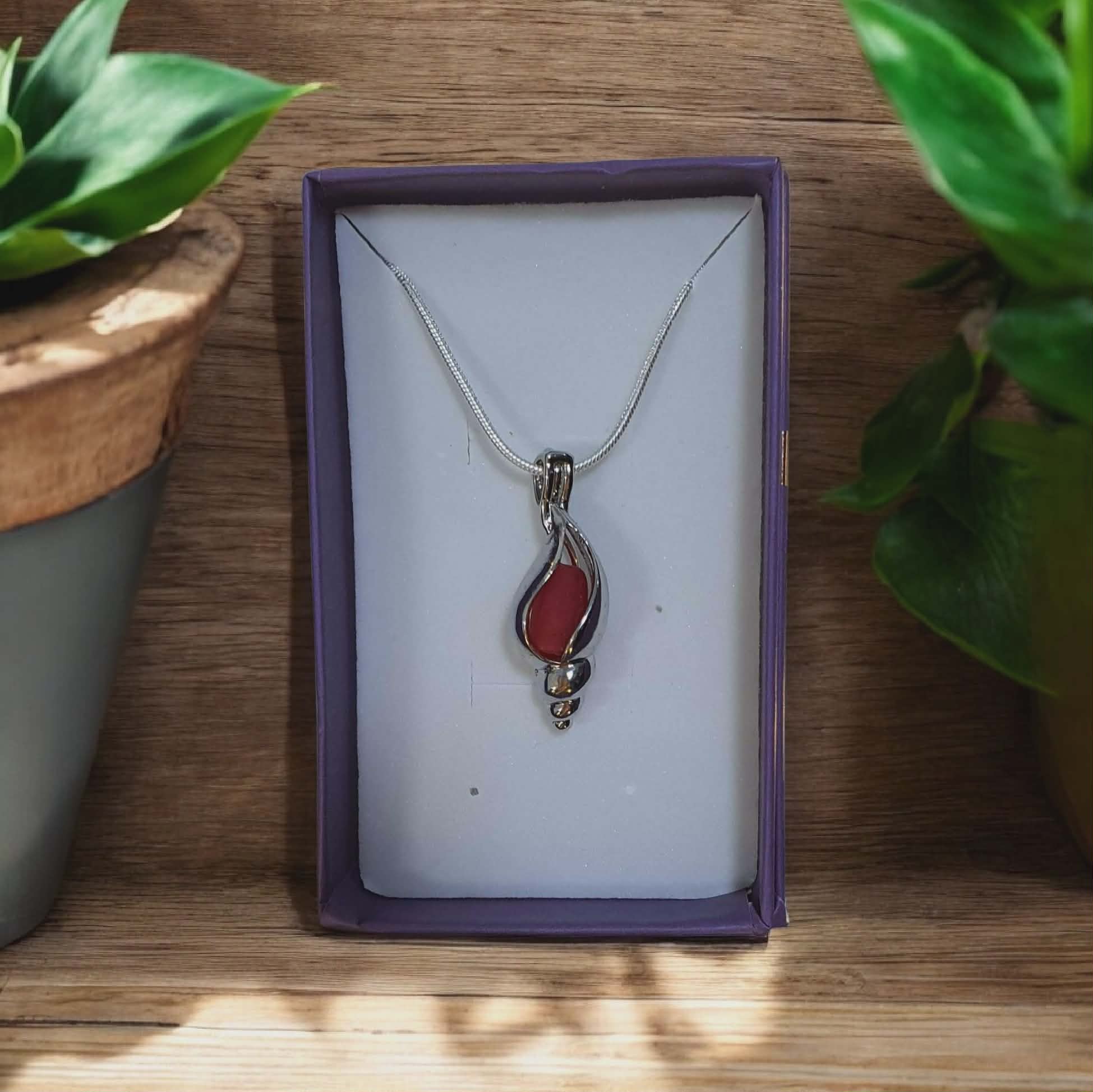 Beautiful Silver plated Conch Shell Cage Locket with a choice of Red, Blue, Green or Yellow Seaglass.